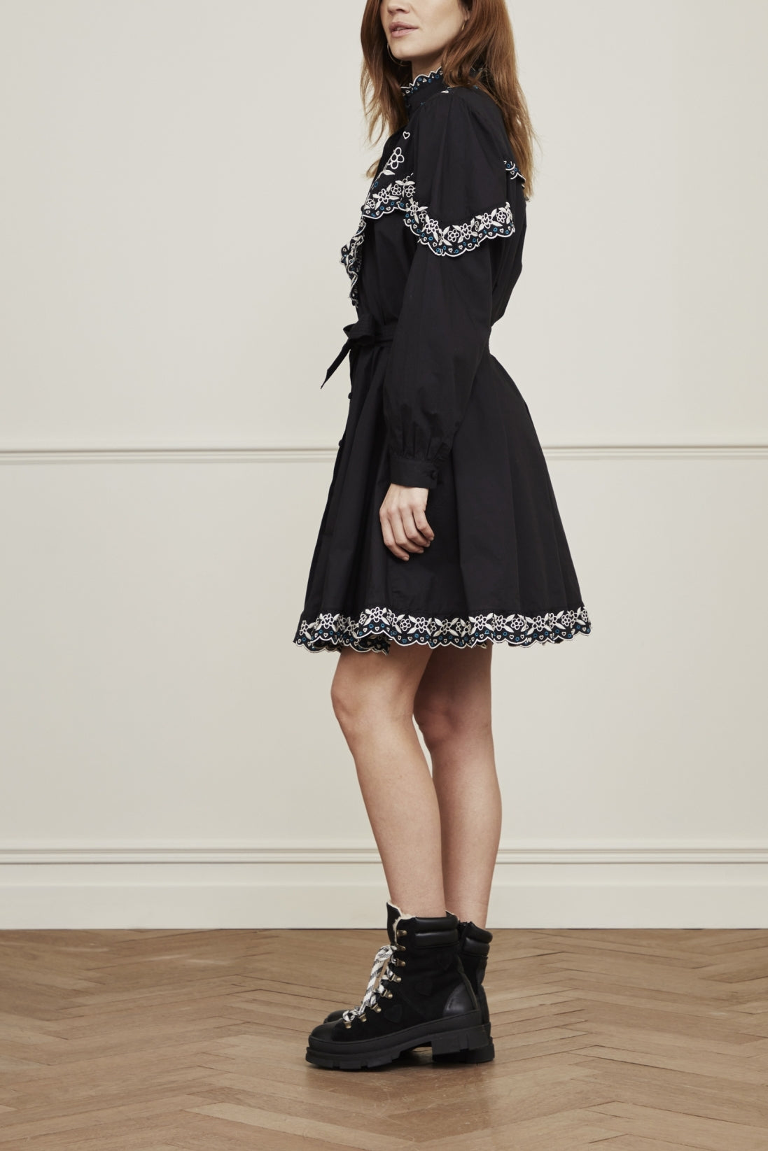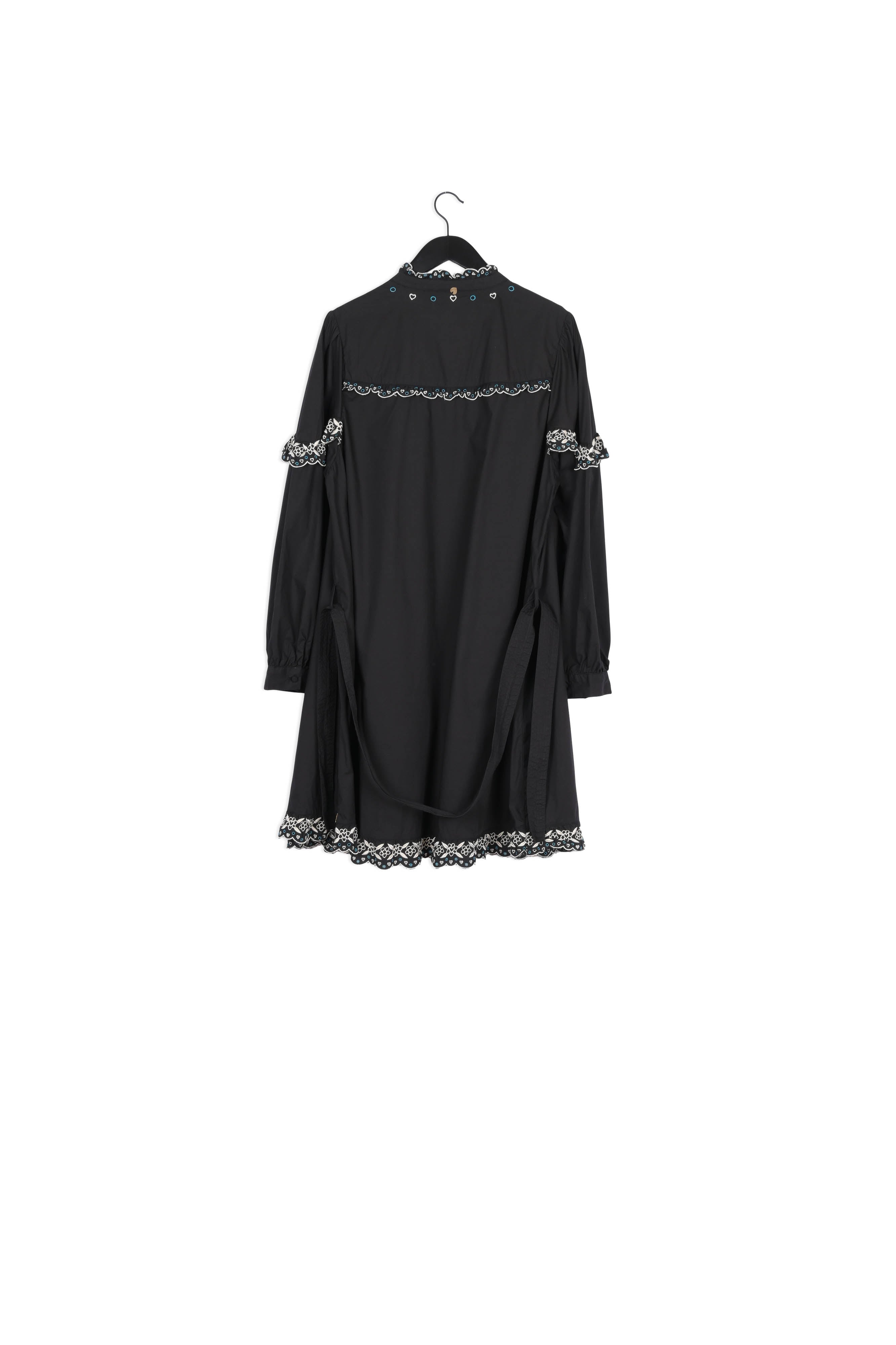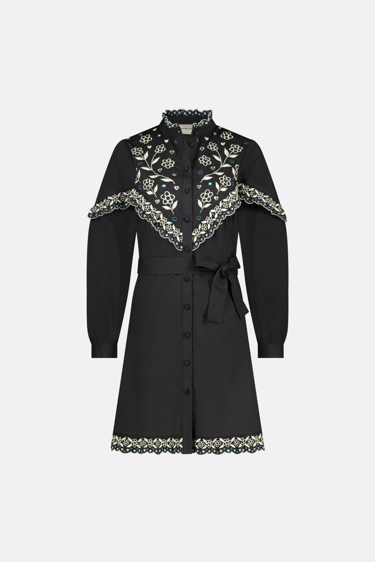 Short dress with fabric button closure and tie belt at the waist. Dailia Dress has balloon sleeves and beautiful openwork details on the collar, chest, sleeves and back. -