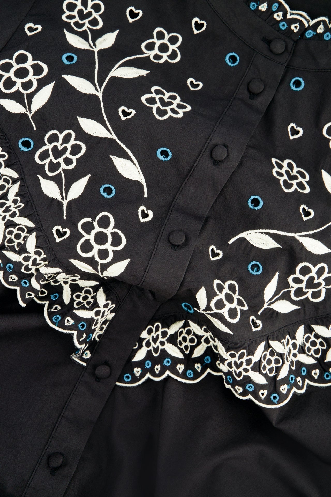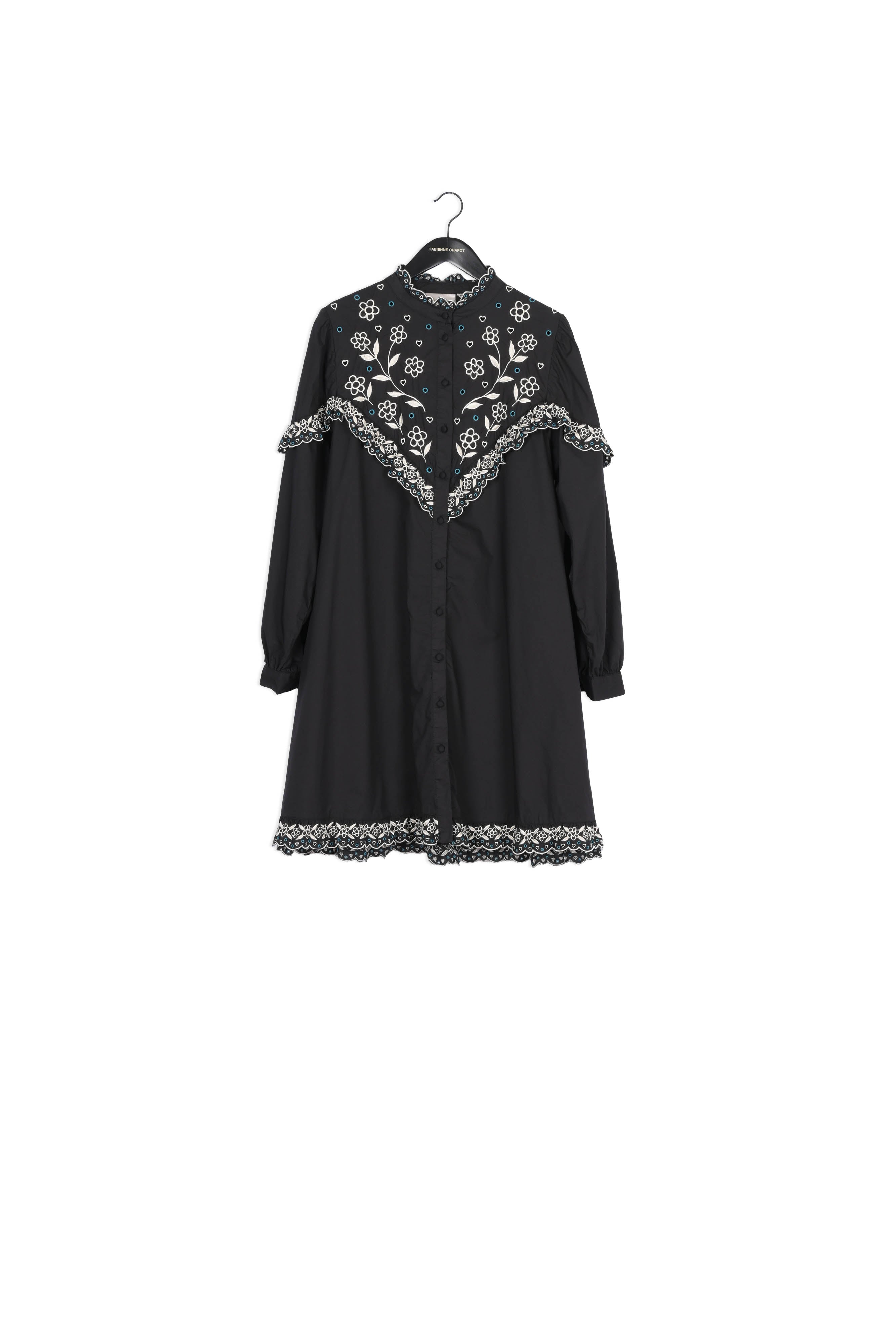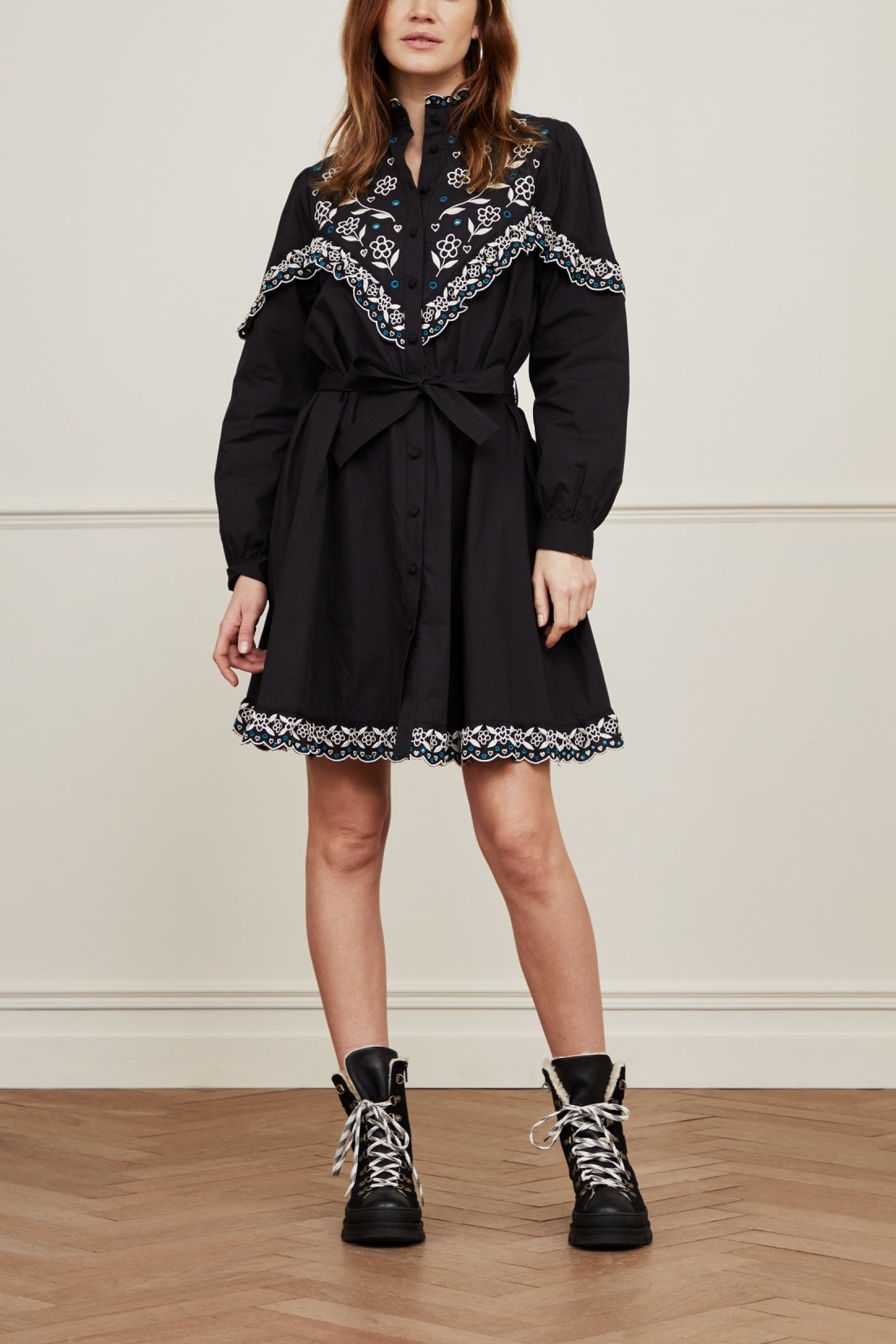 Short dress with fabric button closure and tie belt at the waist. Dailia Dress has balloon sleeves and beautiful openwork details on the collar, chest, sleeves and back. -