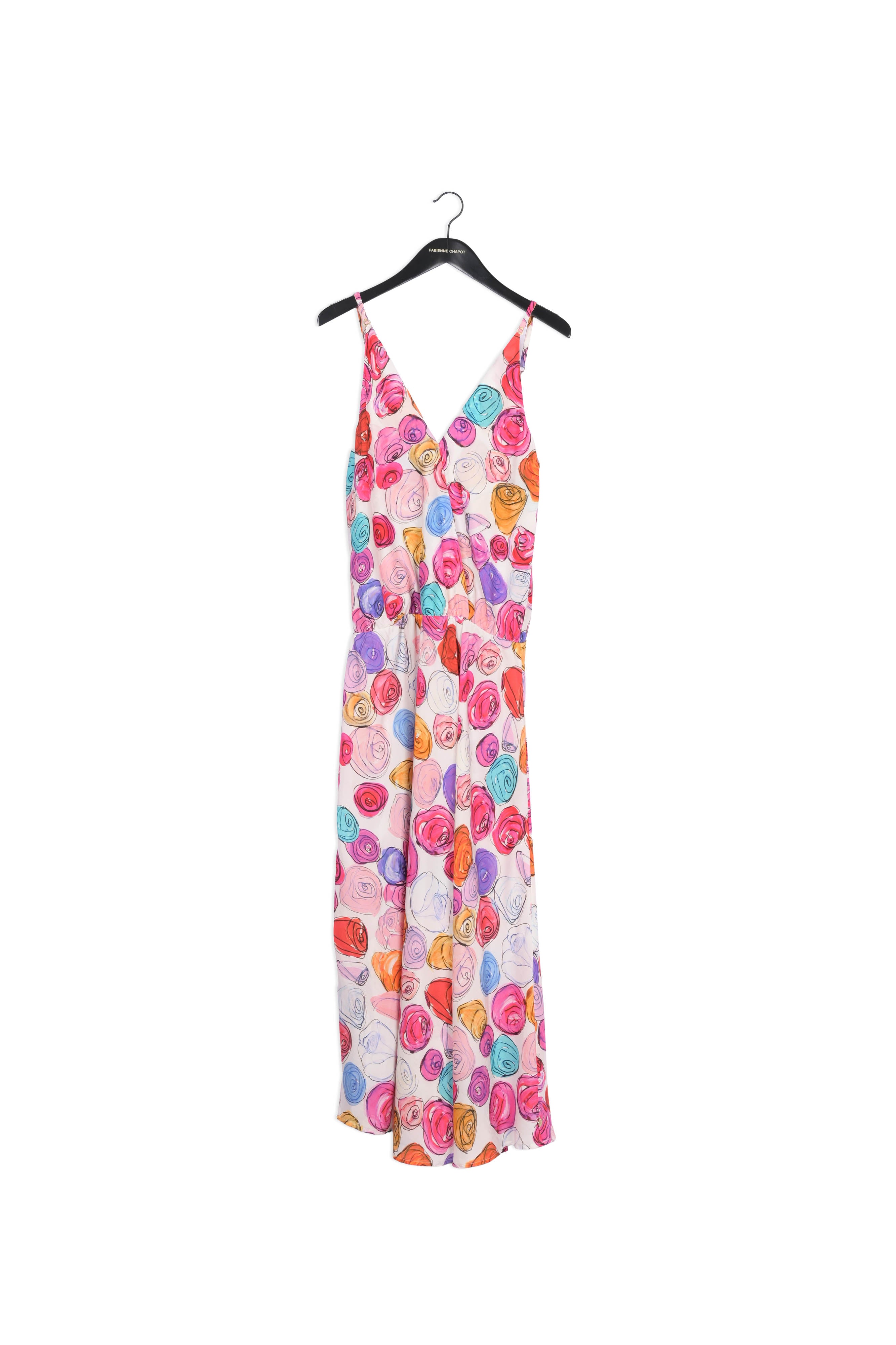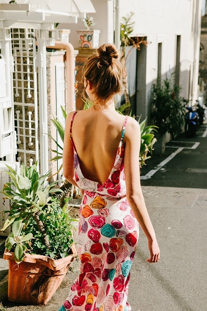 Flowing dress with a V-neck and spaghetti straps. Electra Midi Dress is made from 100% silk.