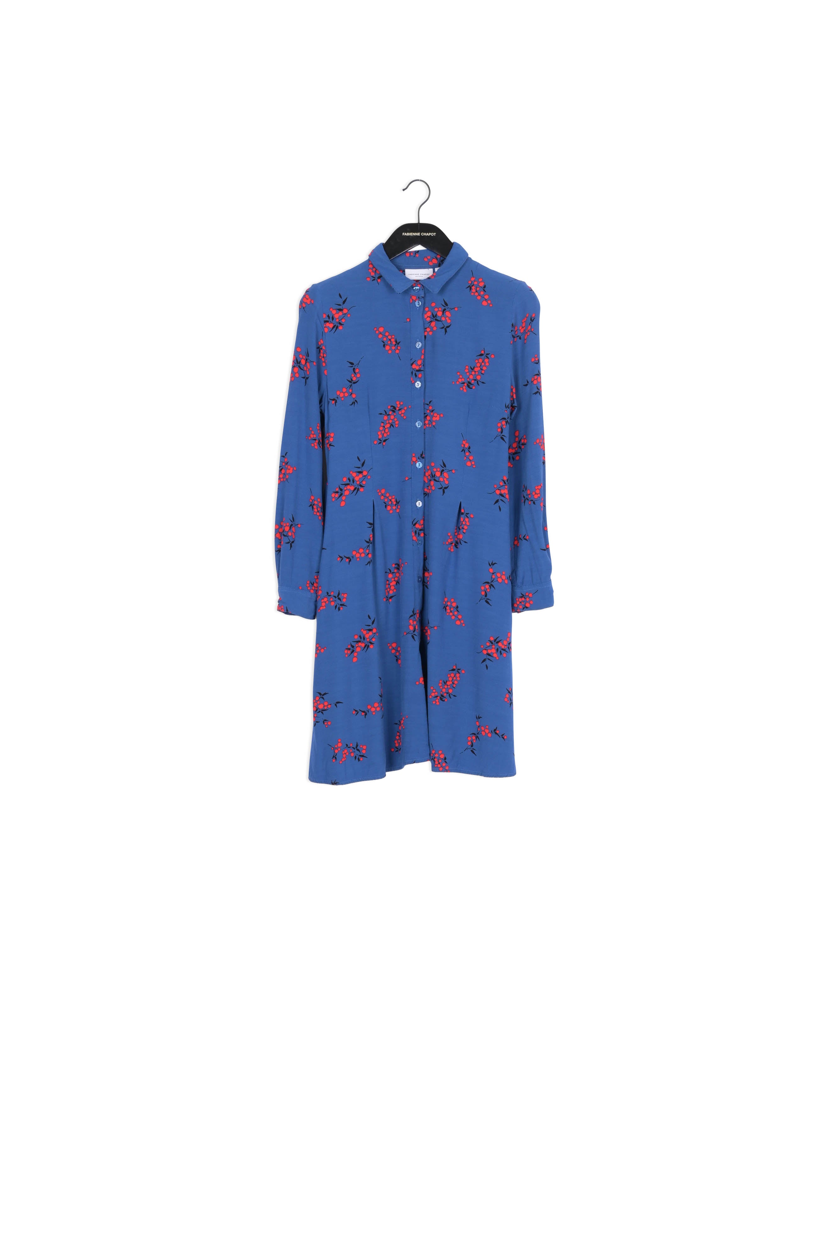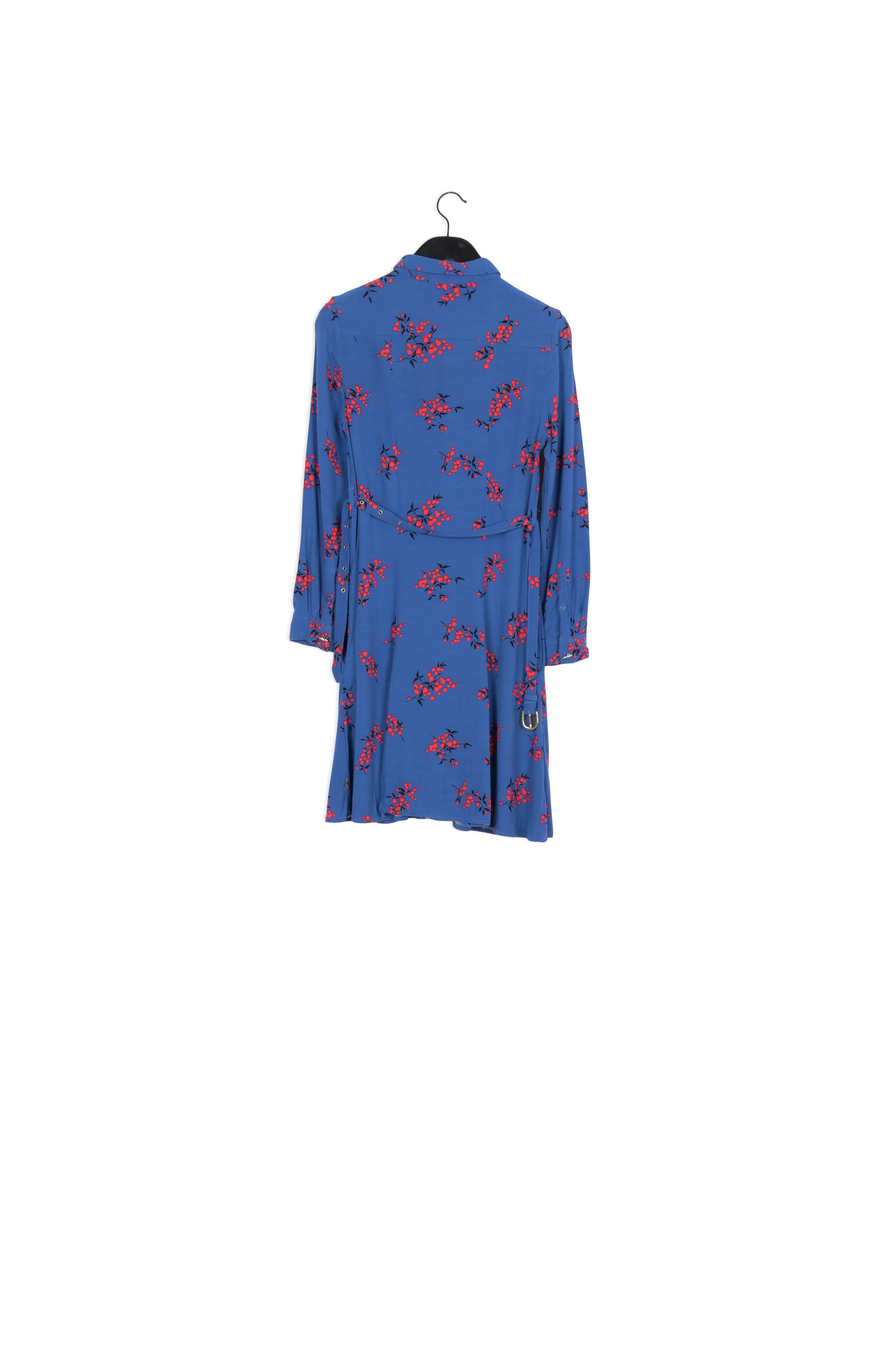 Flowing midi dress with waist belt and long sleeves. Hayley Dress has a button closure down the length of the dress and a gold-coloured button shaped like a koi carp on the cuffs.