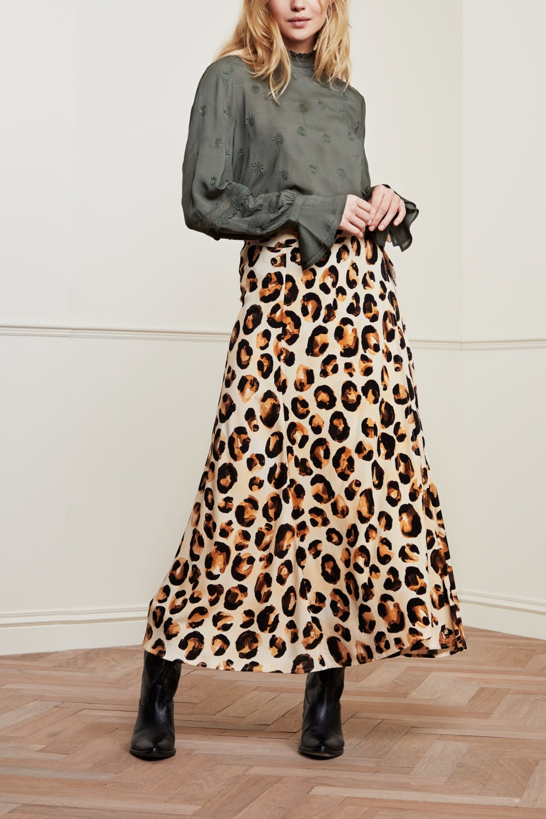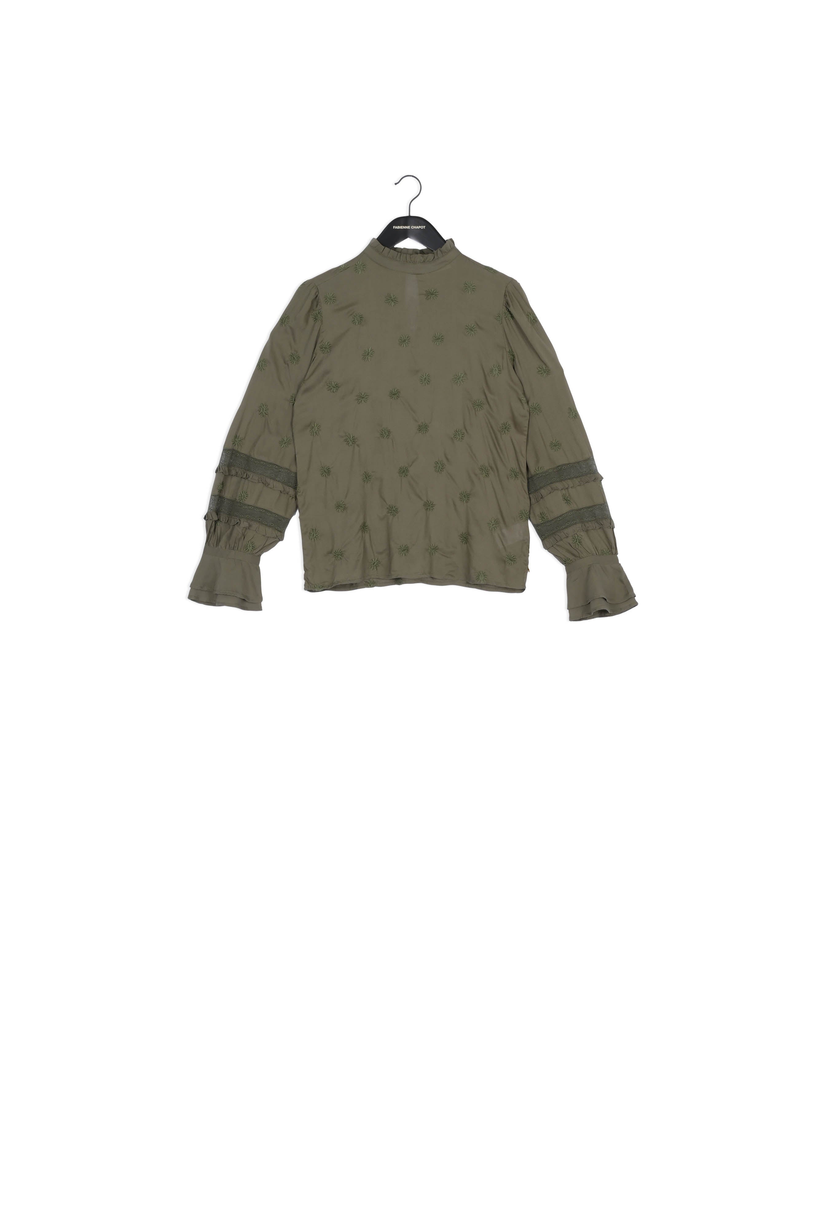 Blouse with high waisted ruffle collar and an embroidered floral print. Leo Top has lace and ruffle details on the sleeves. Note: The colours of the items in the video may vary slightly. -