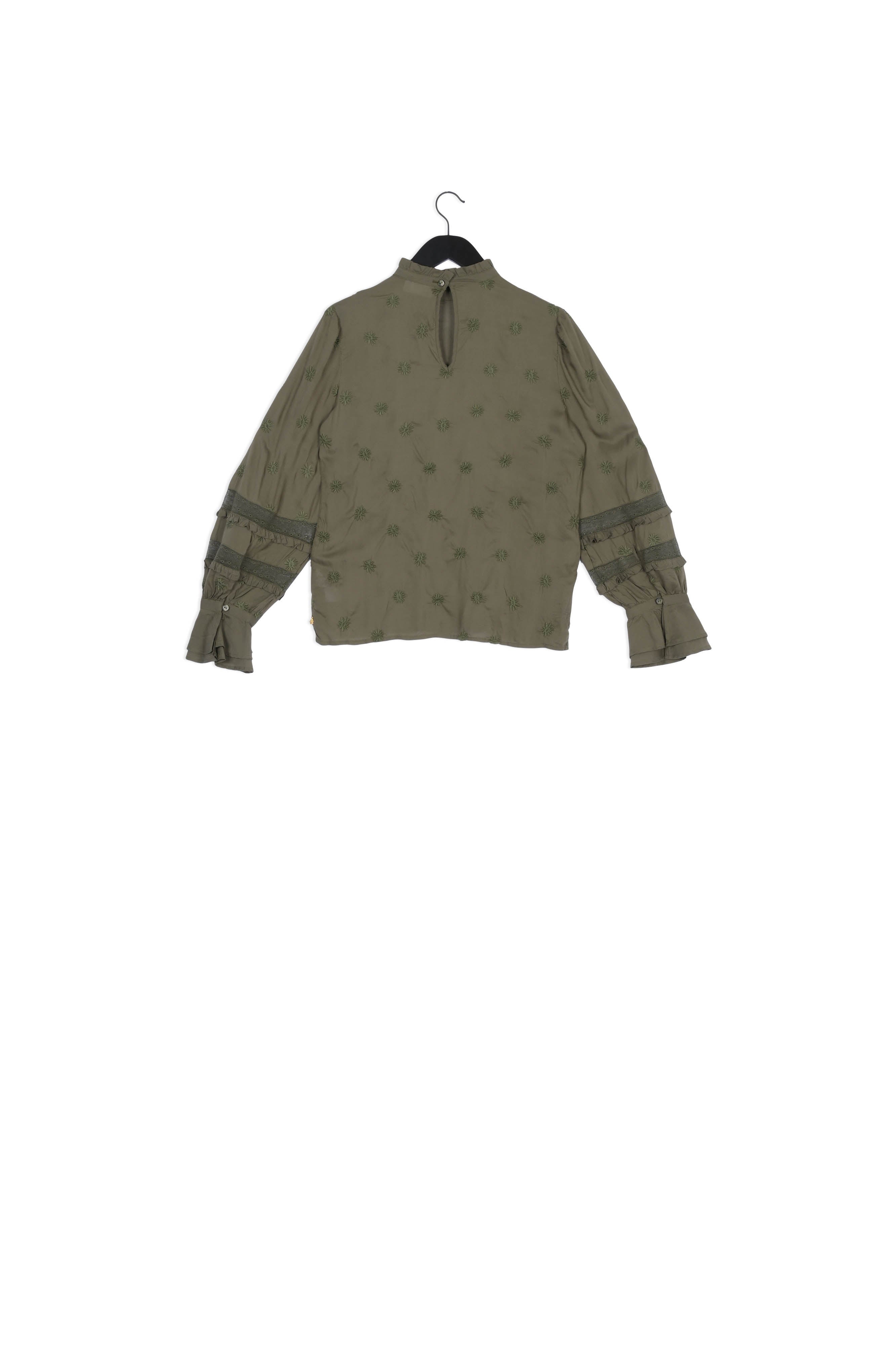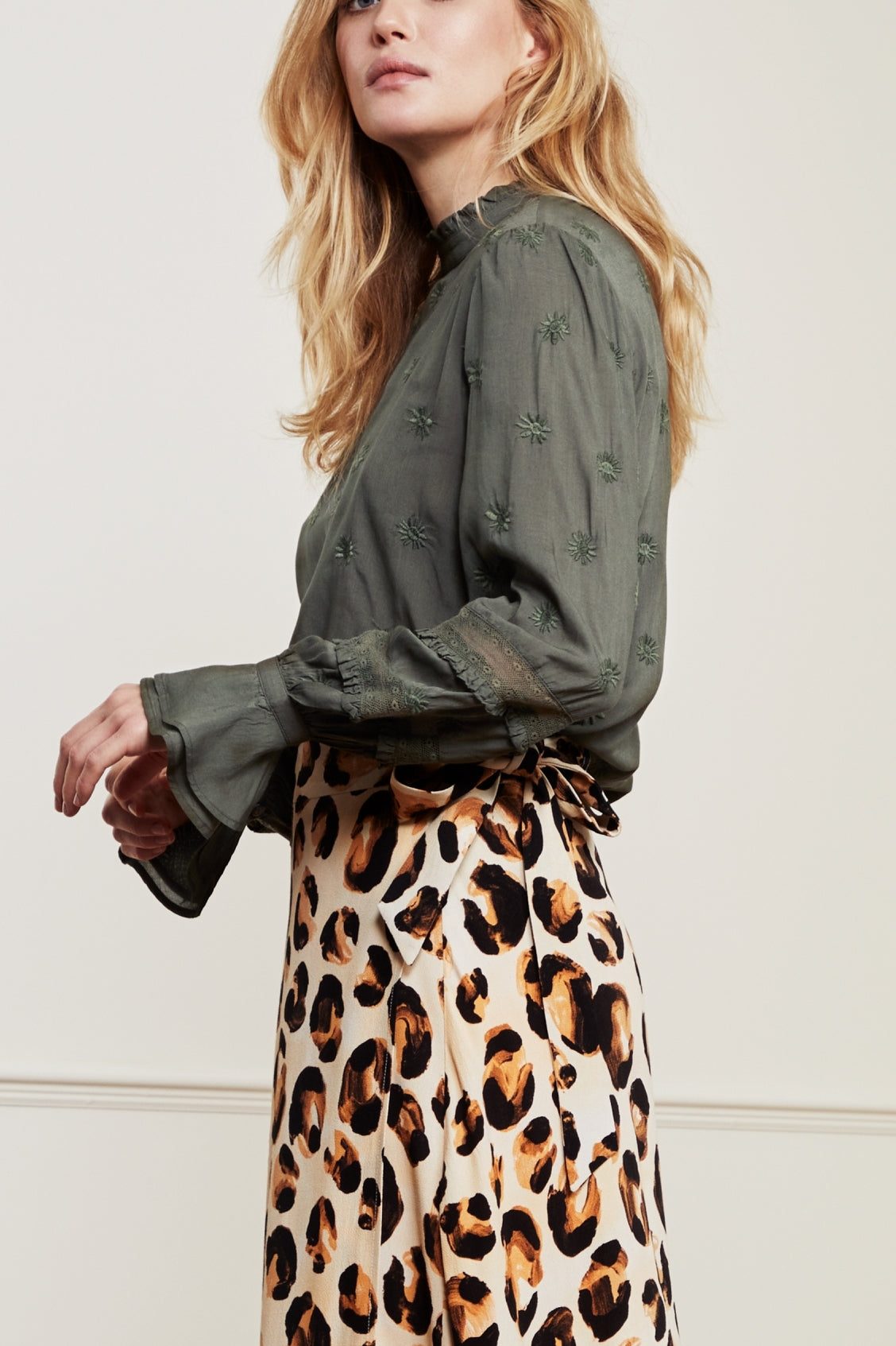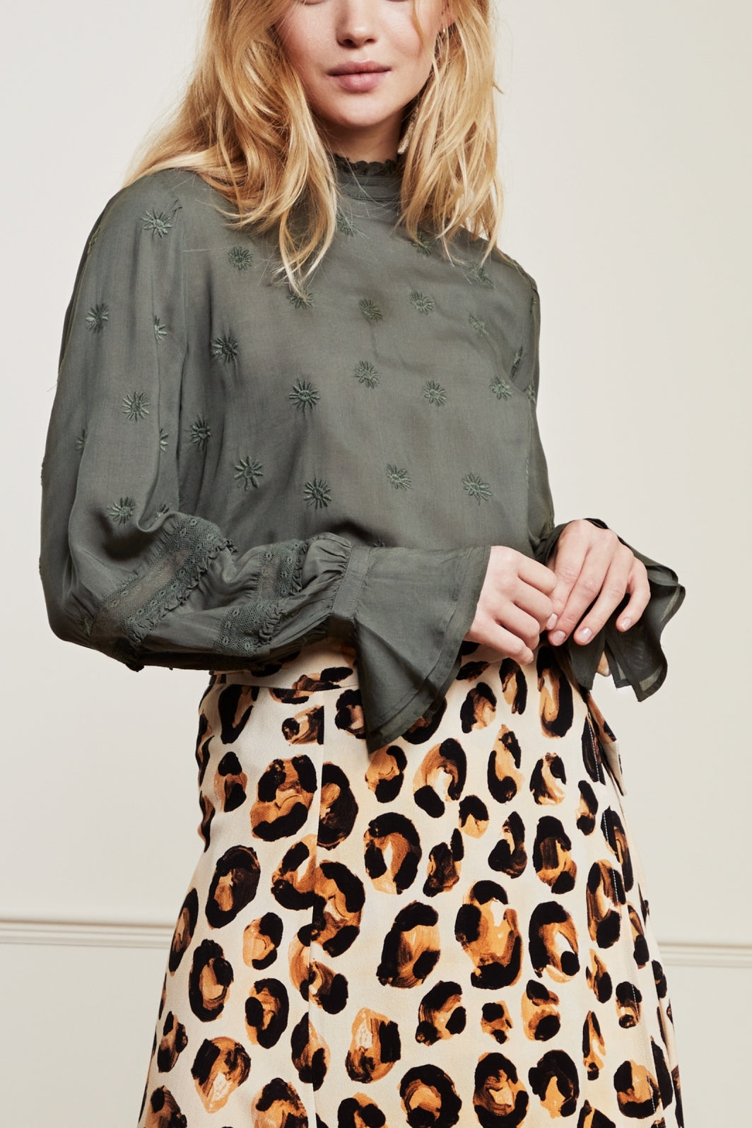 Blouse with high waisted ruffle collar and an embroidered floral print. Leo Top has lace and ruffle details on the sleeves. Note: The colours of the items in the video may vary slightly.