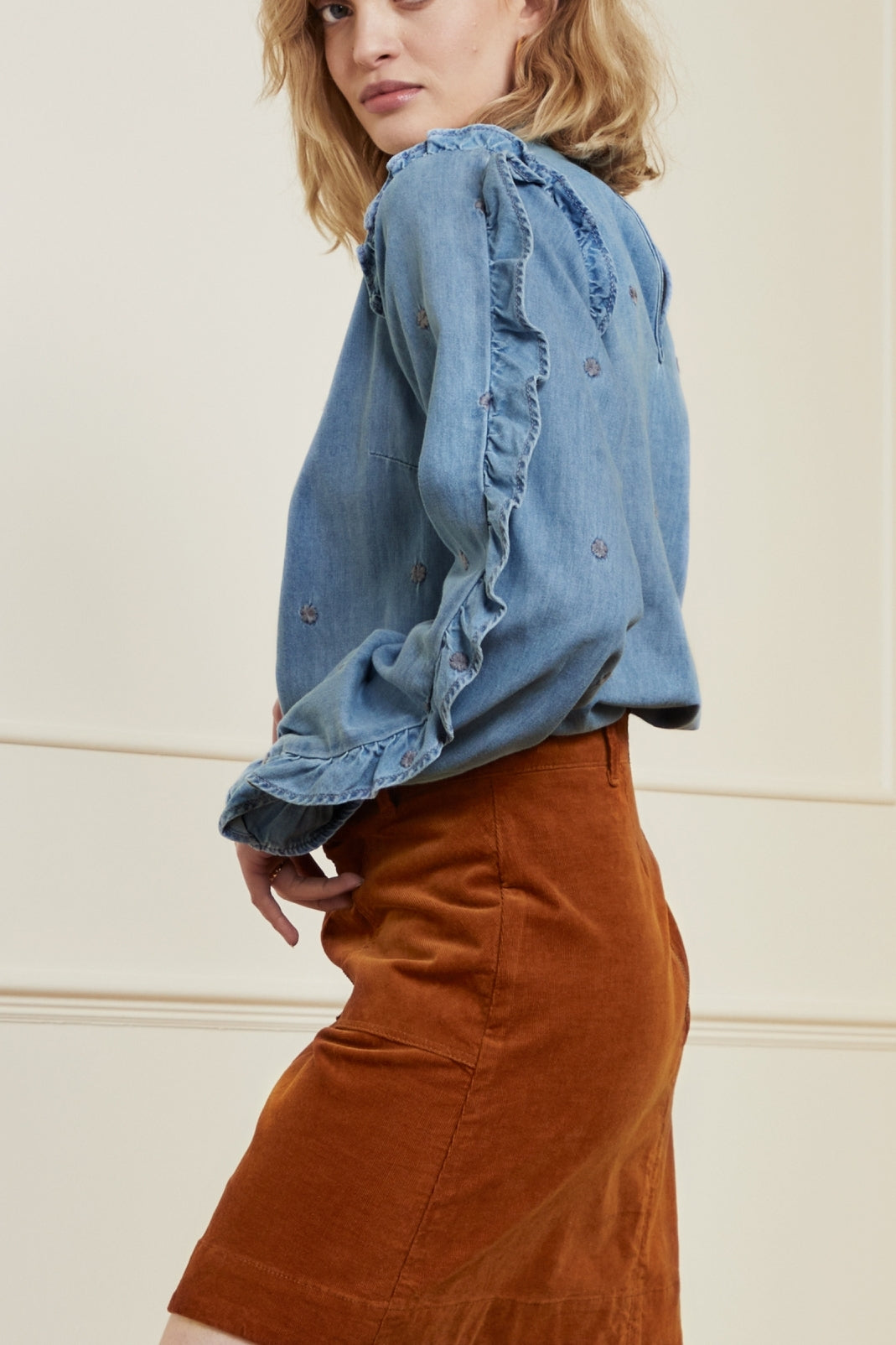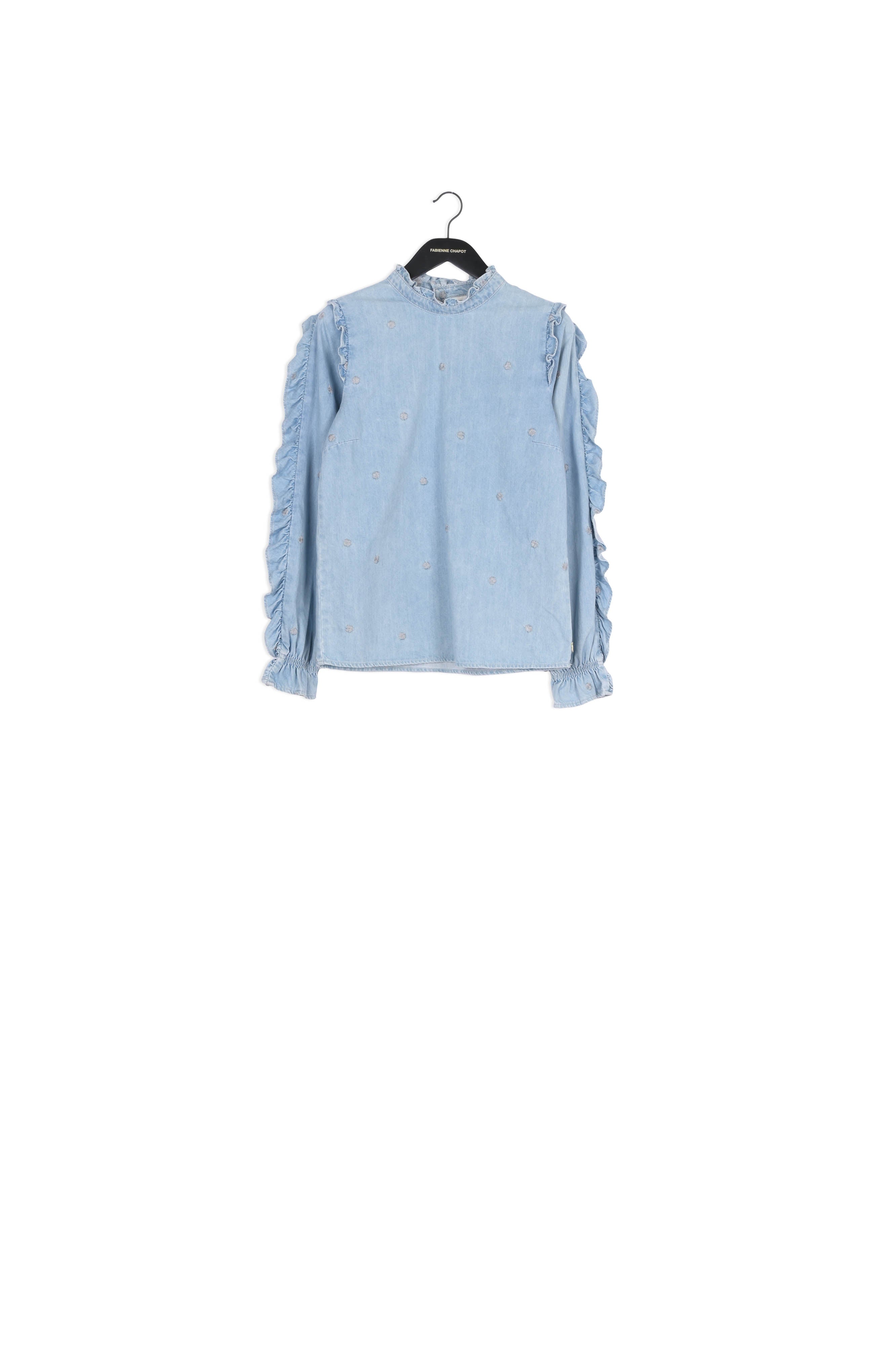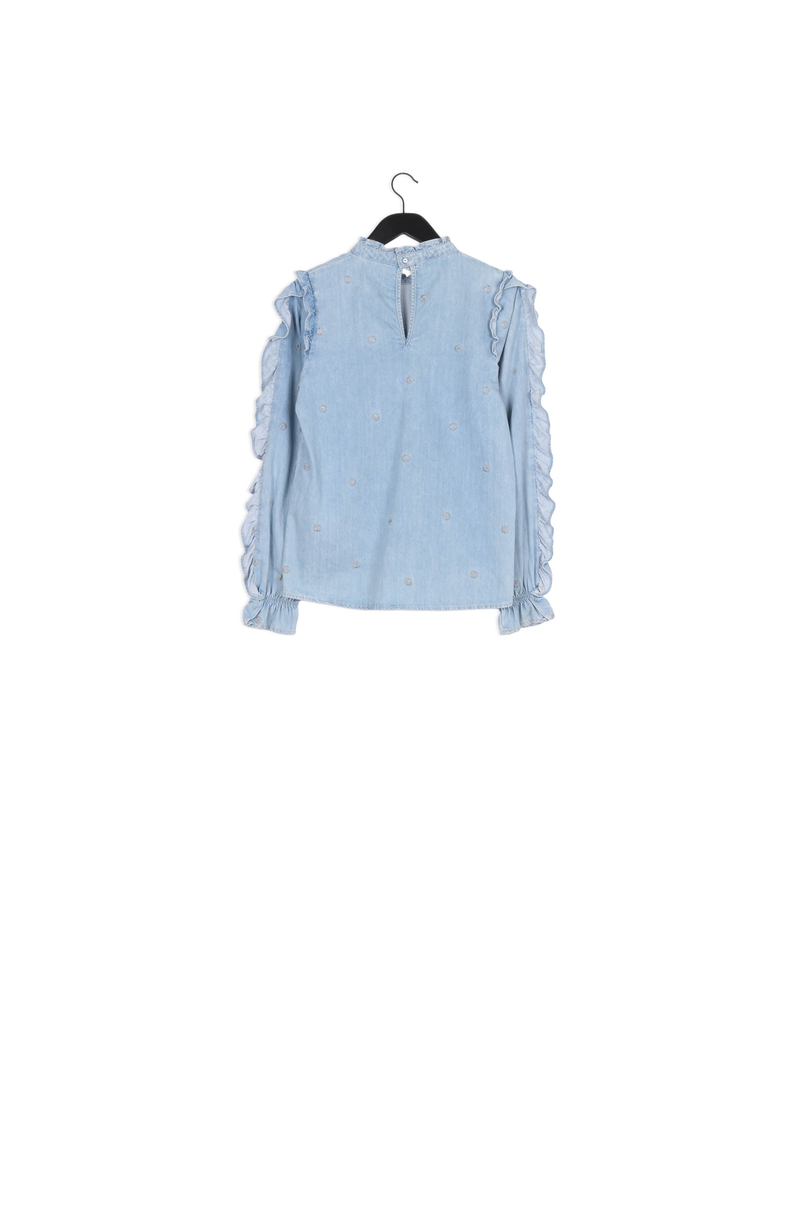 Denim top with ruffle details on the sleeves, shoulders and along the collar stand. Cecile Denim Top has embroidered flowers, button closure at the neck and elastic in the cuffs. This top is made of 100% cotton. -