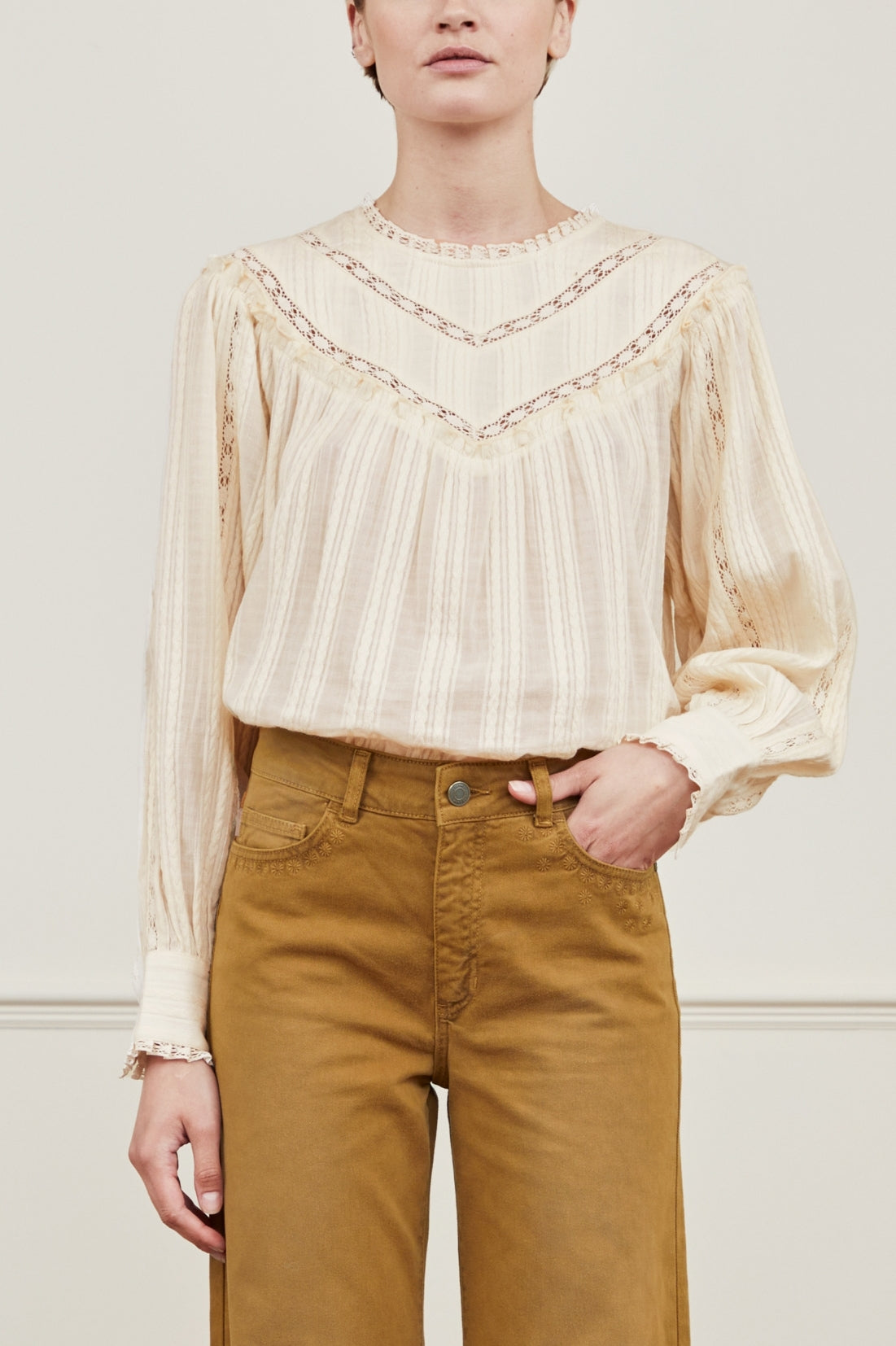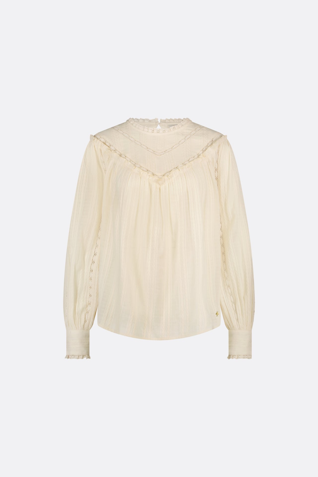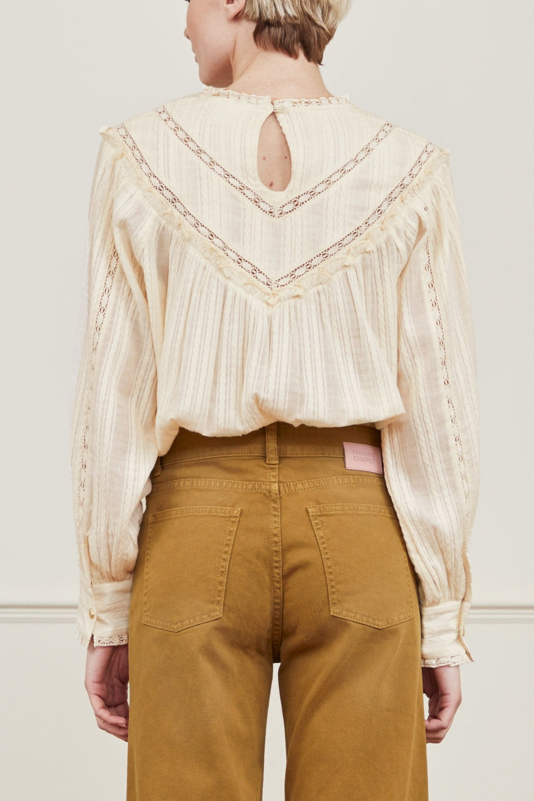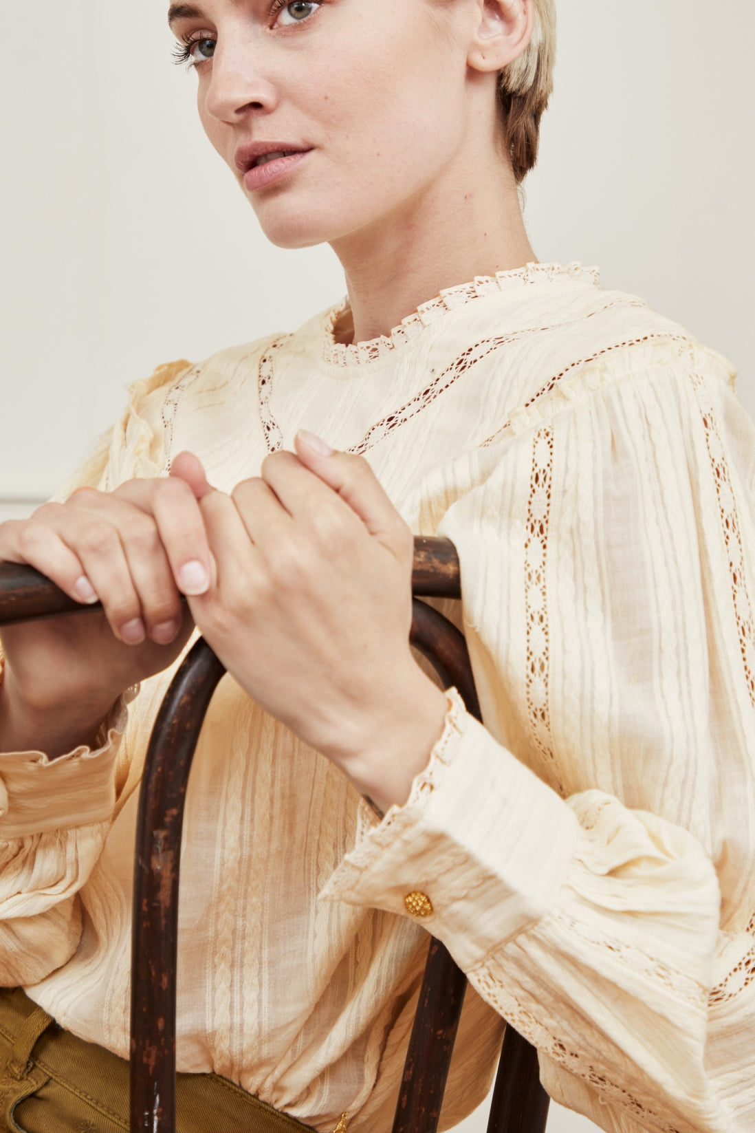 Round neck top with lace detailing on the chest and cuffs. Erin Top has pleated sleeves, ruffles on the hem and cuffs and a button closure on the back. -