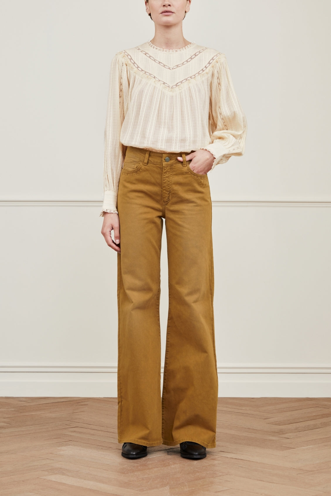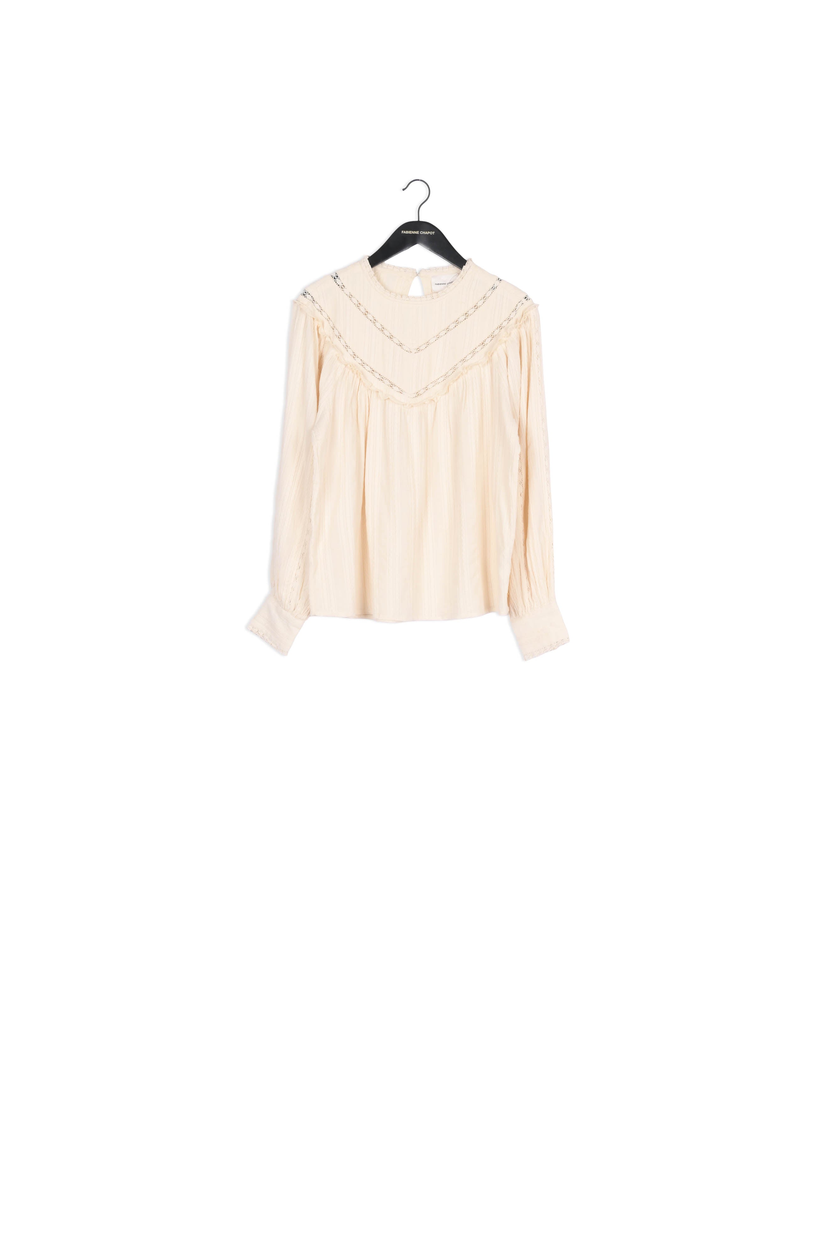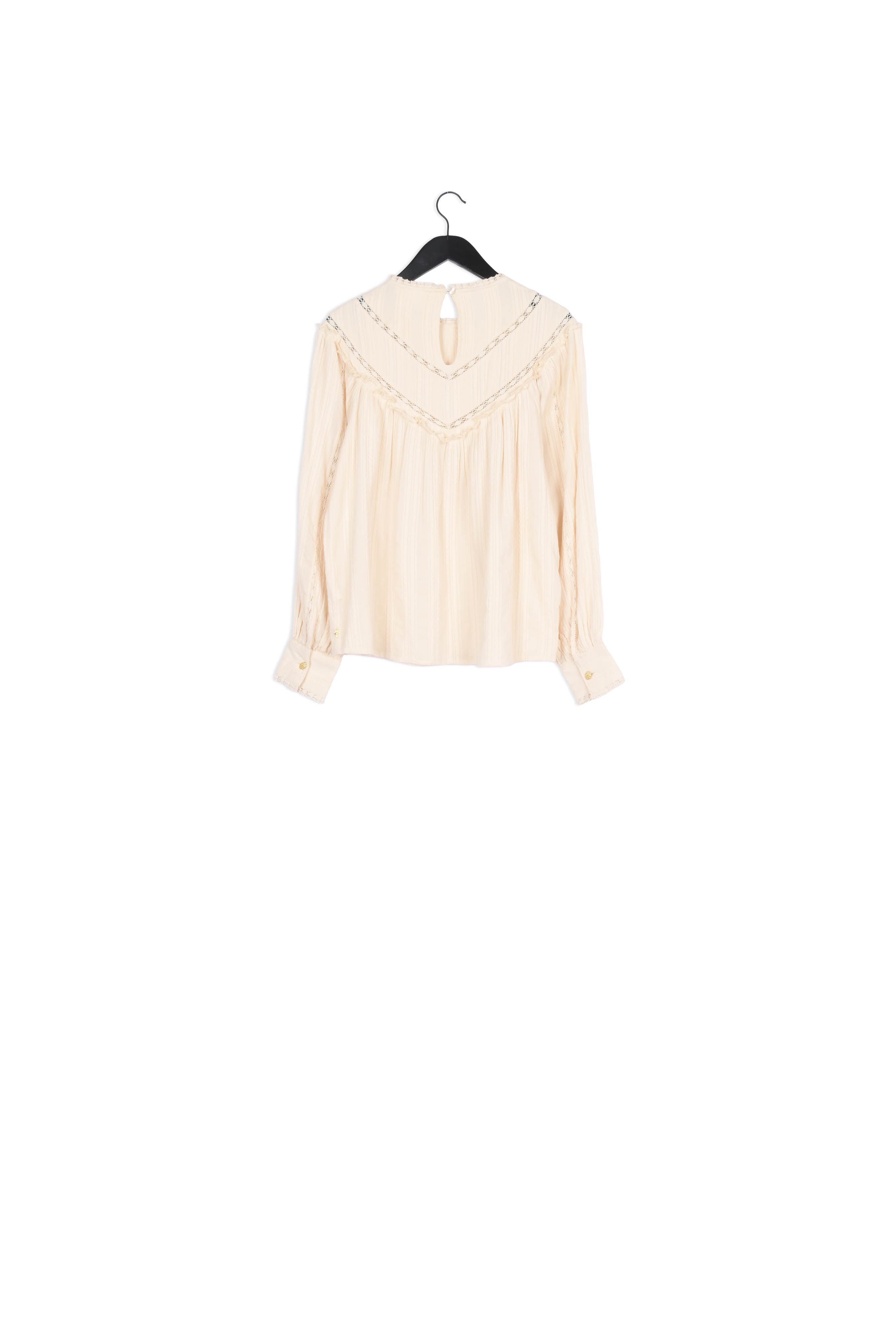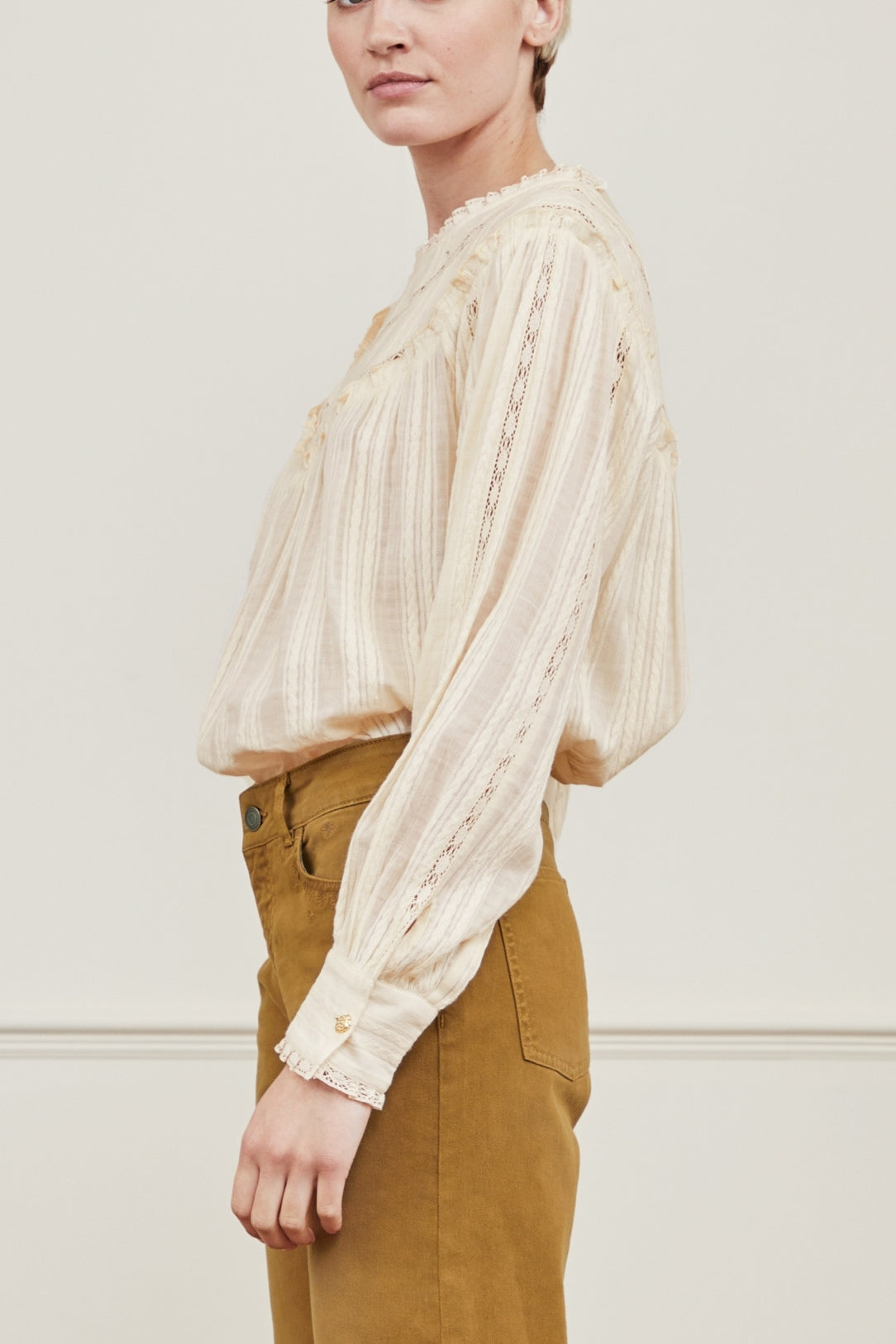 Round neck top with lace detailing on the chest and cuffs. Erin Top has pleated sleeves, ruffles on the hem and cuffs and a button closure on the back. -