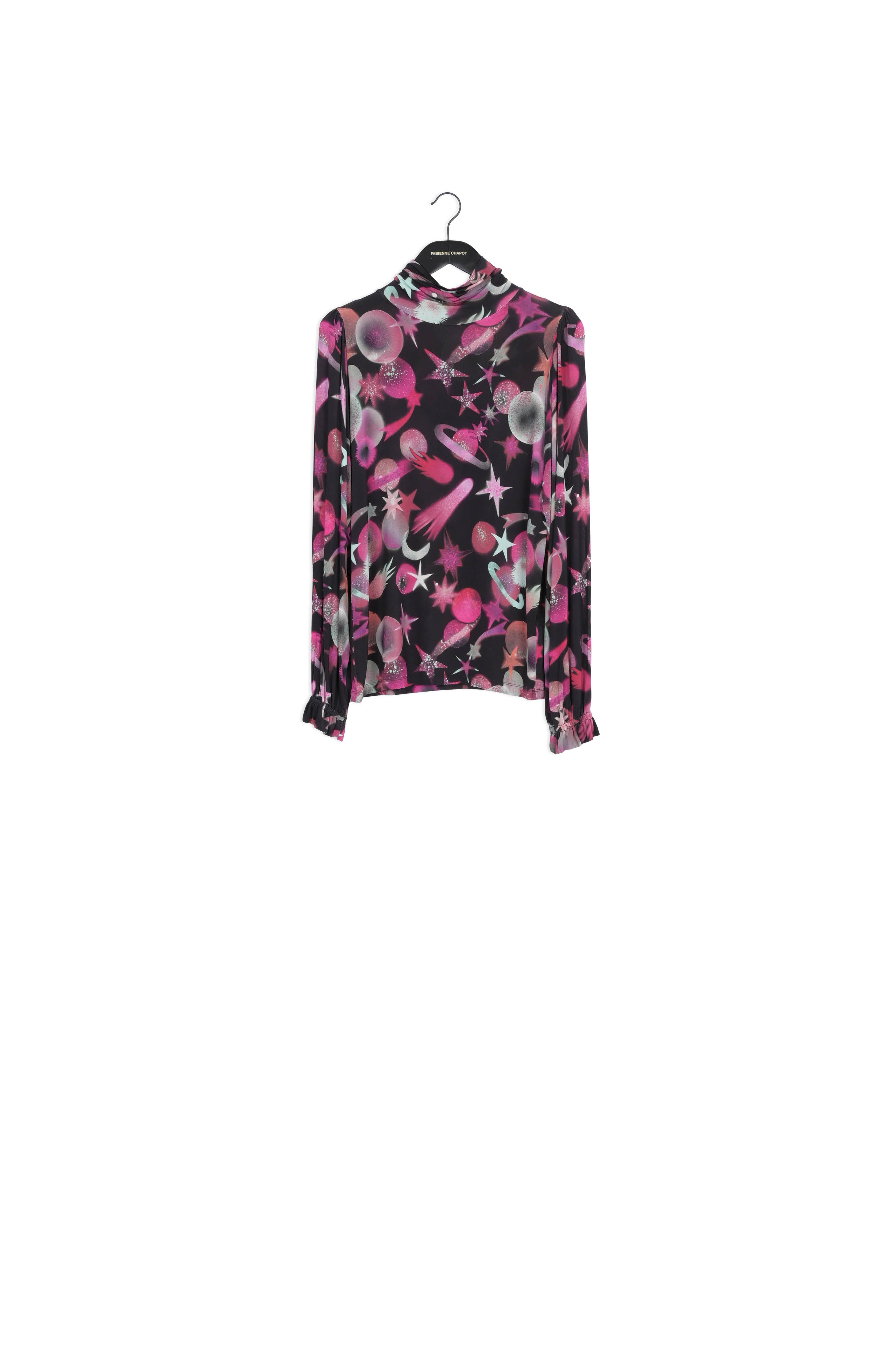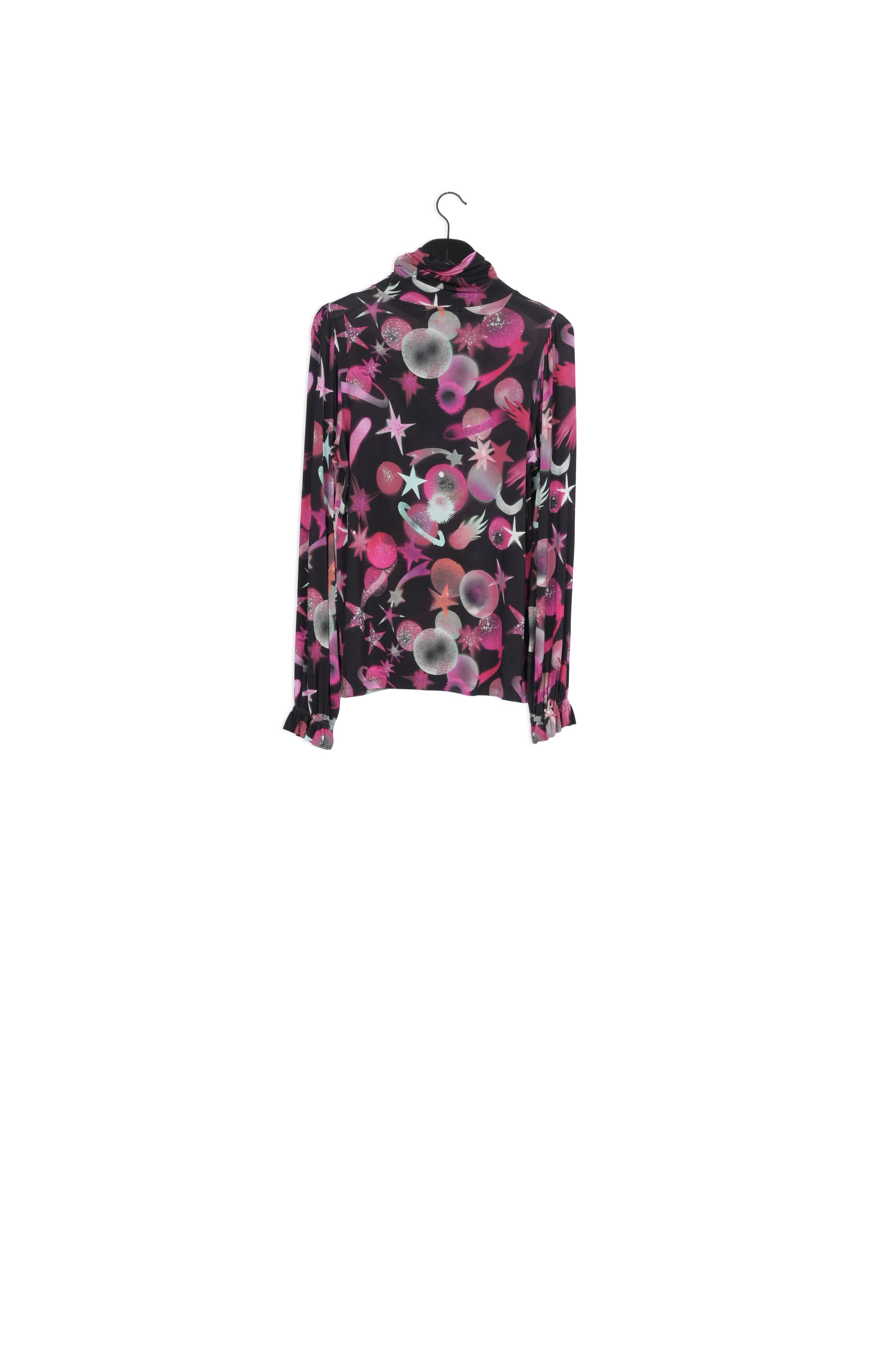 Light, fitted top with turtle neck and long puffed sleeves.