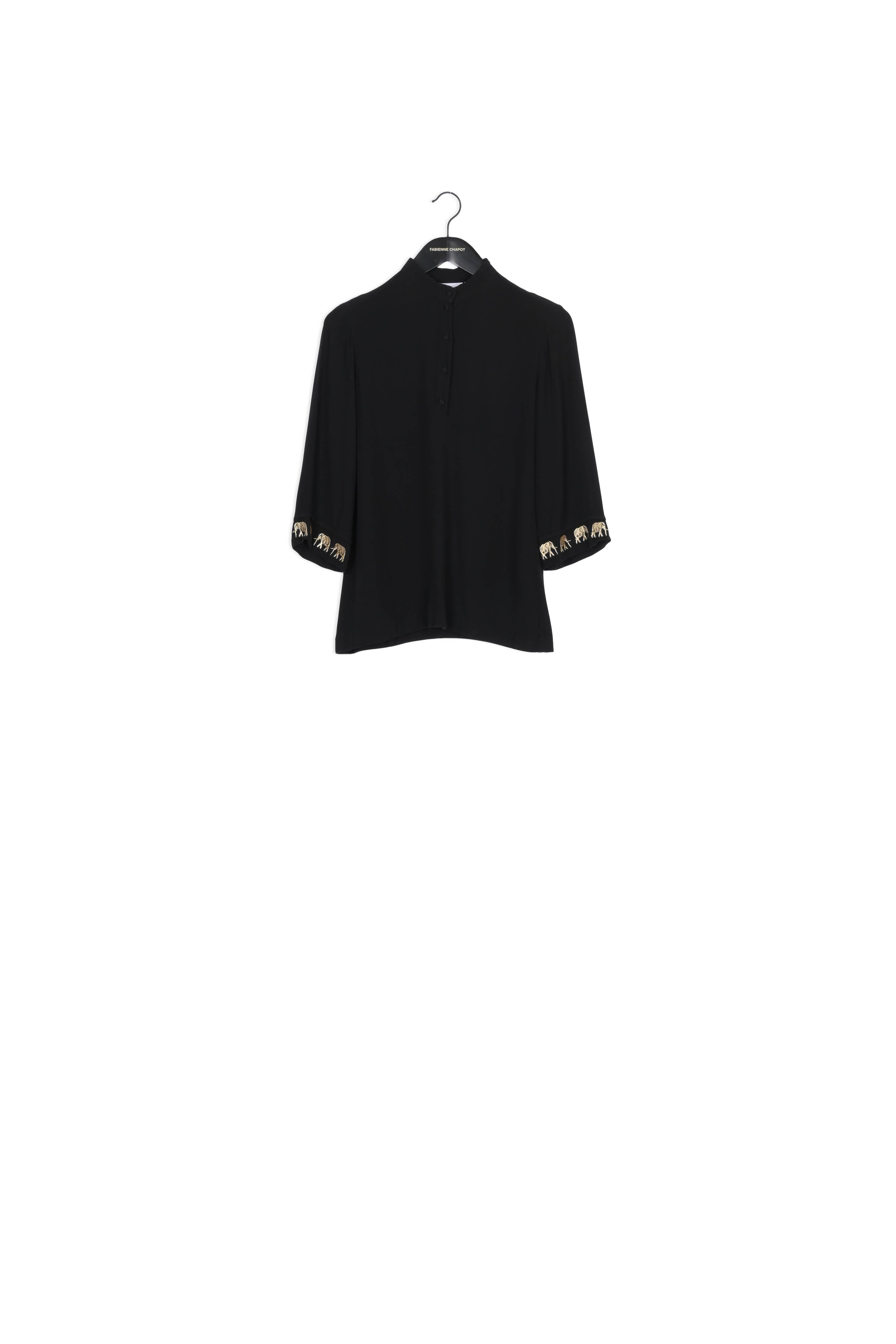 Japanese inspired top with Mao collar, 3/4 sleeves and hand-embroidered gold-coloured elephants on the sleeves. -