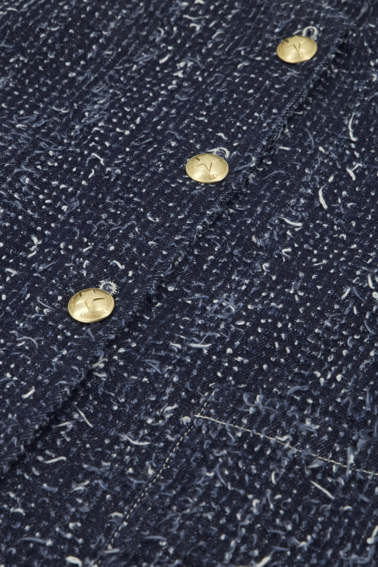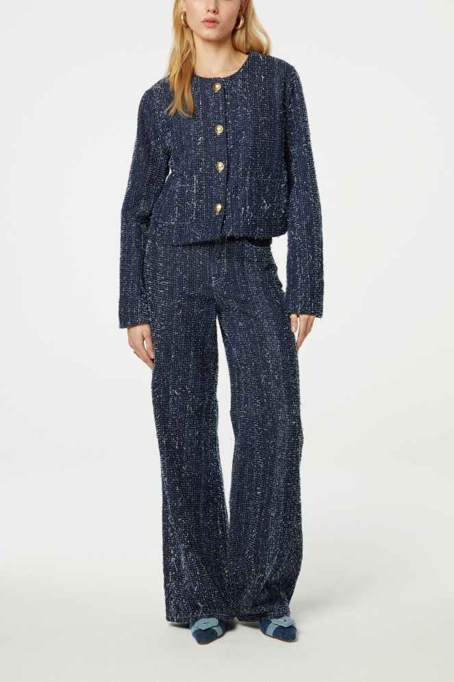 This women's dark blue blazer features a tweed-inspired look, a round neck and charming gold-colored buttons. Suitable for both casual and chic occasions. The Davis Blazer is perfect for layering over your favorite top. Pair it with the Thea Wide leg Tweed Jeans to coordinate the look. -