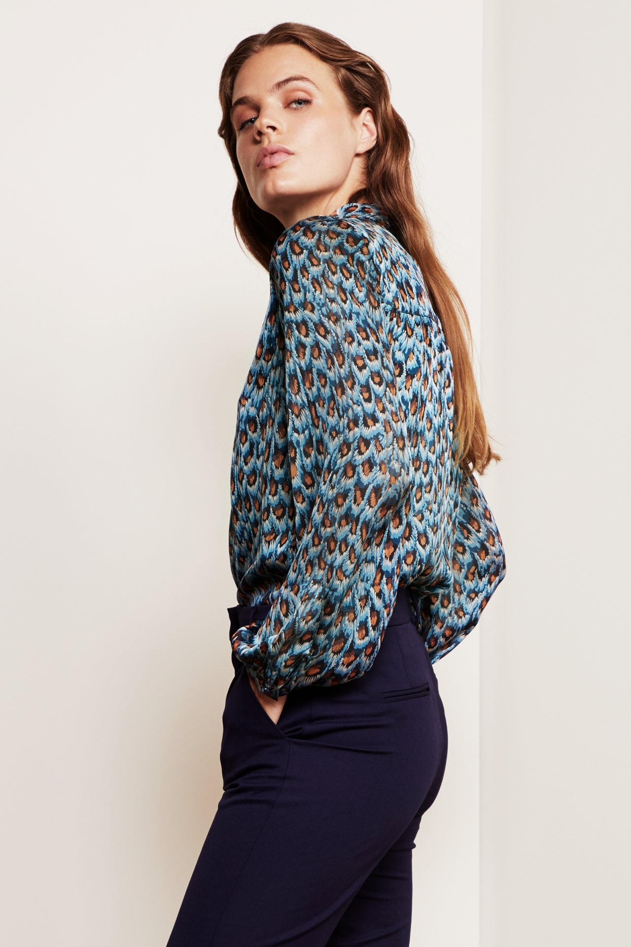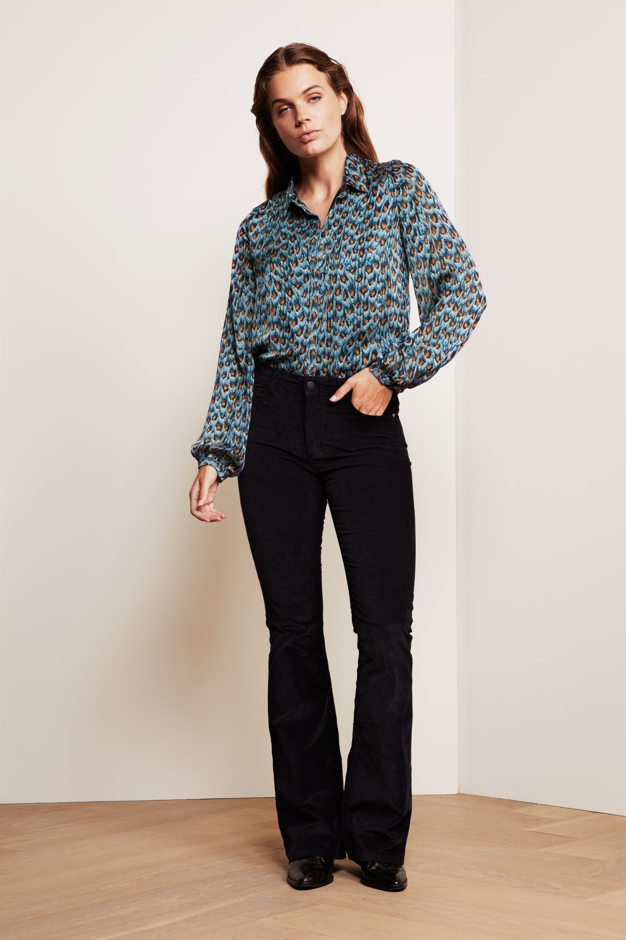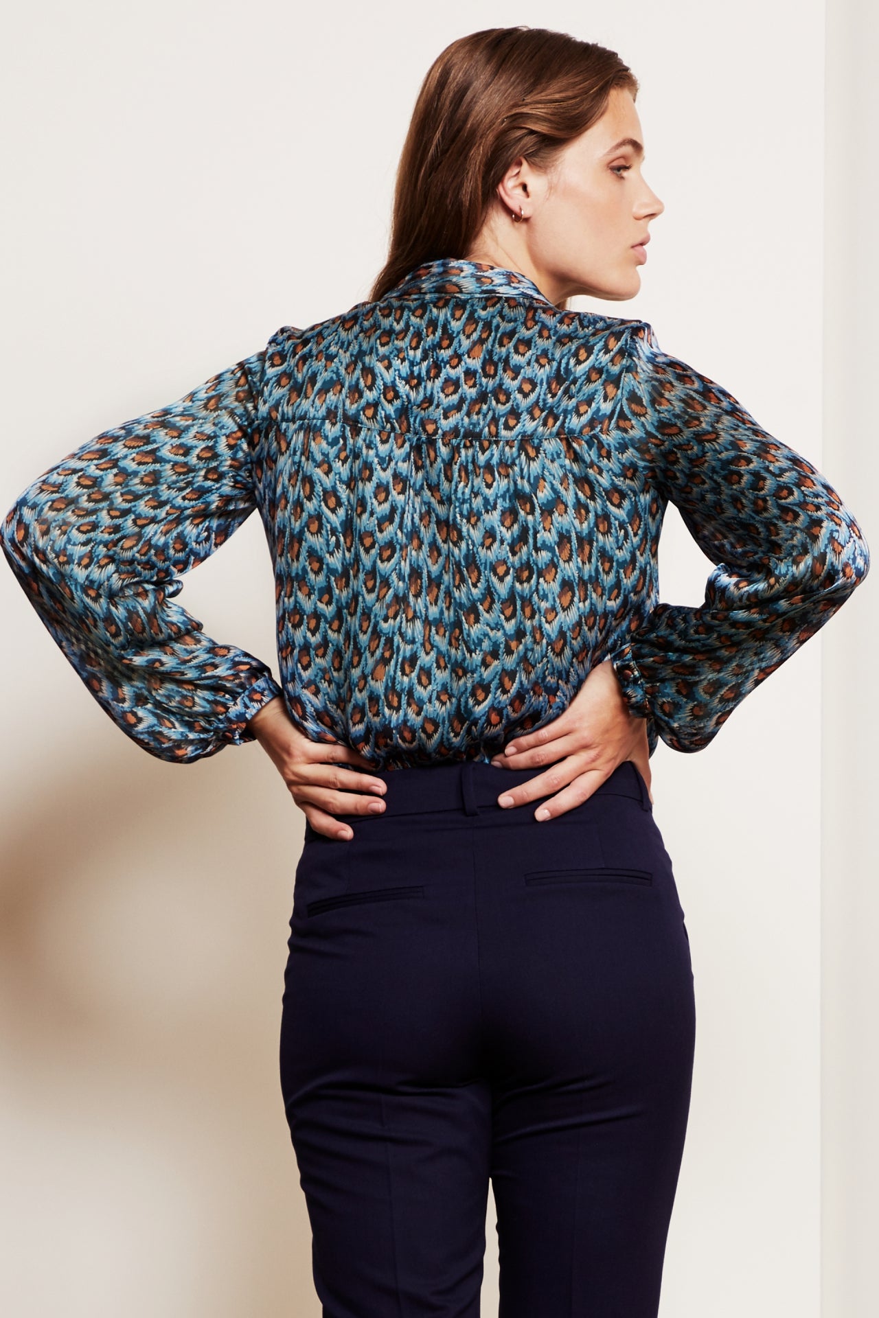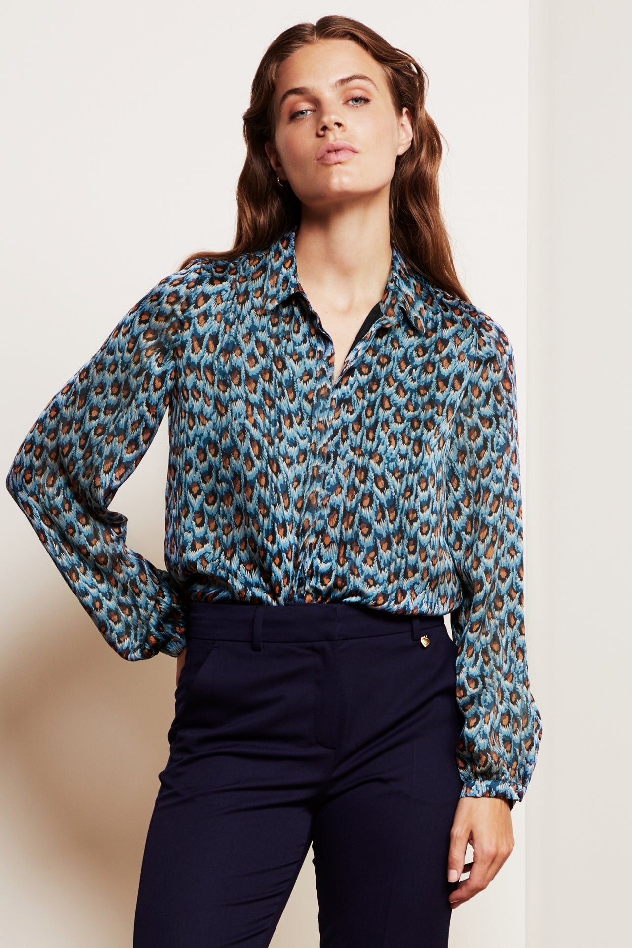 Flowing blouse with classic collar and invisible button fastening. Frida Collar Blouse has puffed sleeves. -