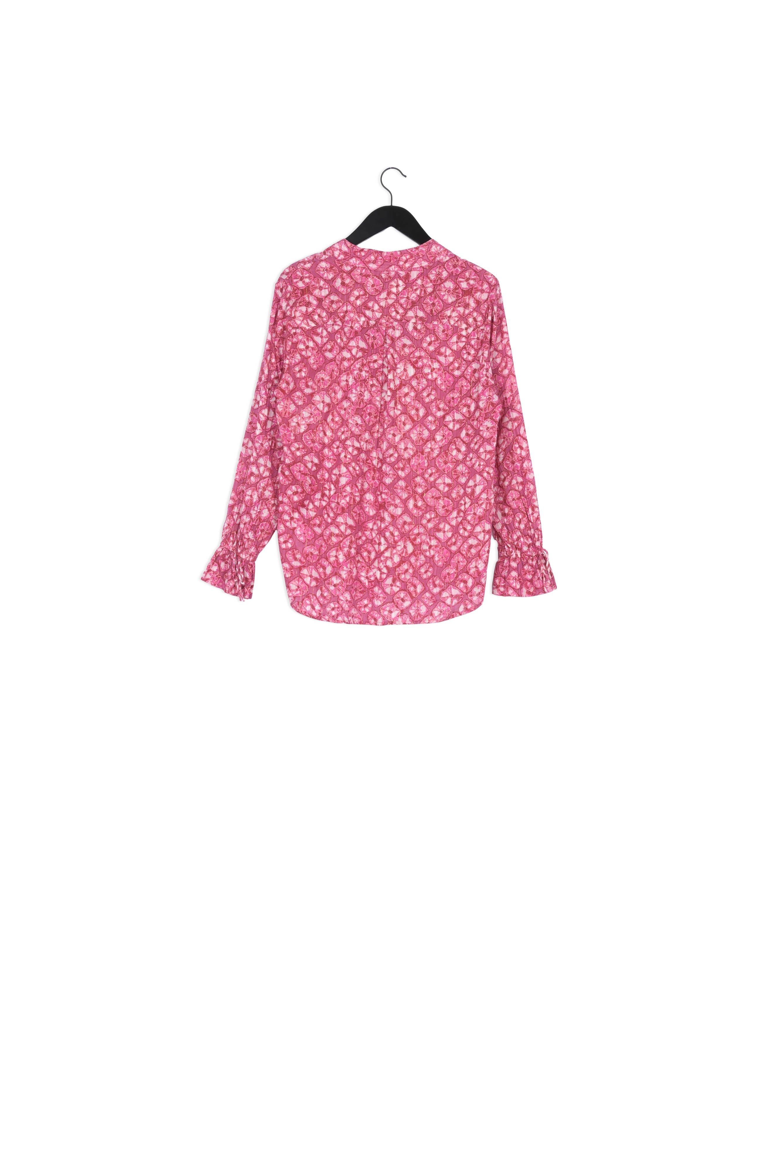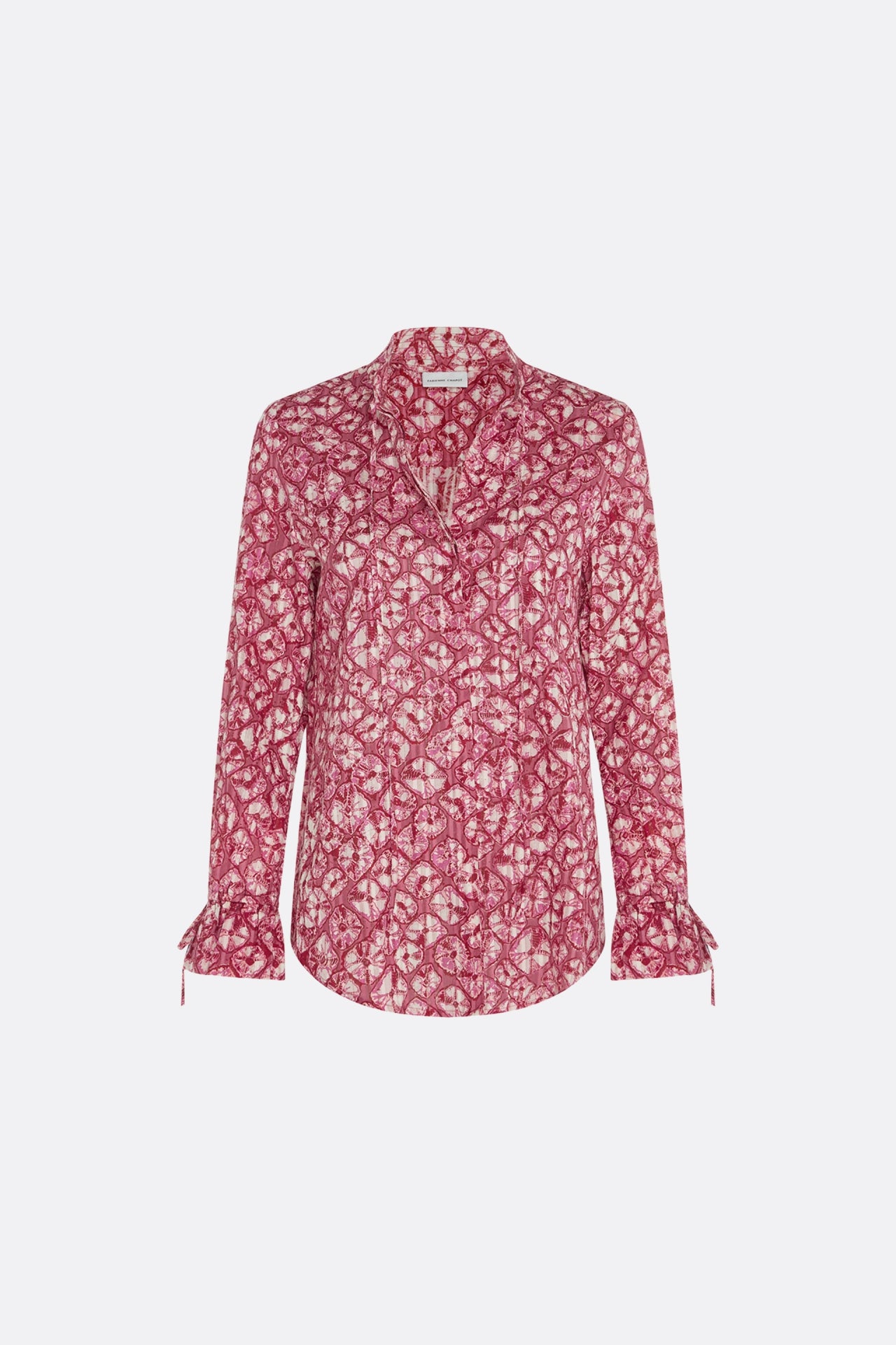 Blouse with mao collar and blind button closure. Becca Blouse has golden lurex details and a bow detail at the cuffs and collar. A modern translation of the hippie-inspired tie dye, shaped like diamonds. -