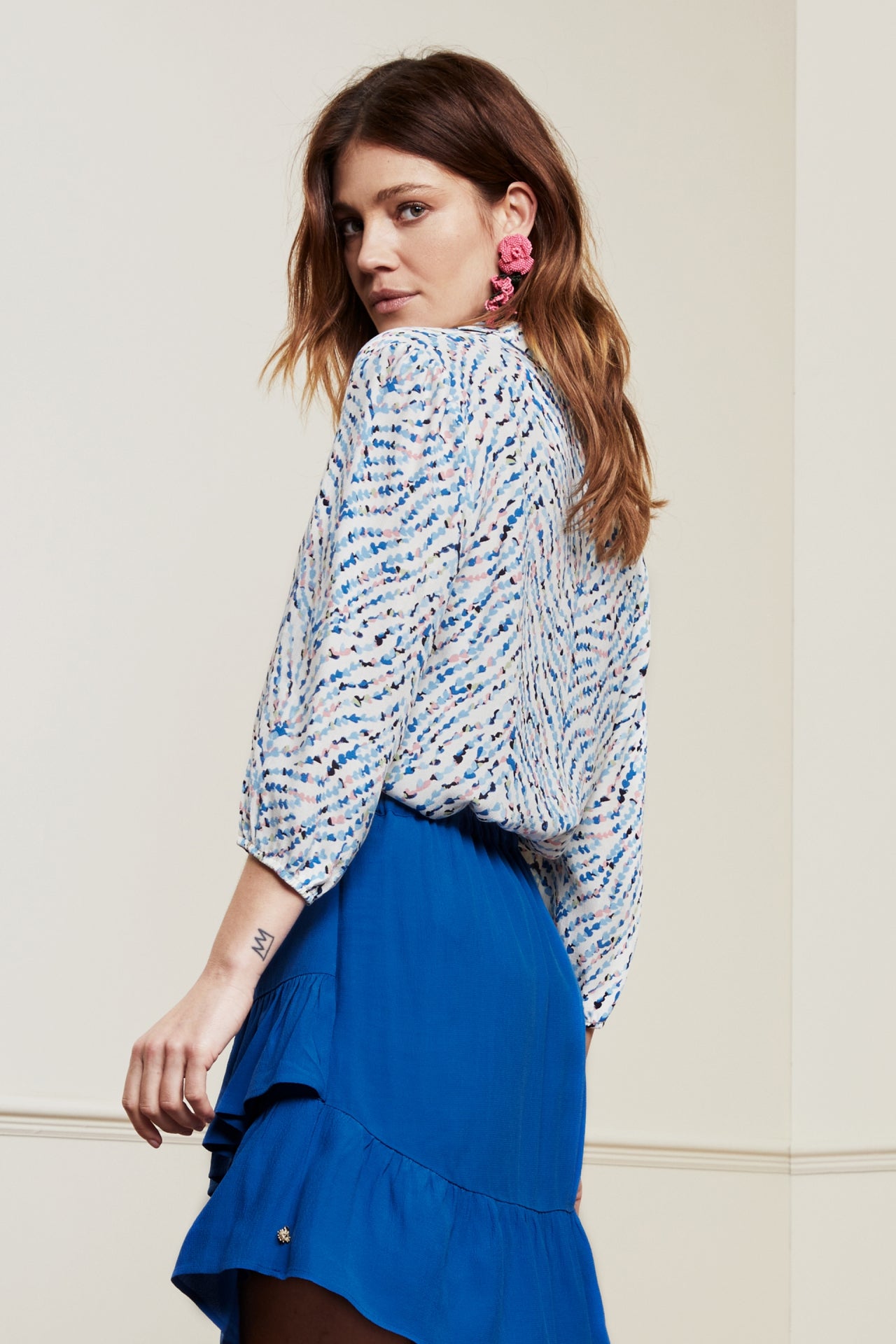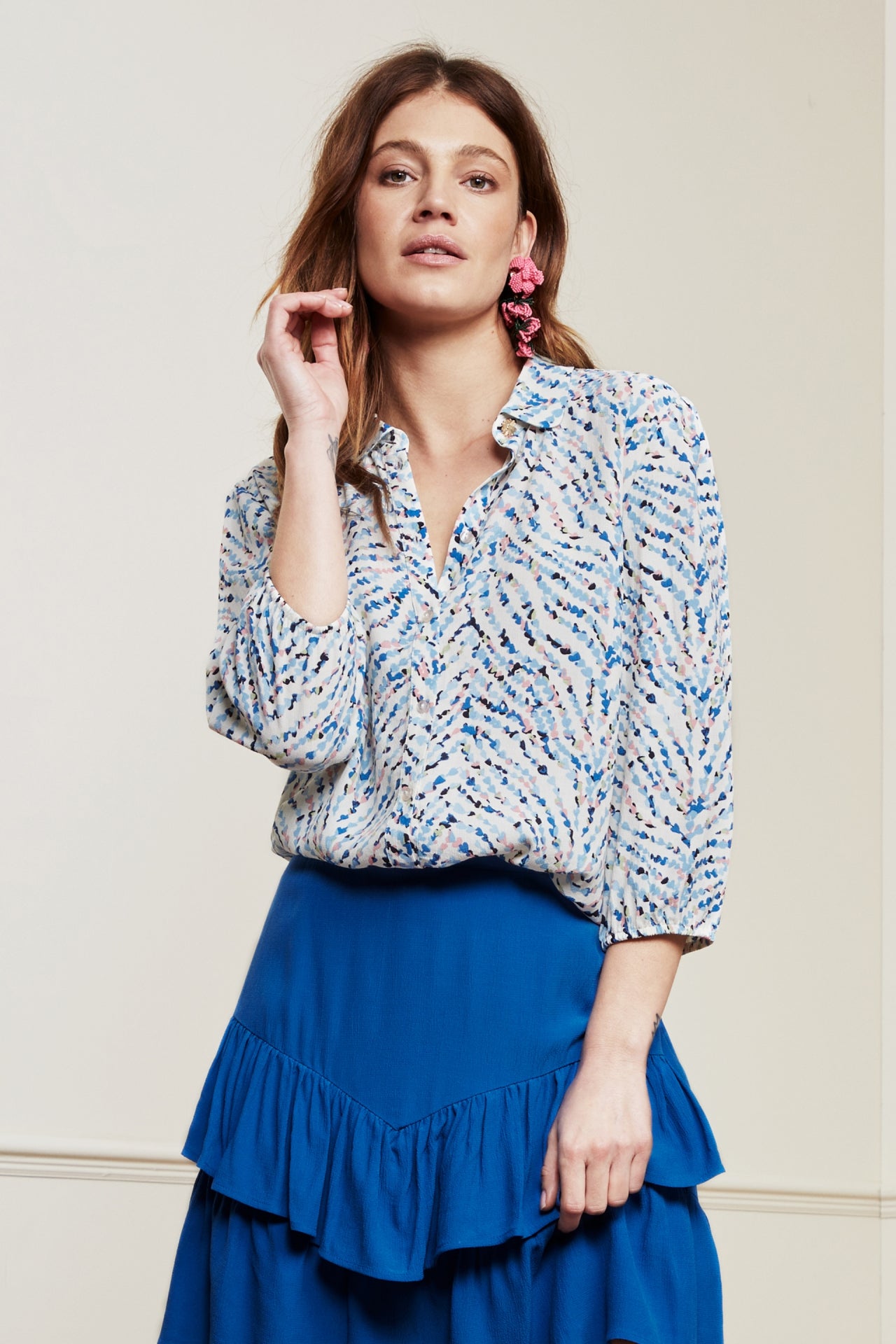 Airy blouse with a classic collar and a gold-coloured button on the collar. Gina Blouse has puffed sleeves with an elastic band. This item is made of 100% Lenzing™ EcoVero™ Viscose: breezy, supple and conscious. Note: The colours of the items in the video may vary slightly. -