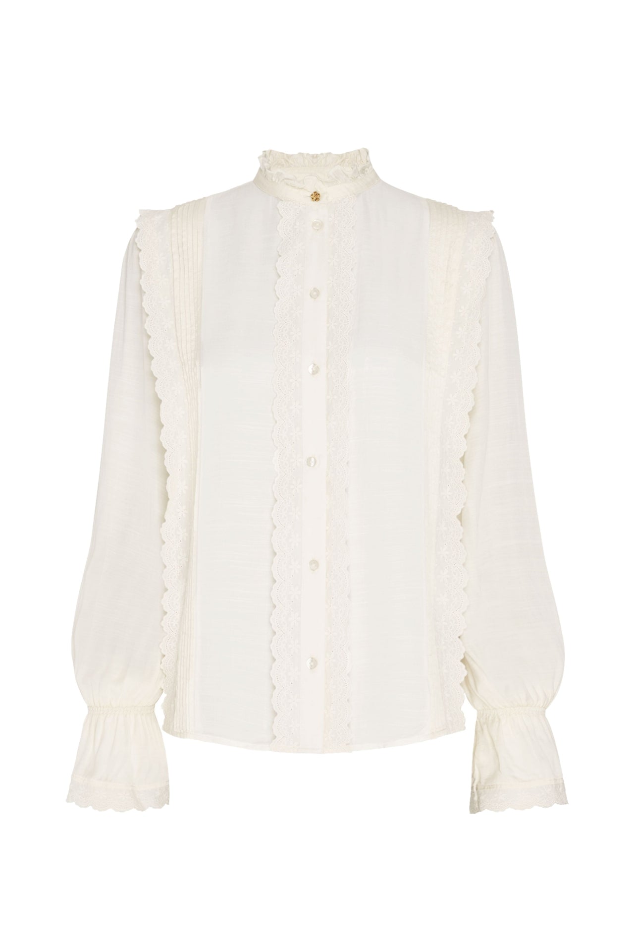 Blouse with button closure which you can wear in two ways: open or high-closed. Austin Blouse has a nice pleated detail on the shoulder and slightly flared sleeves with an elastic cuff and lace details.