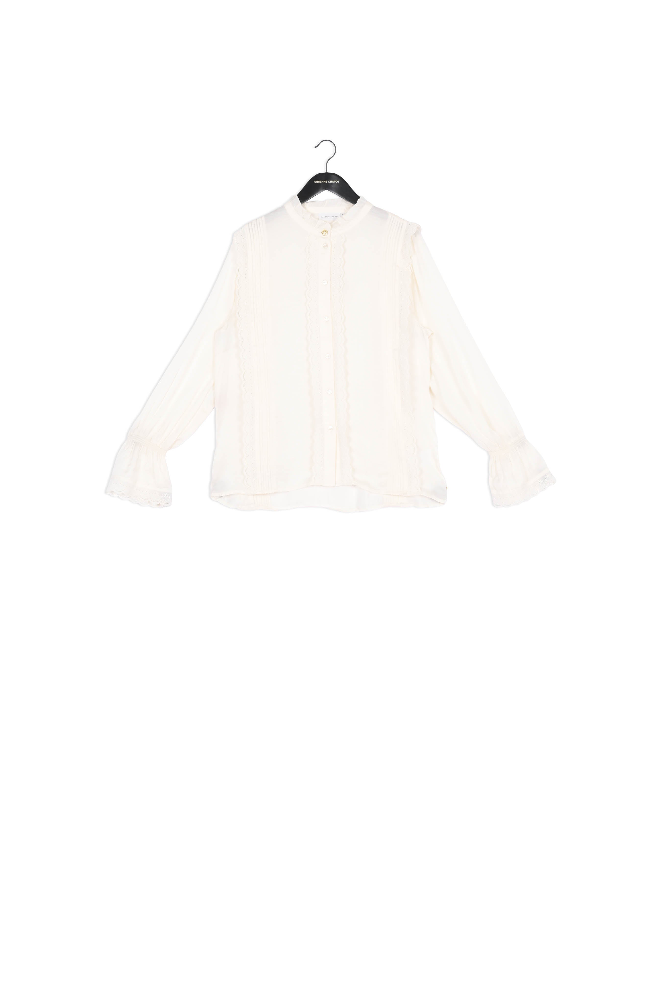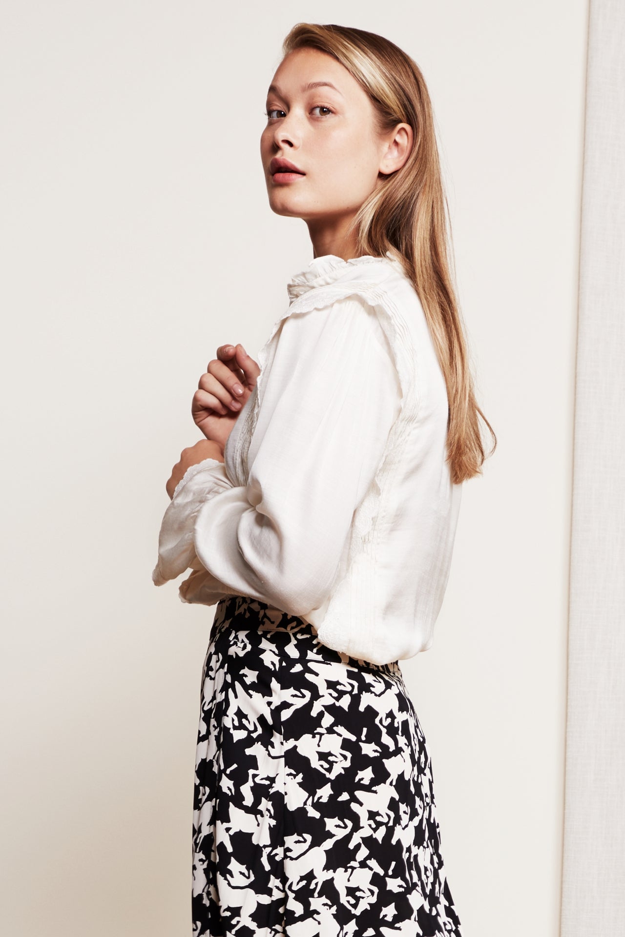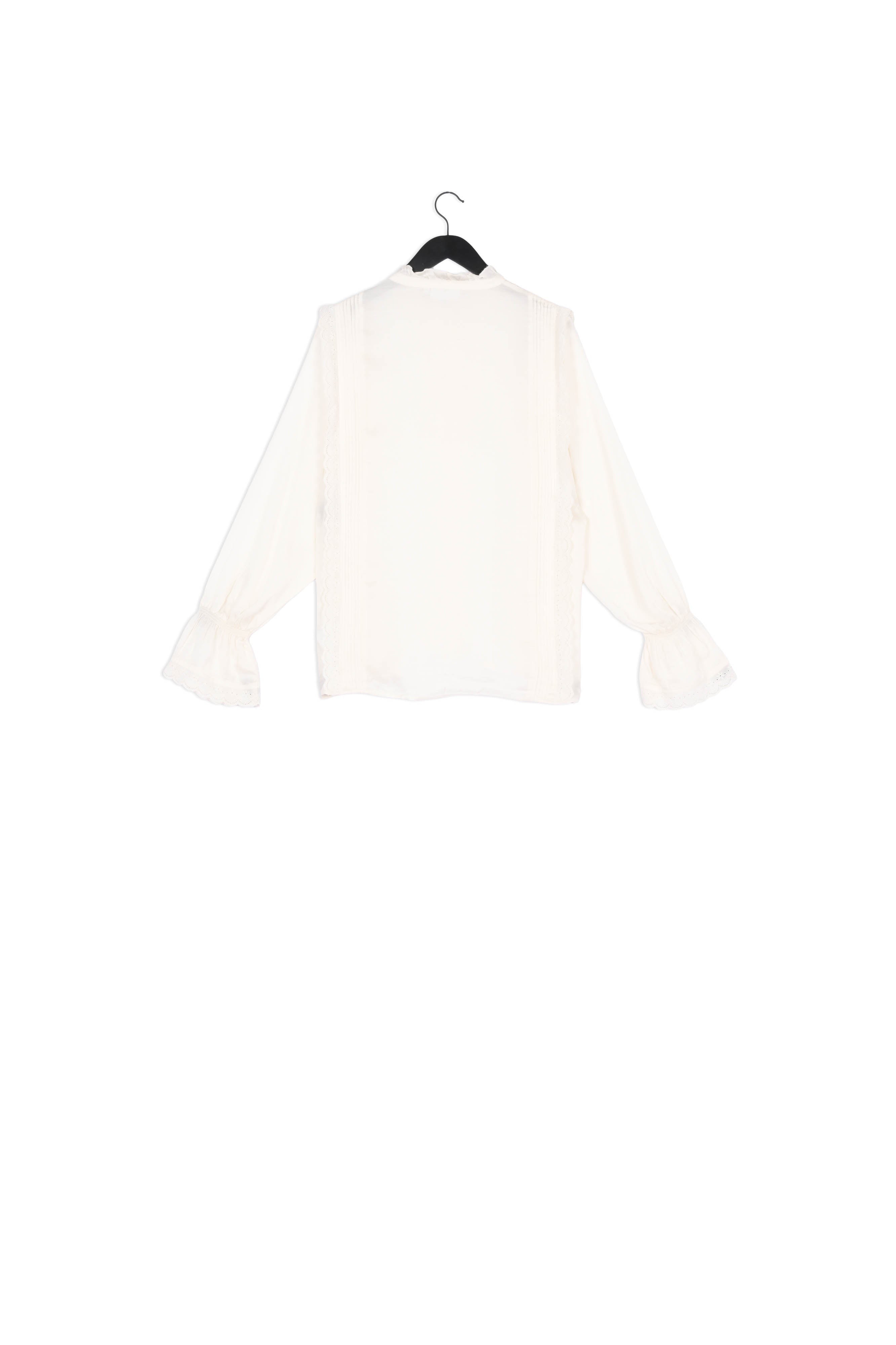 Blouse with button closure which you can wear in two ways: open or high-closed. Austin Blouse has a nice pleated detail on the shoulder and slightly flared sleeves with an elastic cuff and lace details.
