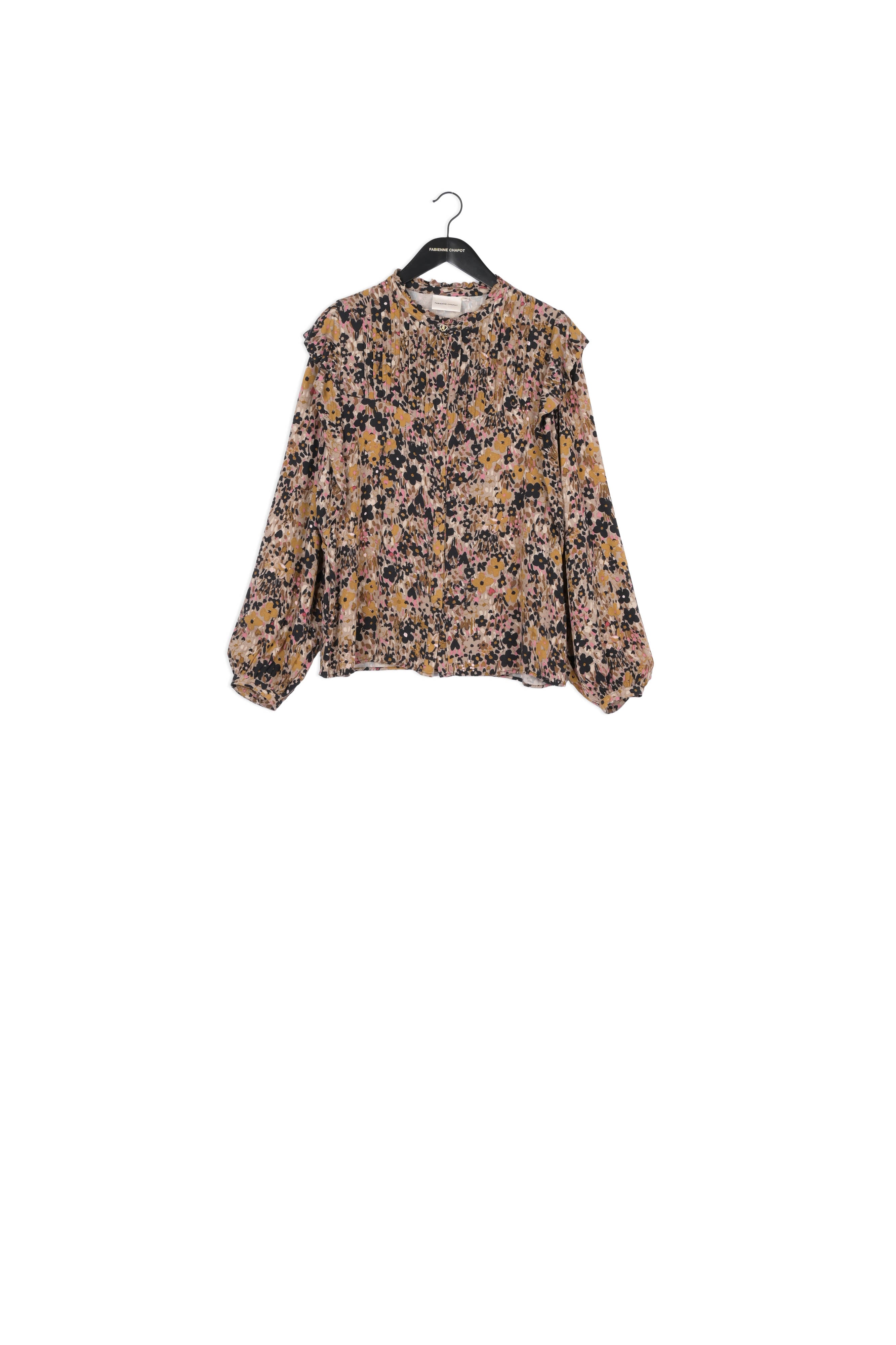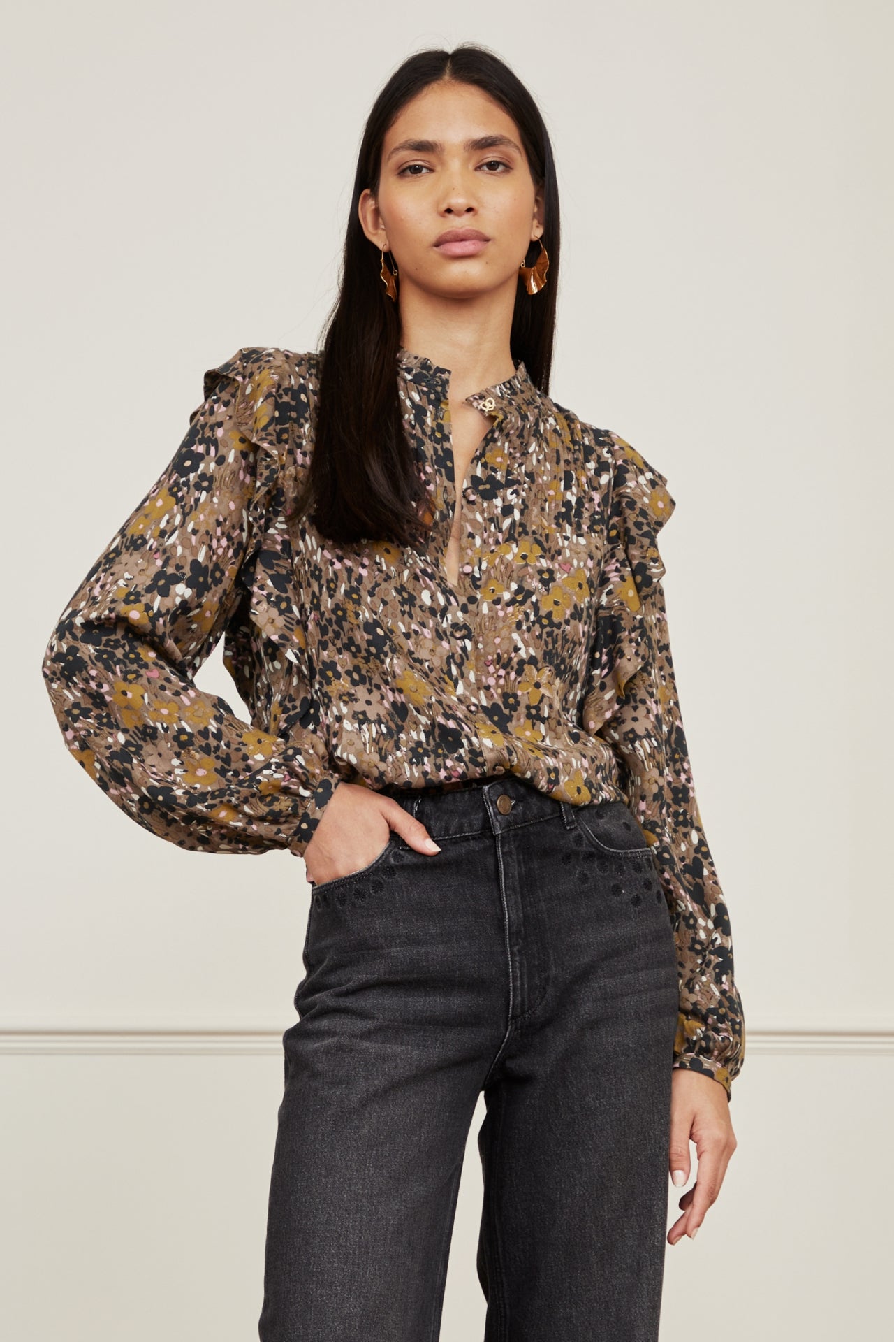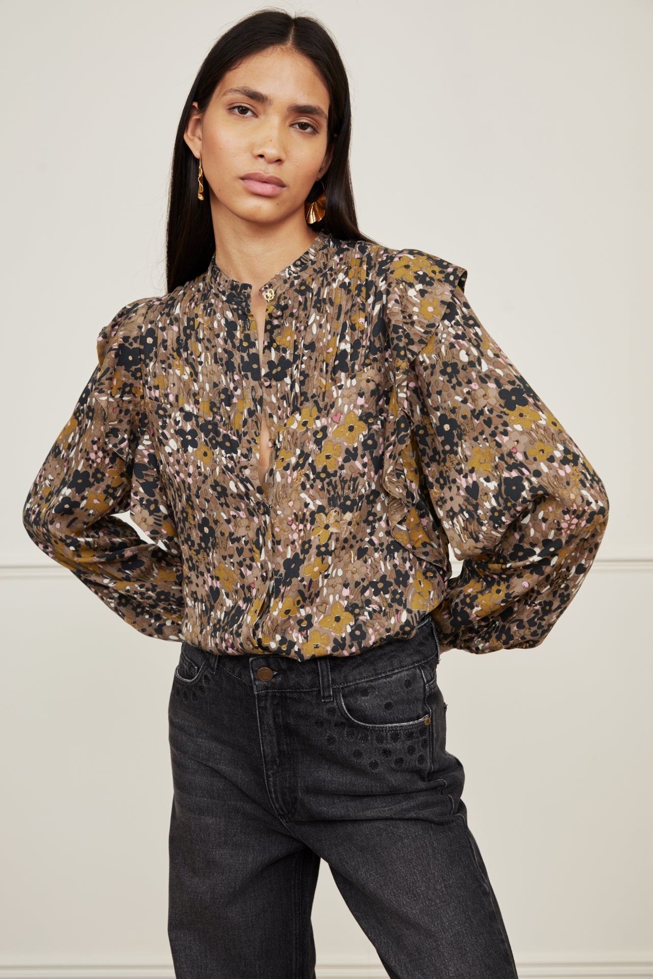 Blouse with balloon sleeves and fabric covered button closure. Bibi Long Sleeve Blouse has pleated details on the chest, ruffles on the shoulders and a golden button on the hem. -