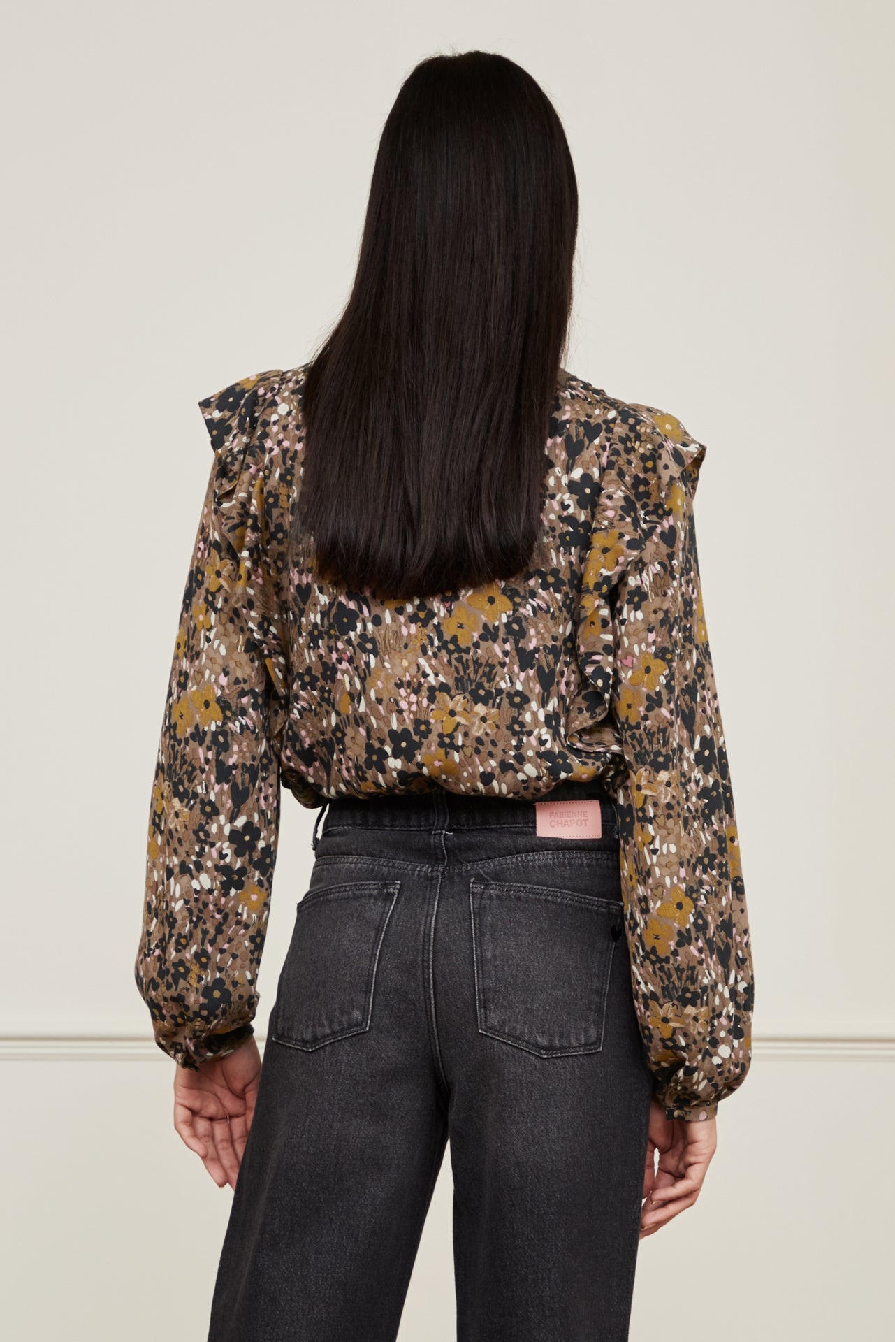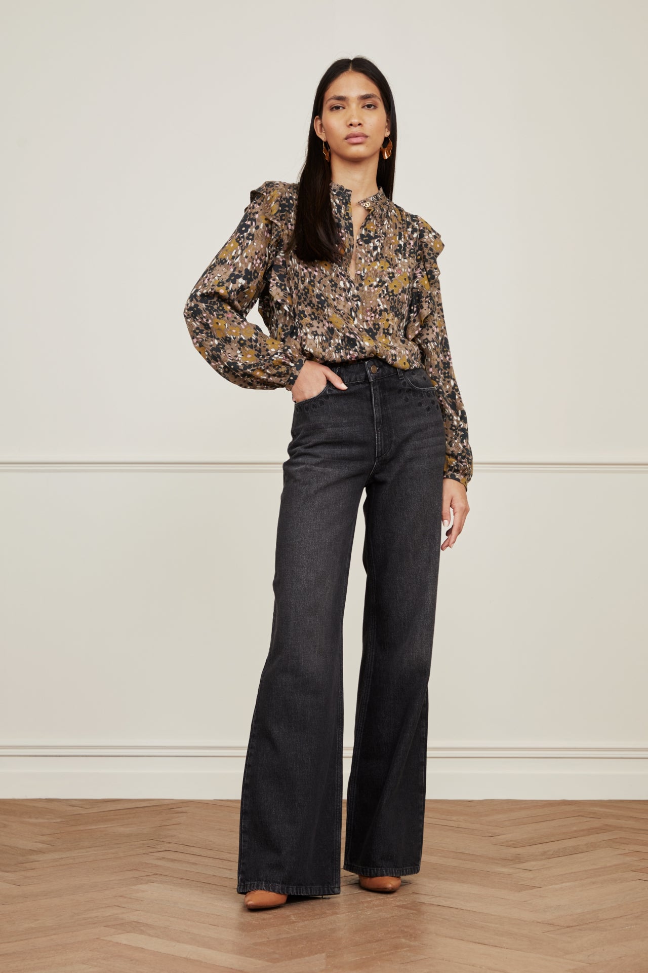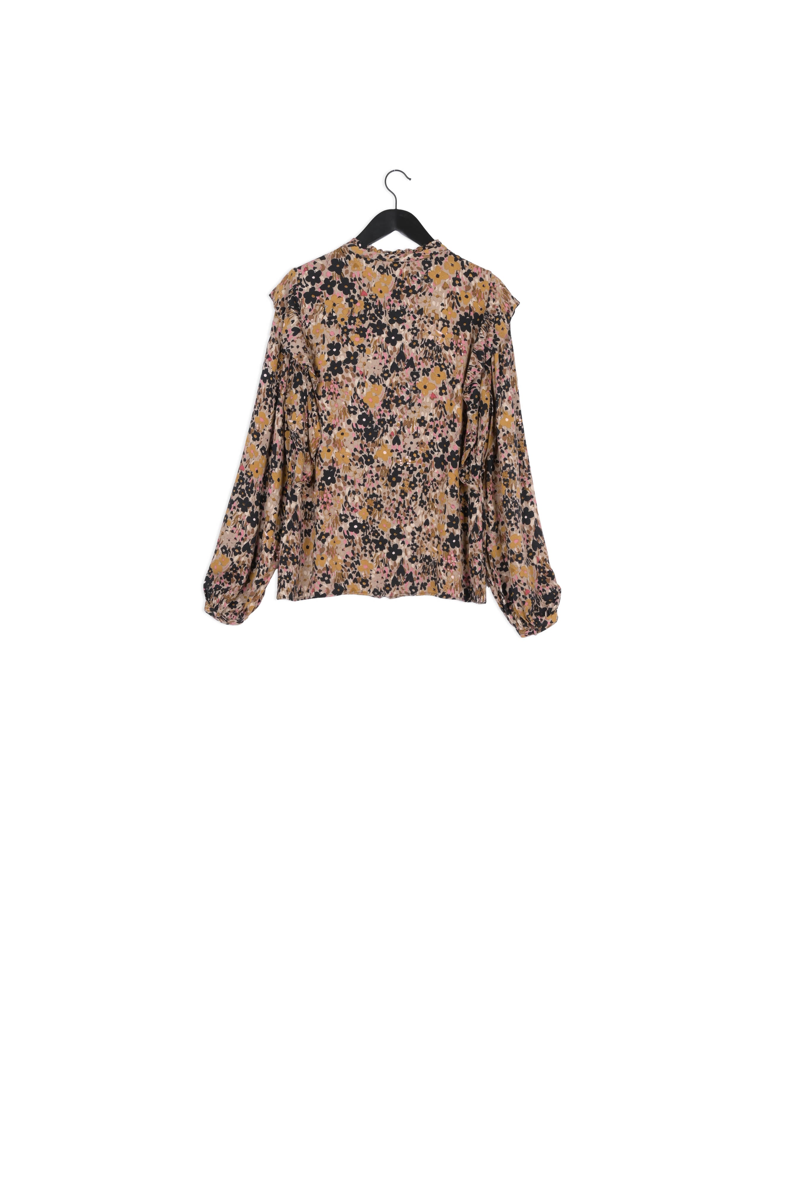 Blouse with balloon sleeves and fabric covered button closure. Bibi Long Sleeve Blouse has pleated details on the chest, ruffles on the shoulders and a golden button on the hem. -