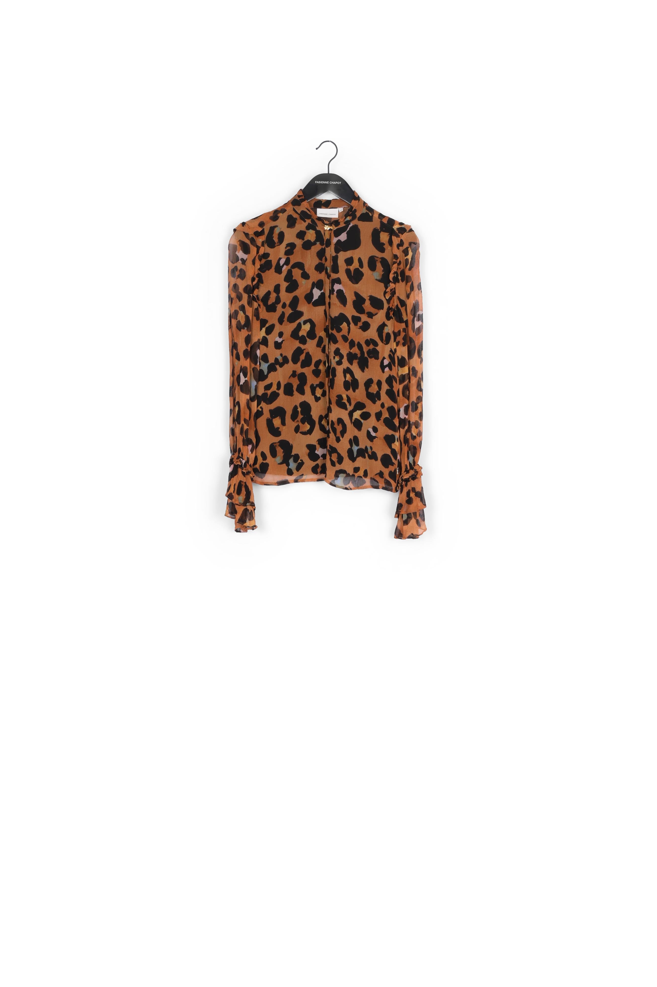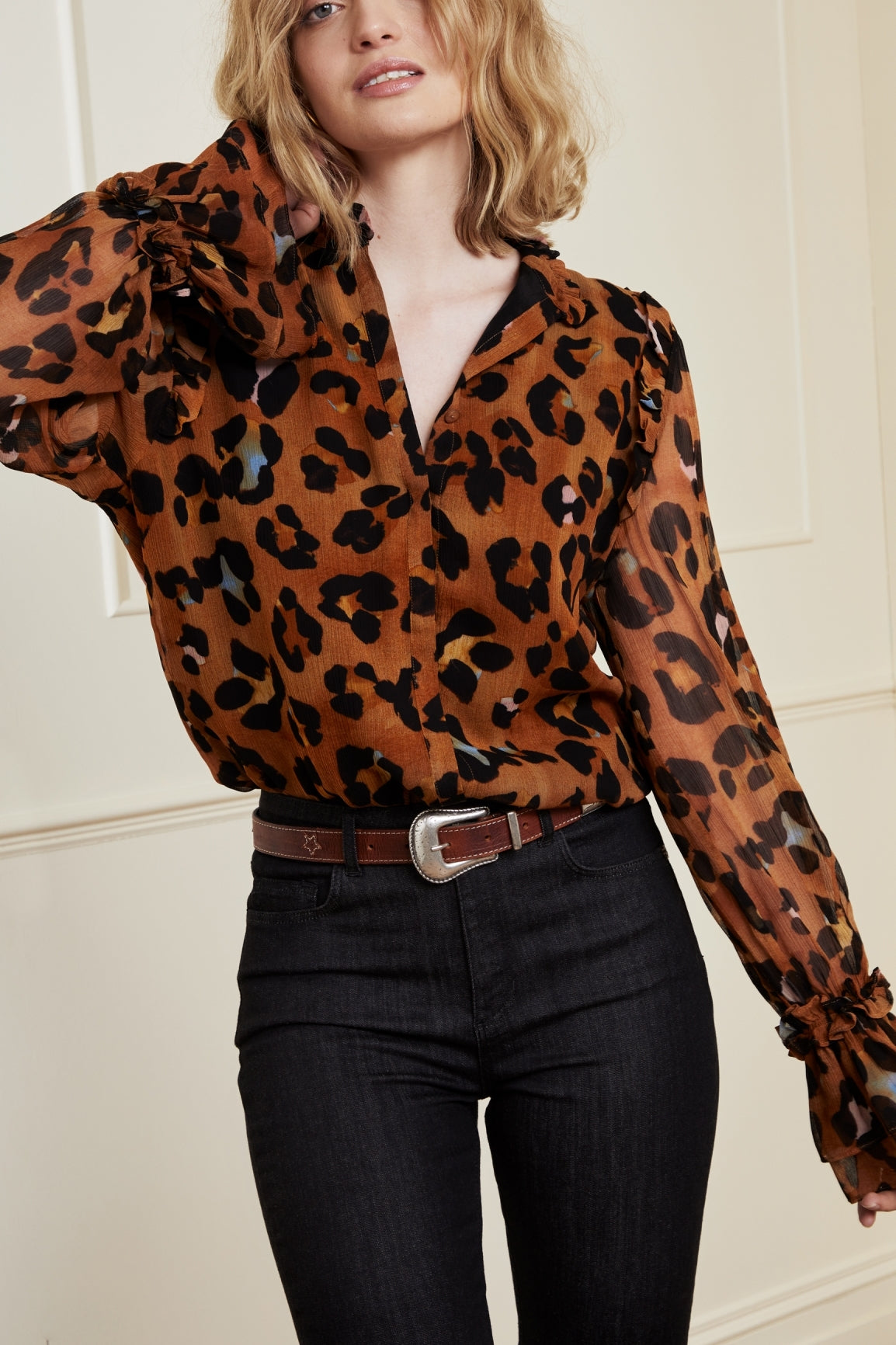 Blouse with mao collar. Carmen Blouse has ruffle details on the slightly see-through sleeves. -