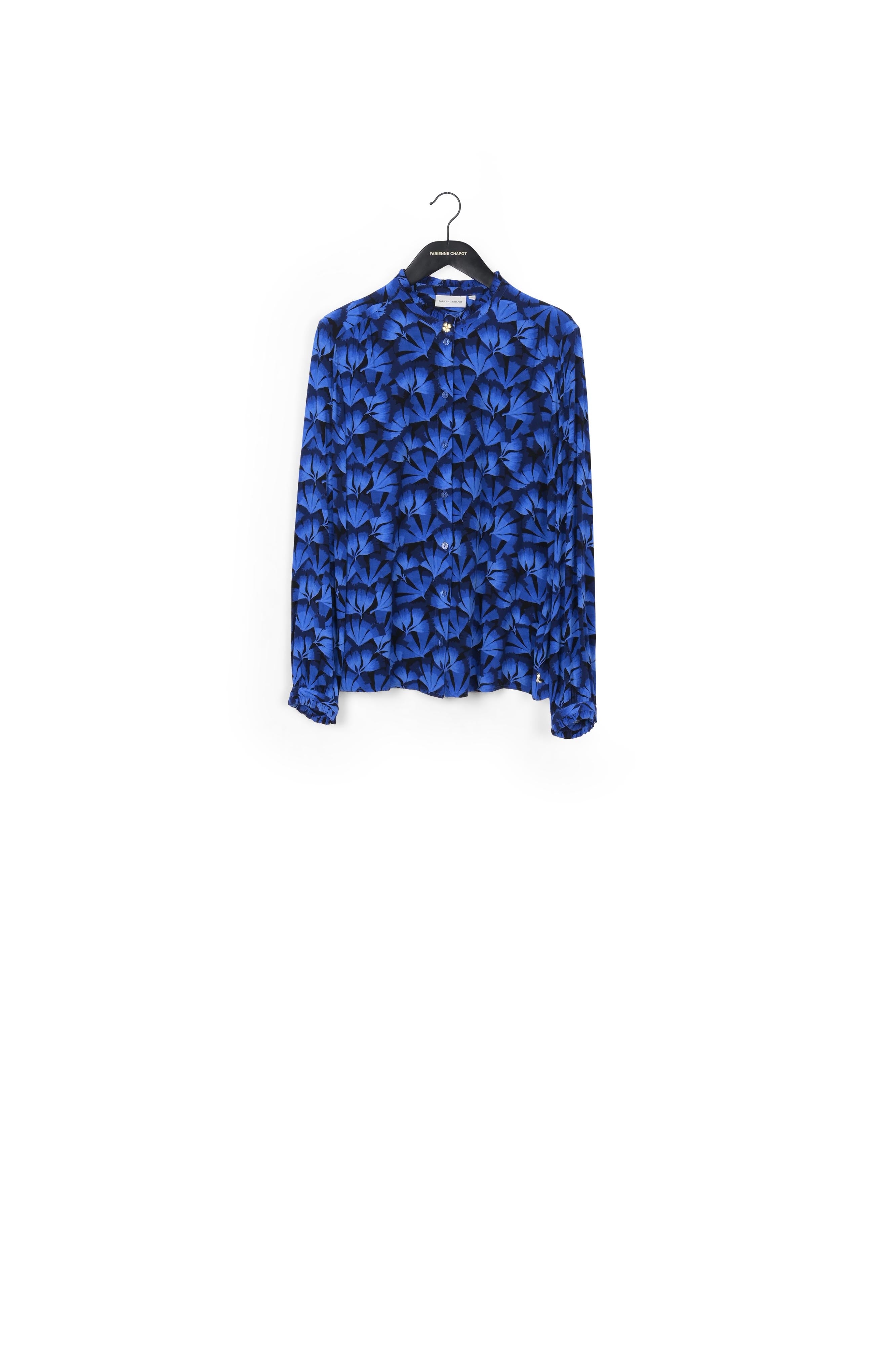 Blouse with small ruffles at the collar and at the end of the cuffs. Garden blouse has a button closure and gold-coloured button on the hem.
