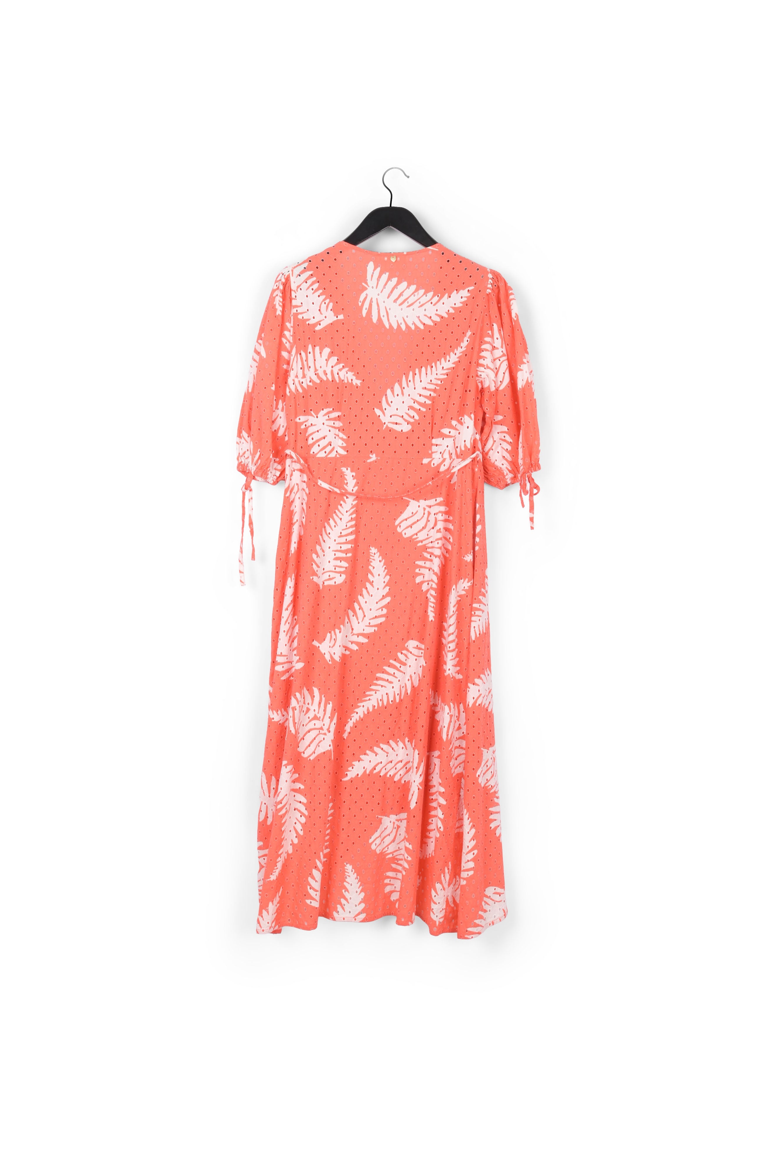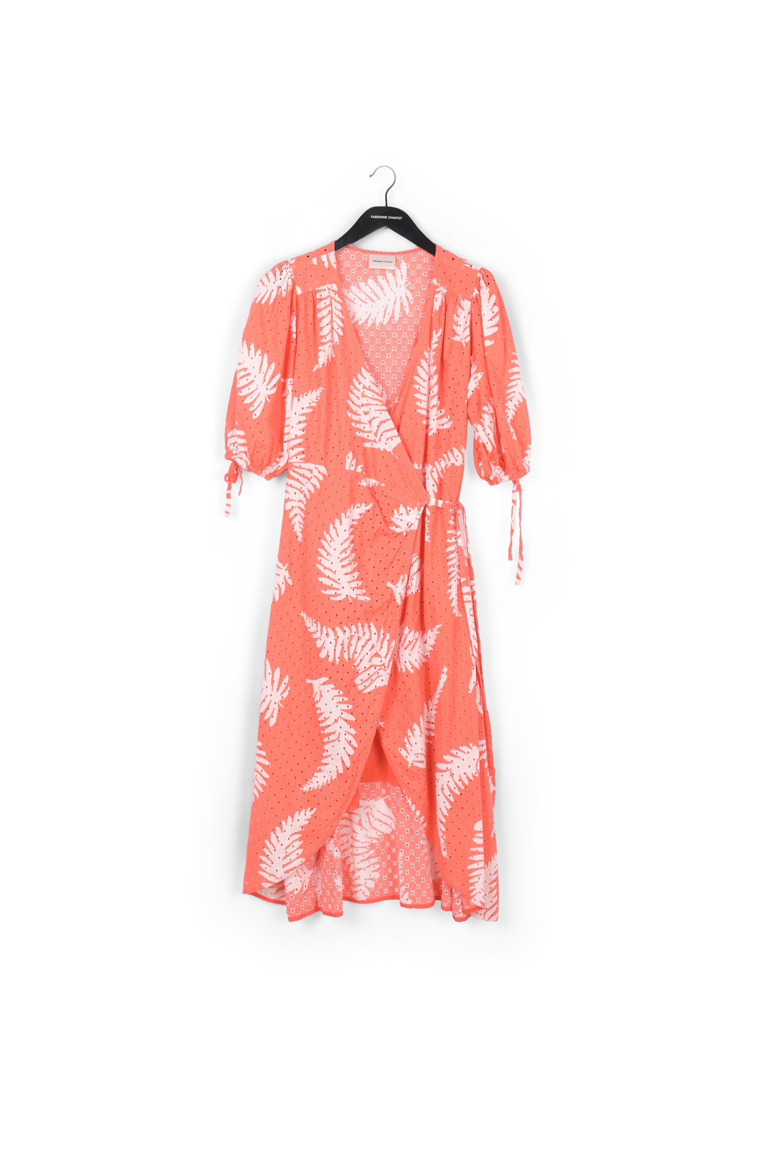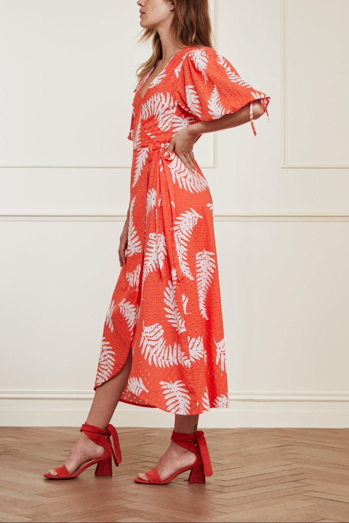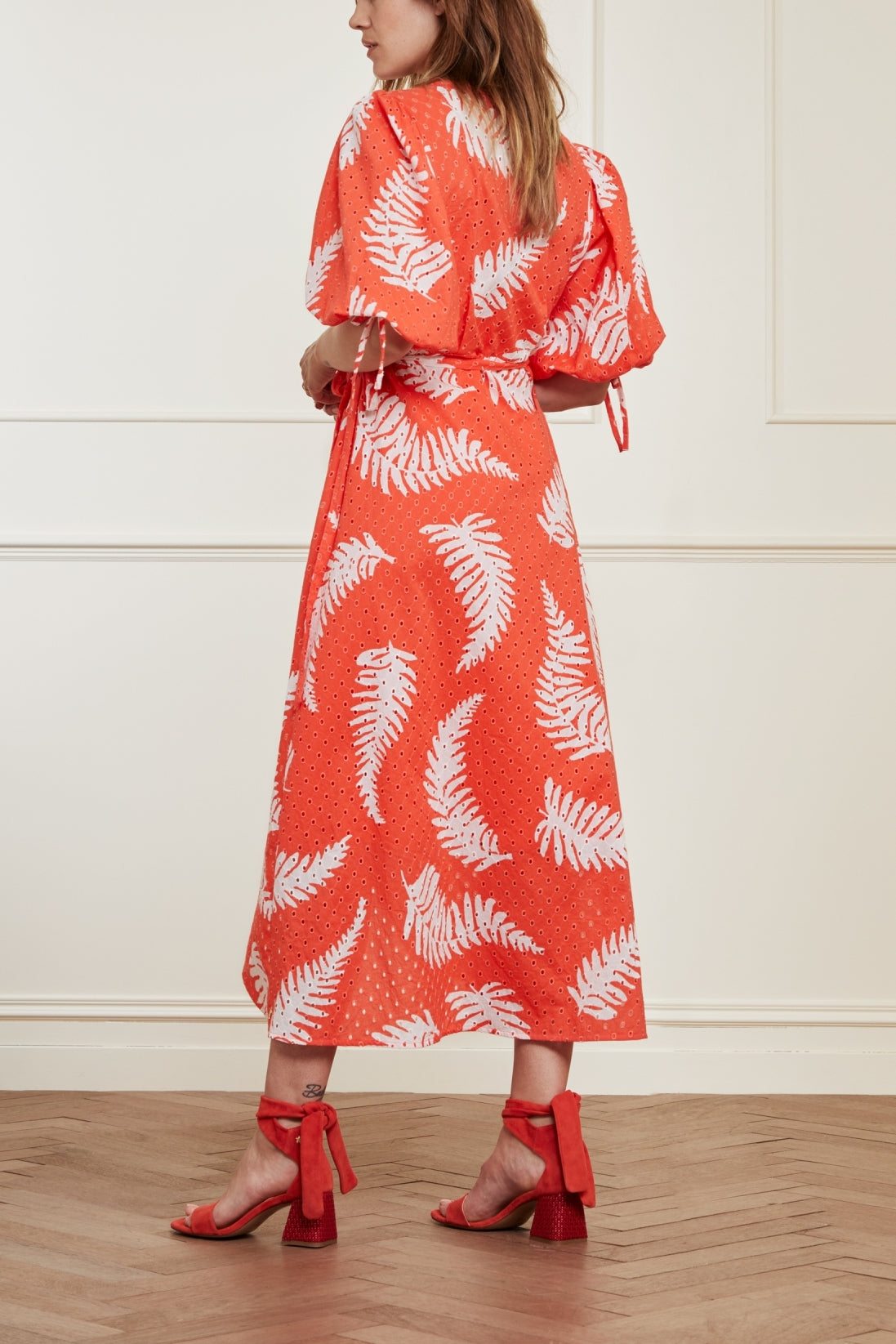 Midi wrap dress with short balloon sleeves, V-neckline and openwork details. Charlie Broderie Dress has an allover printed broderie anglaise fabric. -