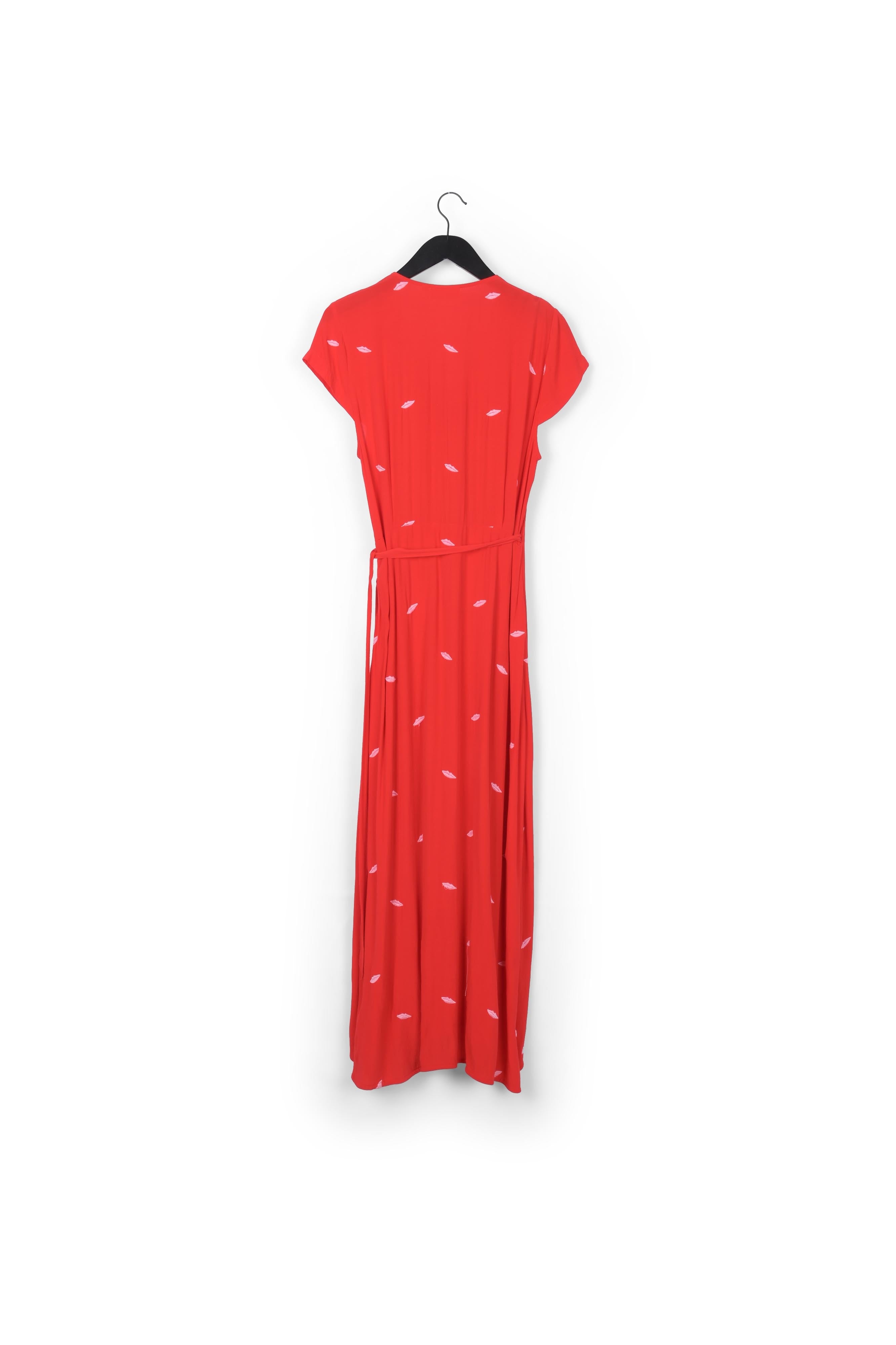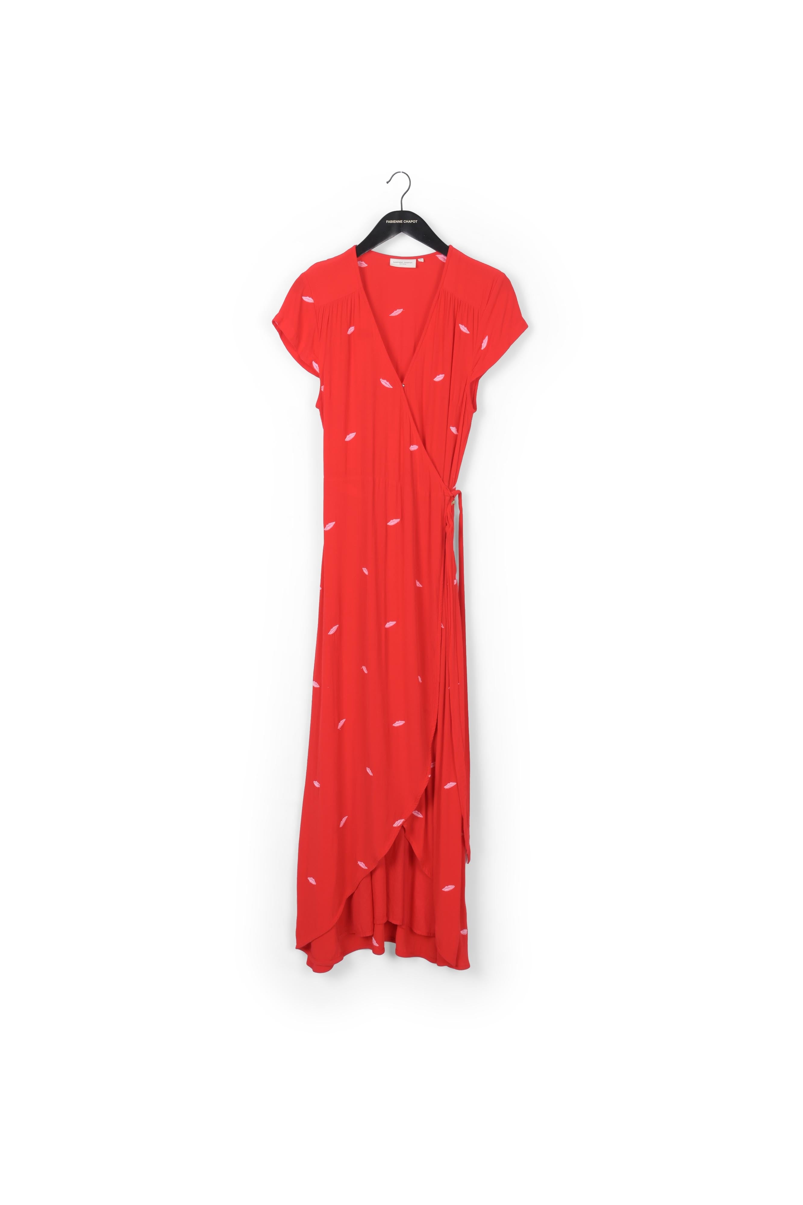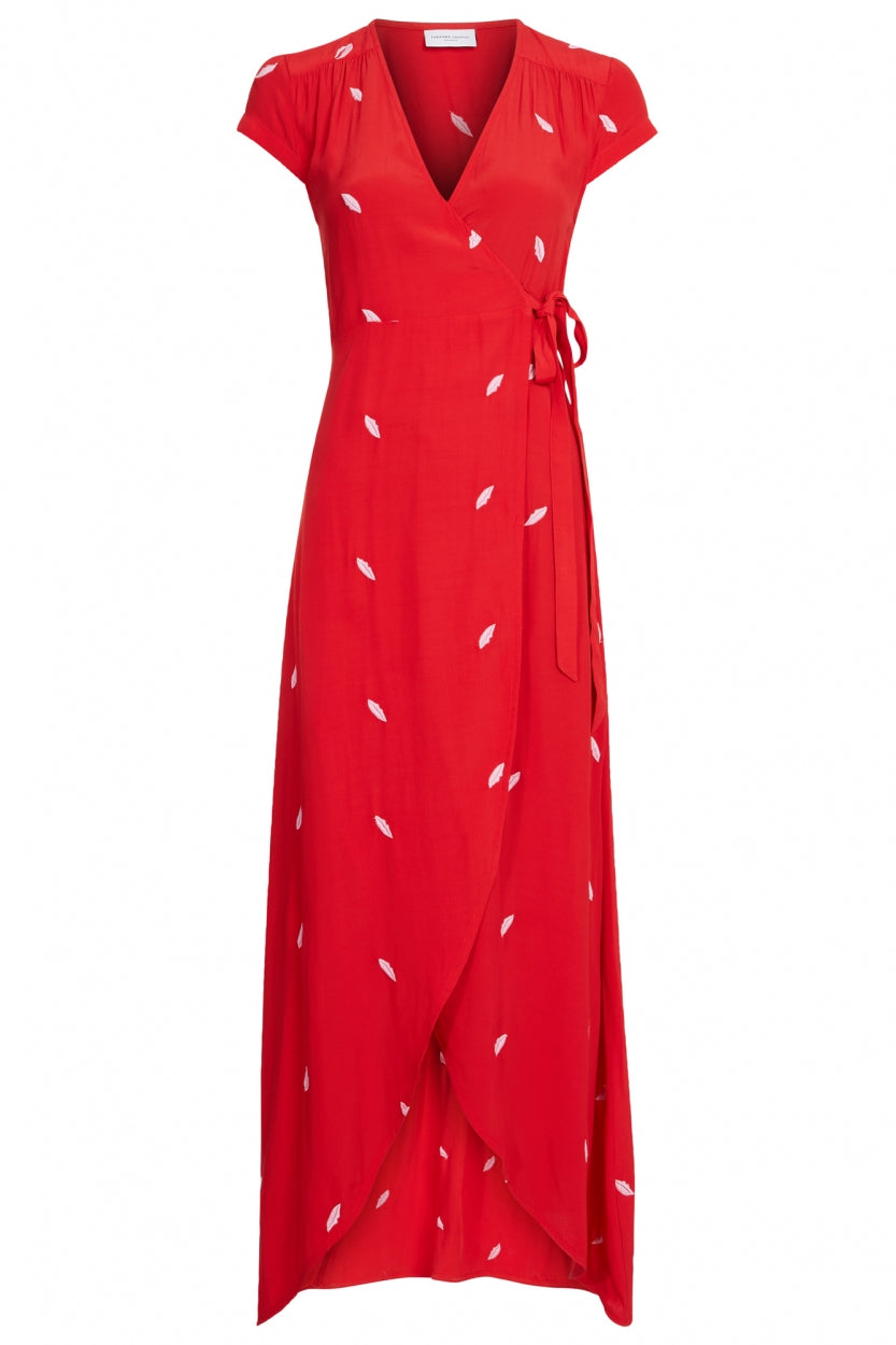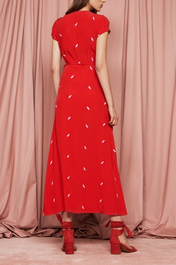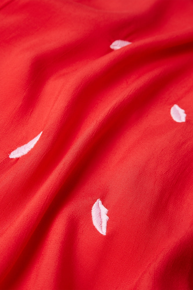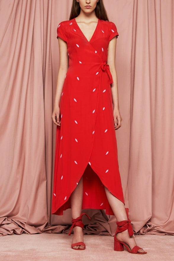 Italian summer nights and the perfect dress. You totally see yourself sipping that aperitivo right? Salute! Flowing wrap dress with V neck, short sleeves and shorter front panel. Archana Embroidery Dress has a secret button at the décolleté and a hand-embroidered 'Loco Lips' print.