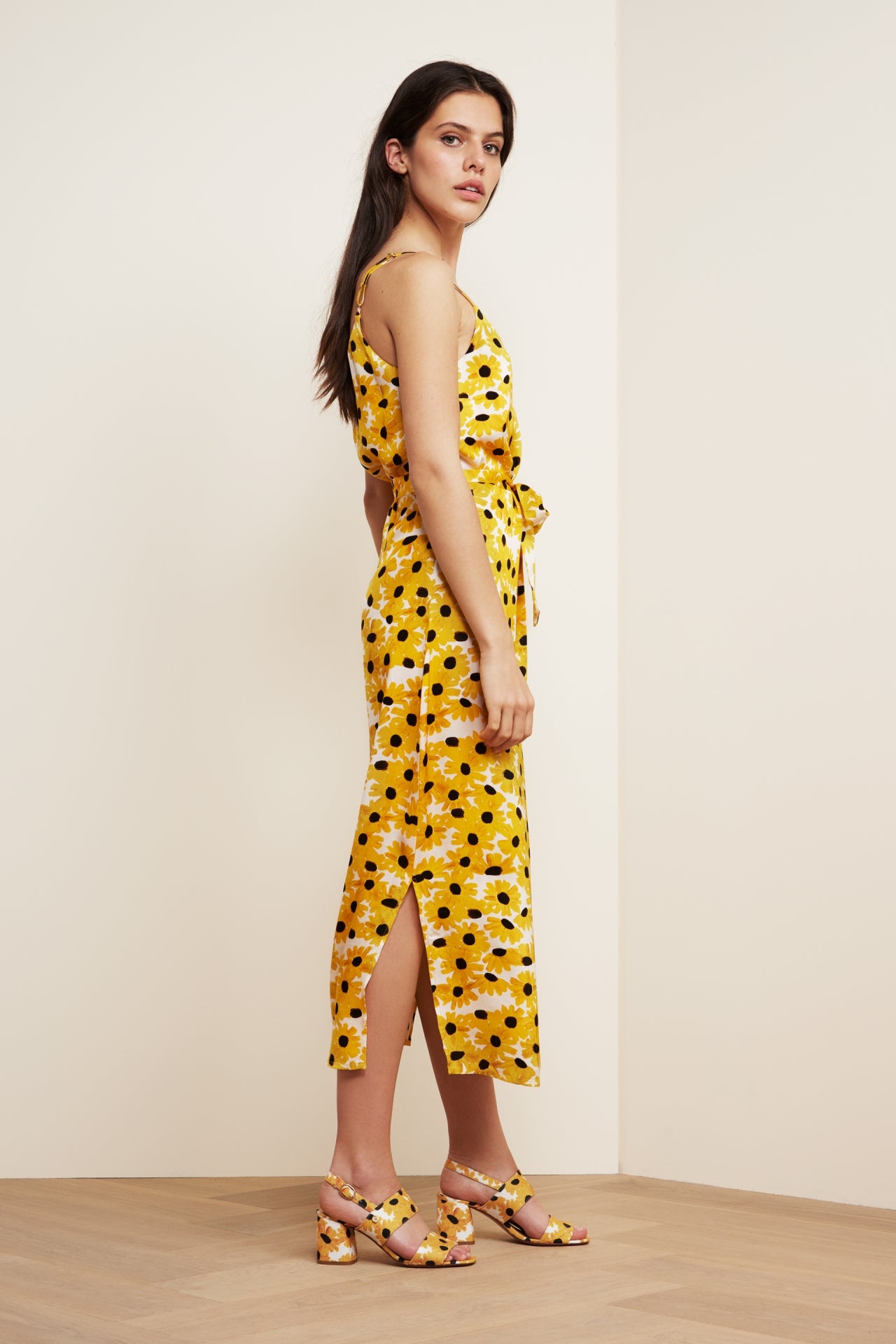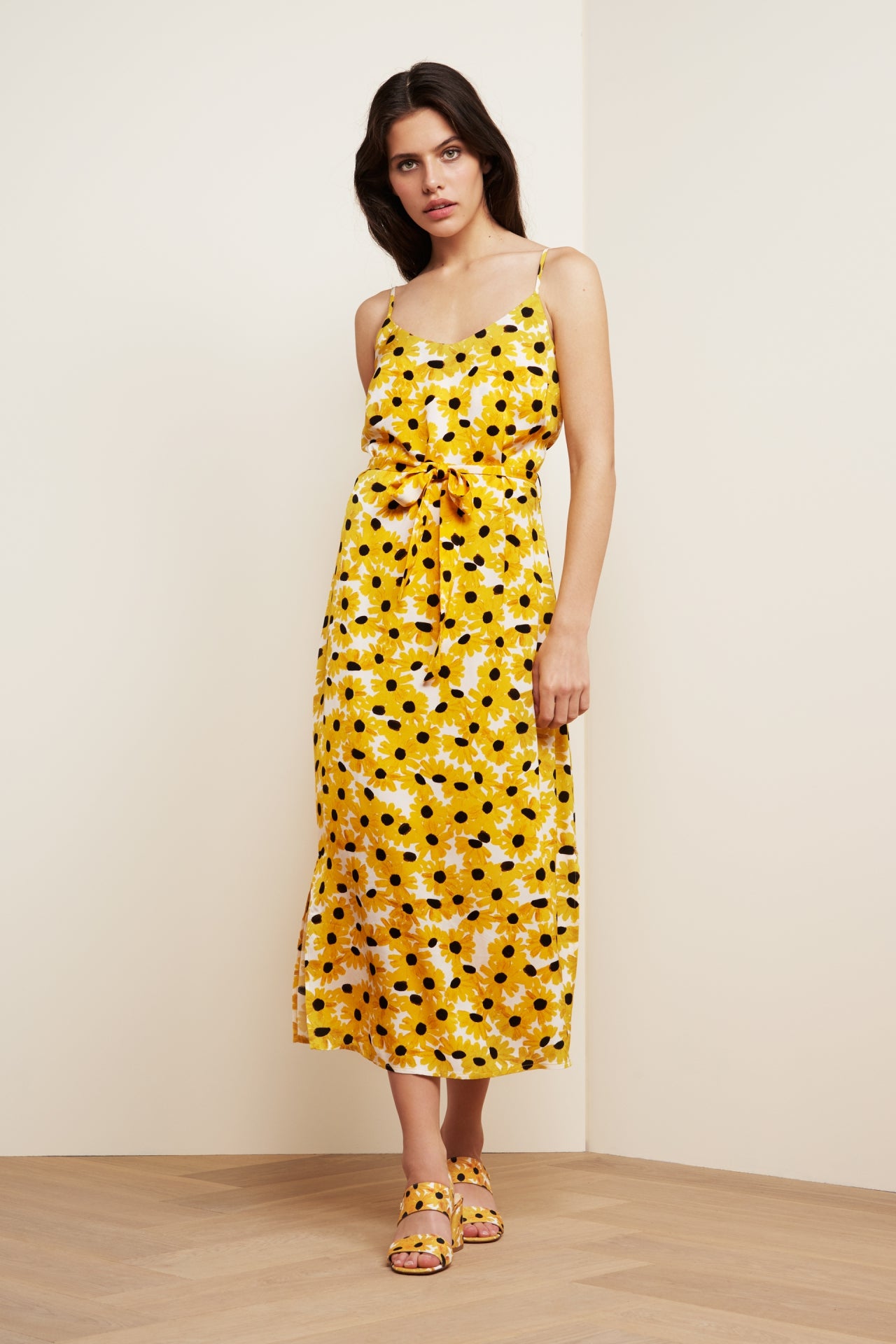 Flowing dress with a round neck, spaghetti straps and tie belt. Sun Set Dress has a split on both sides. -