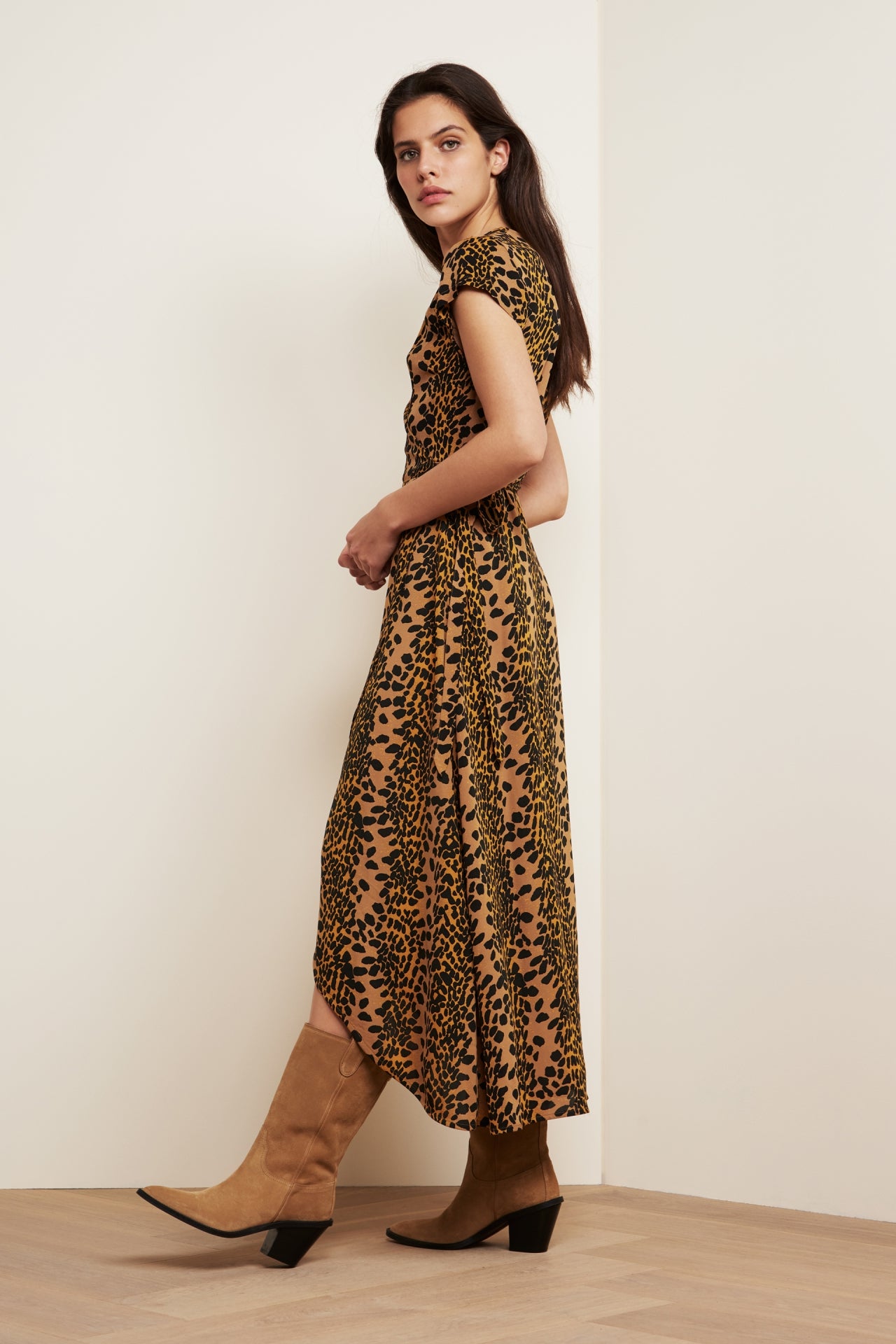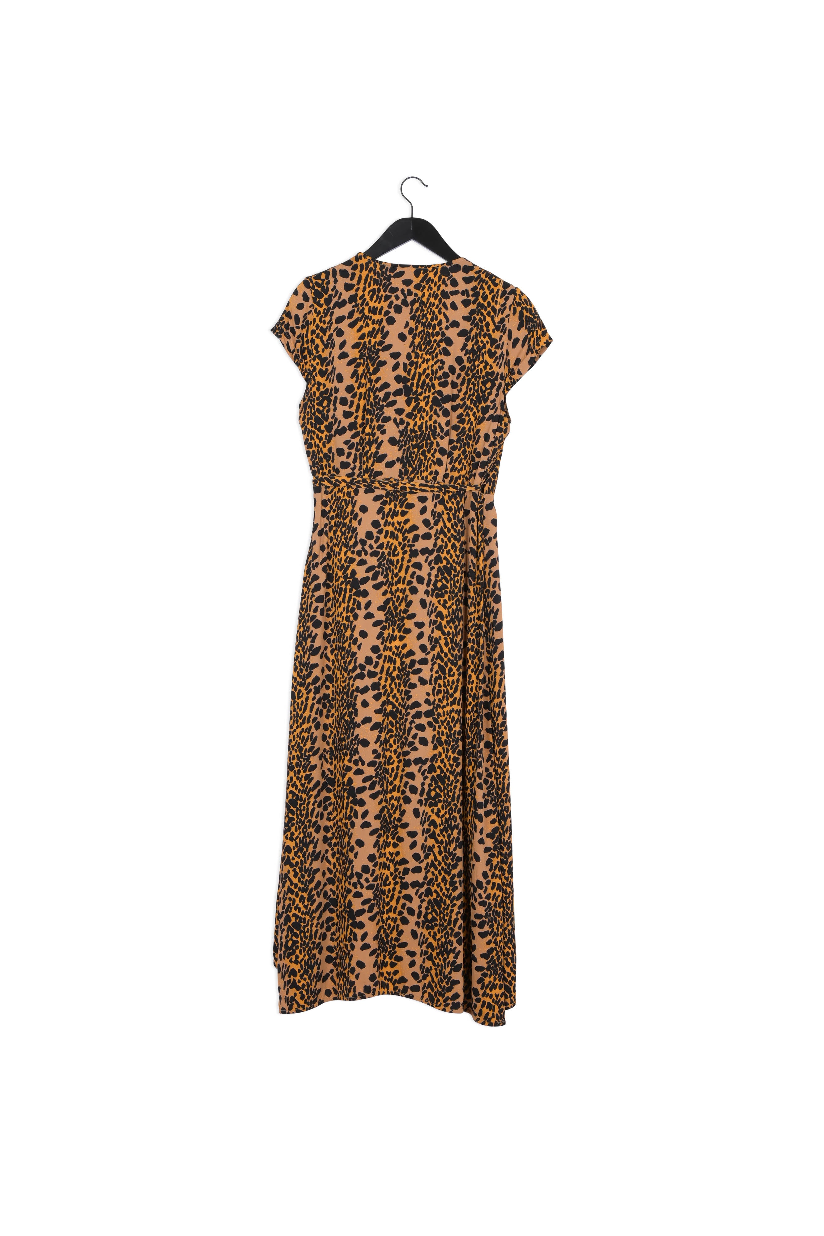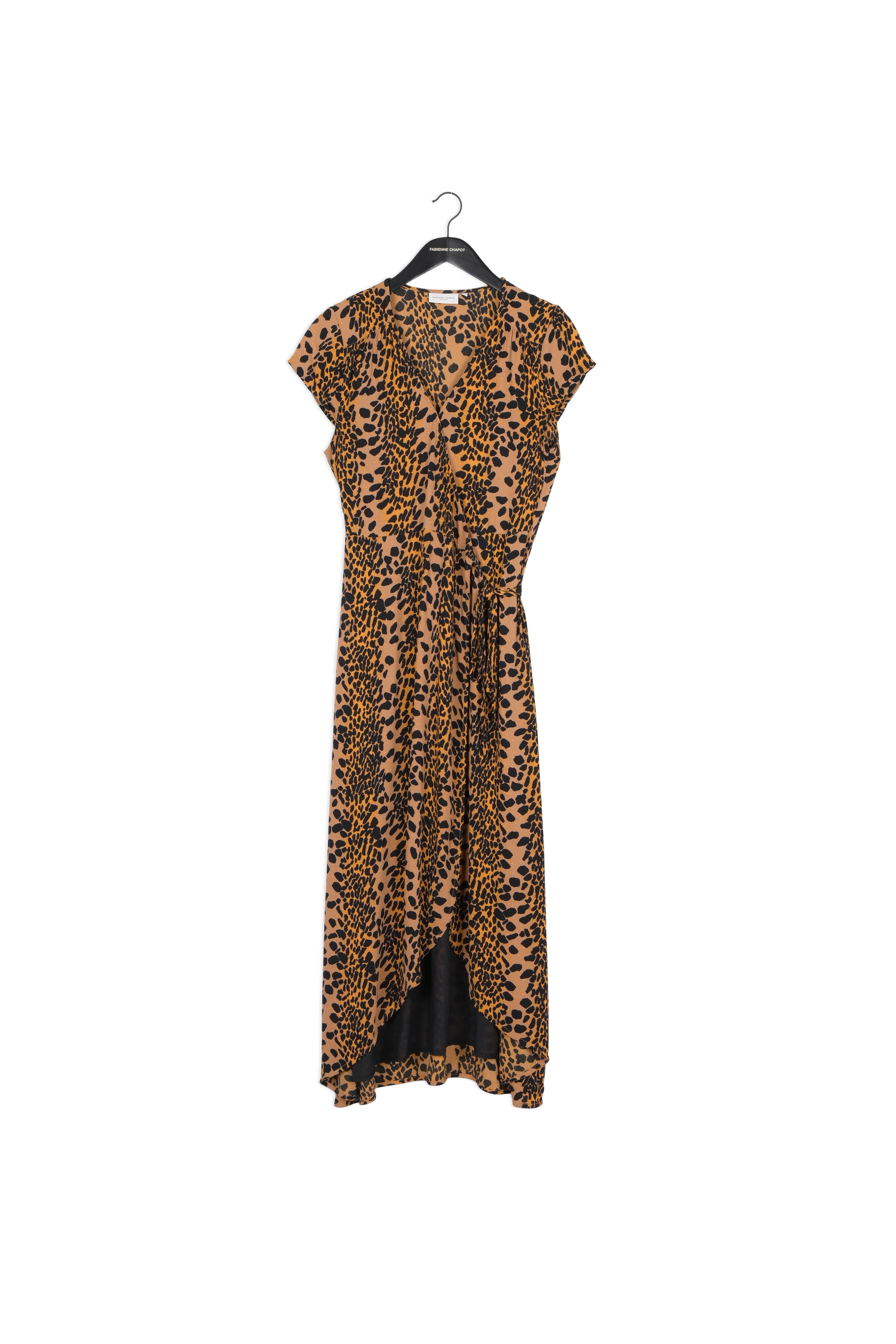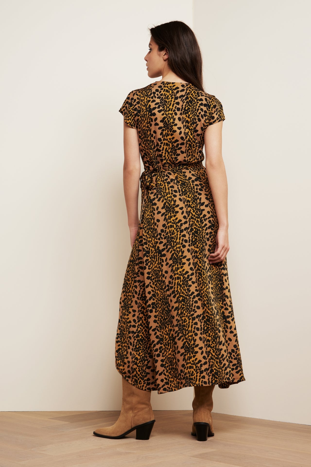 Flowing wrap dress with V neck, short sleeves and shorter front panel. Archana Dress has a secret button at the decolleté and inner lining in the skirt. -