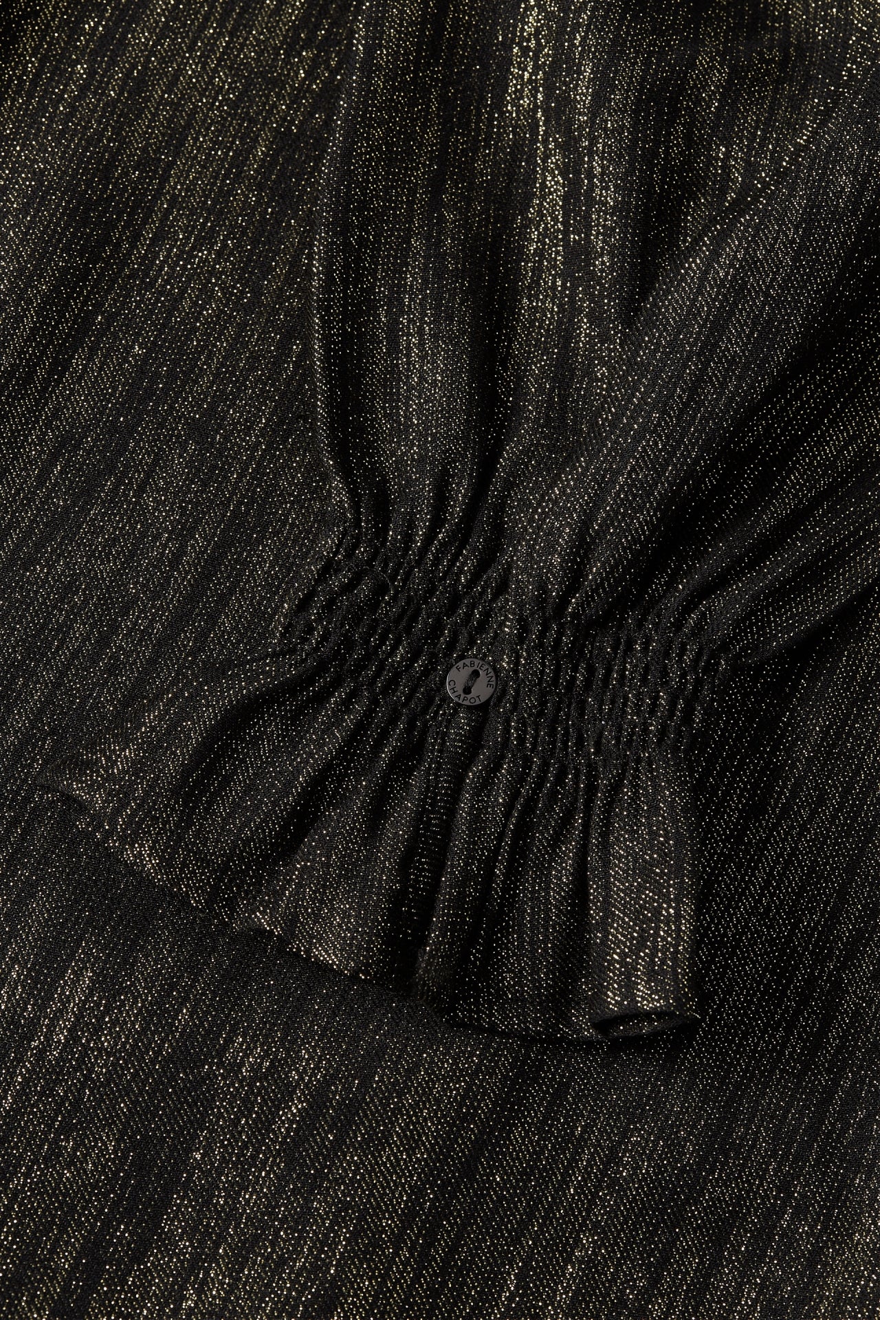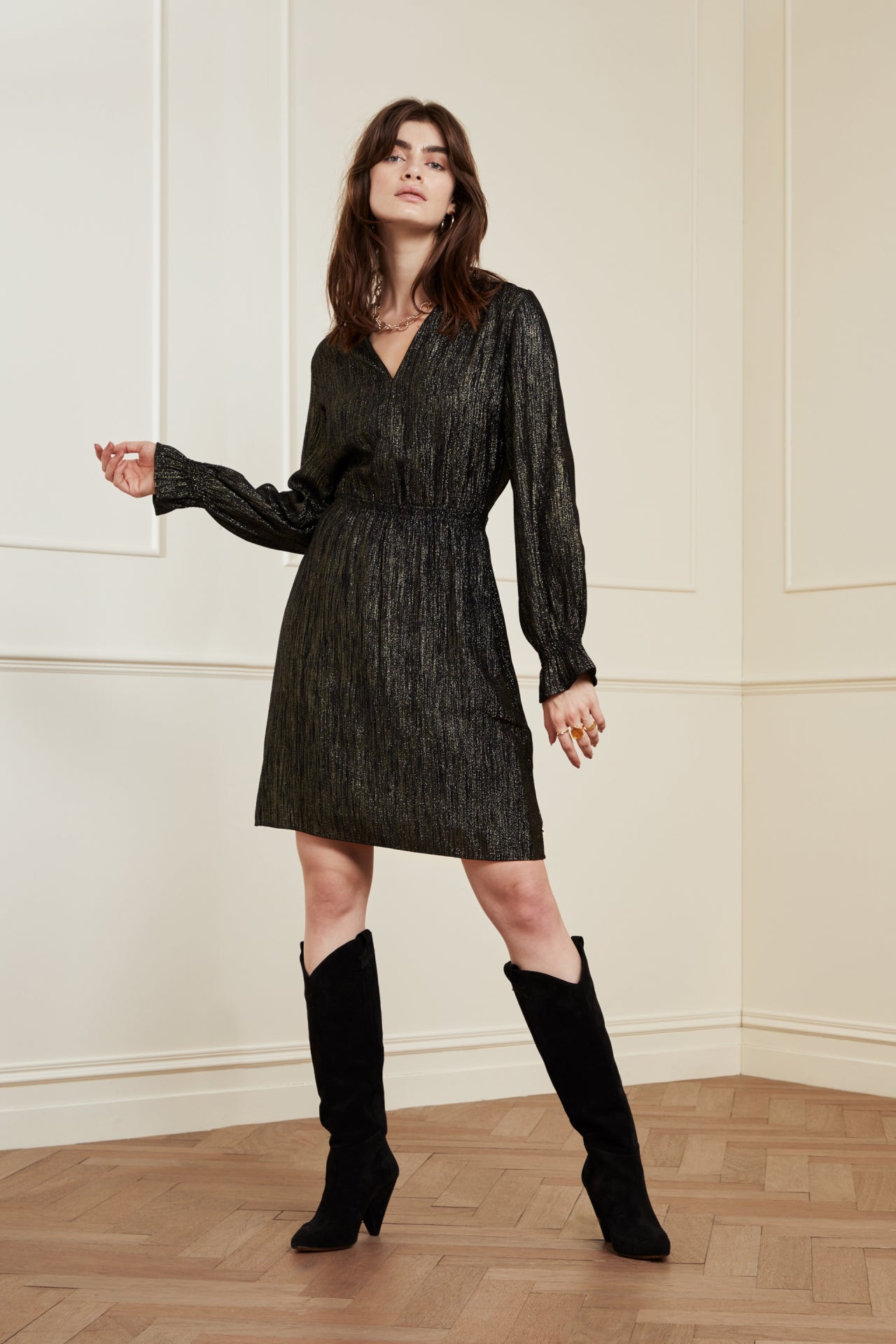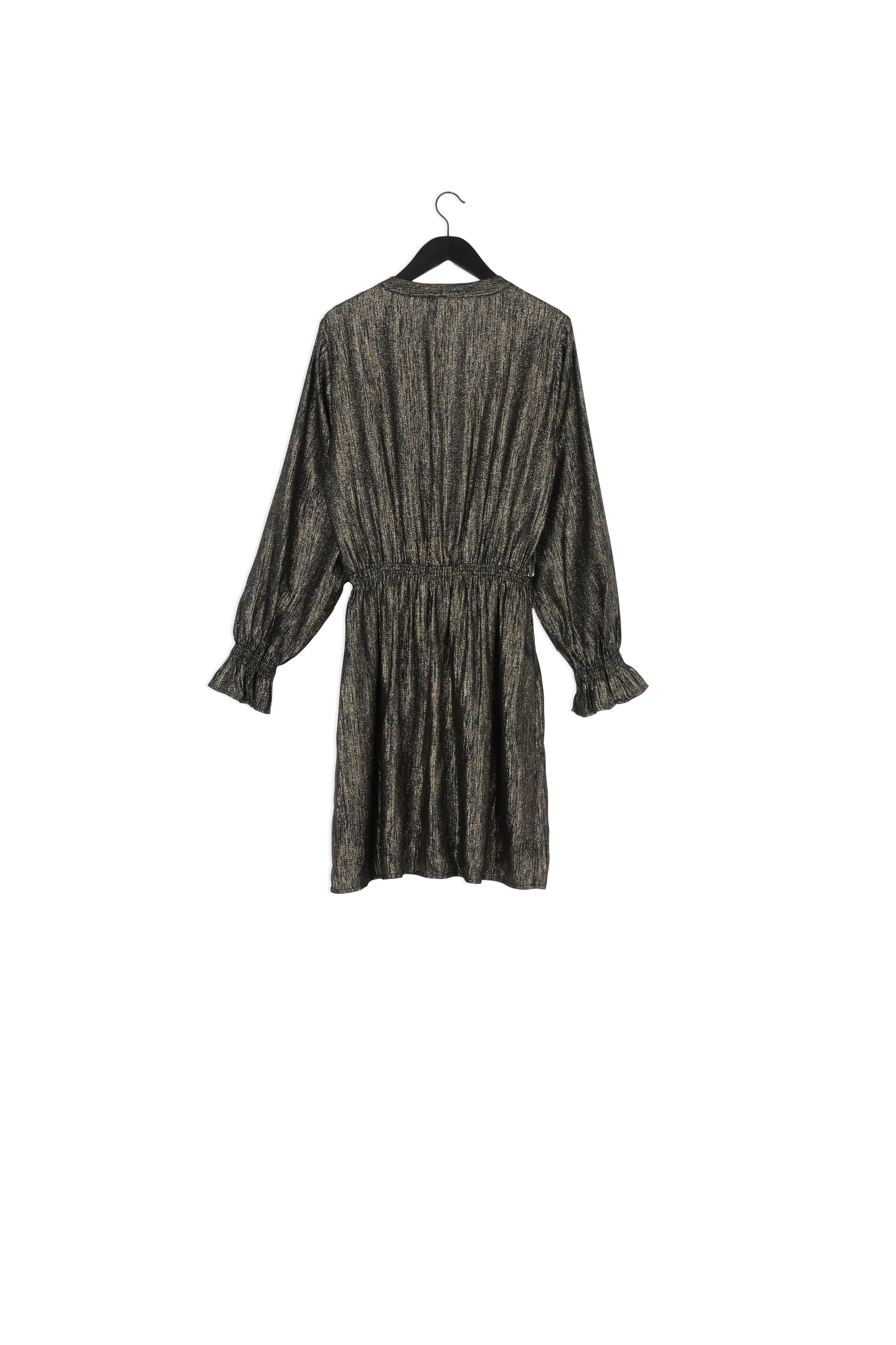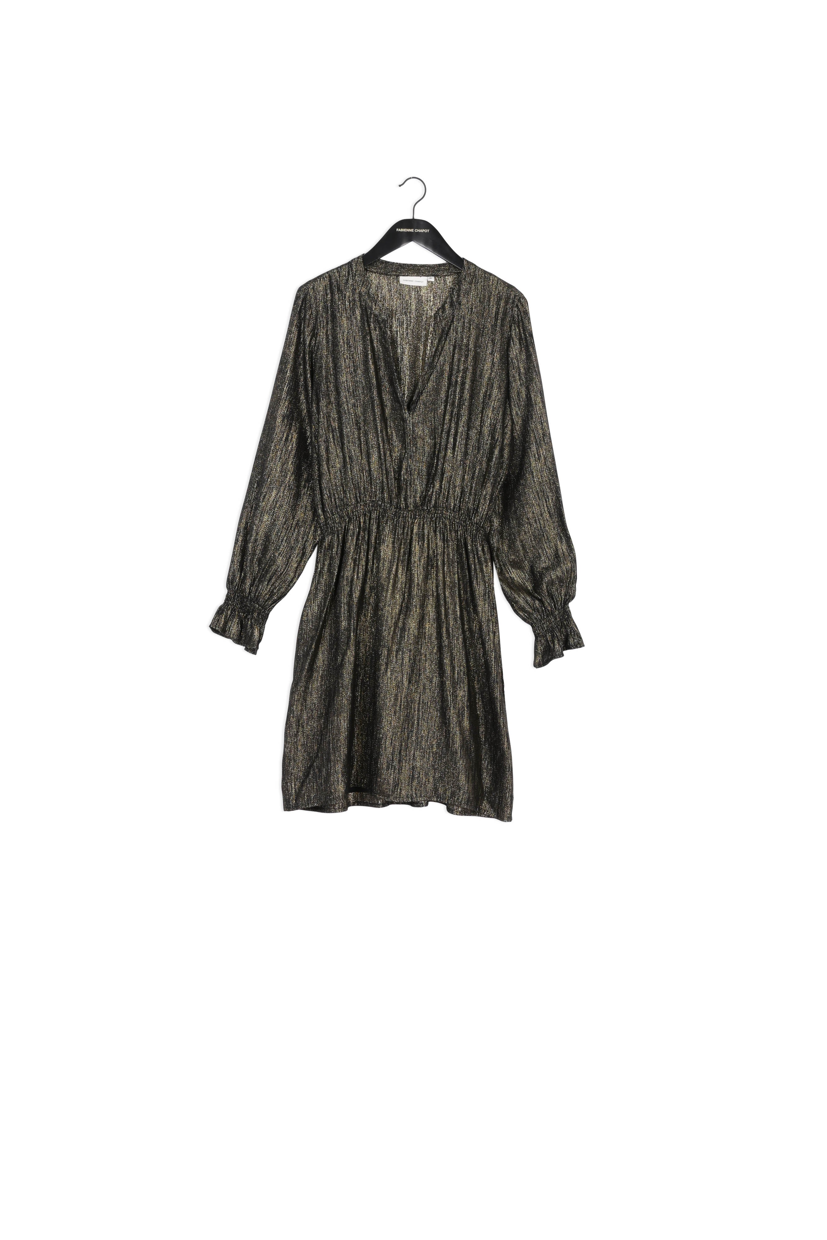 Short dress with V-neck and smocked cuffs. Studio Dress has elastic in the waist and golden lurex details woven through the fabric. -