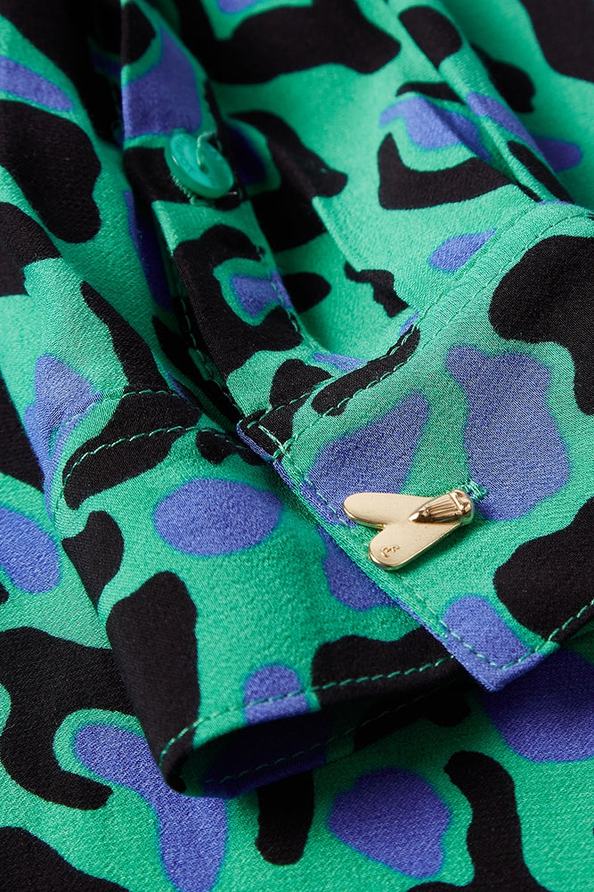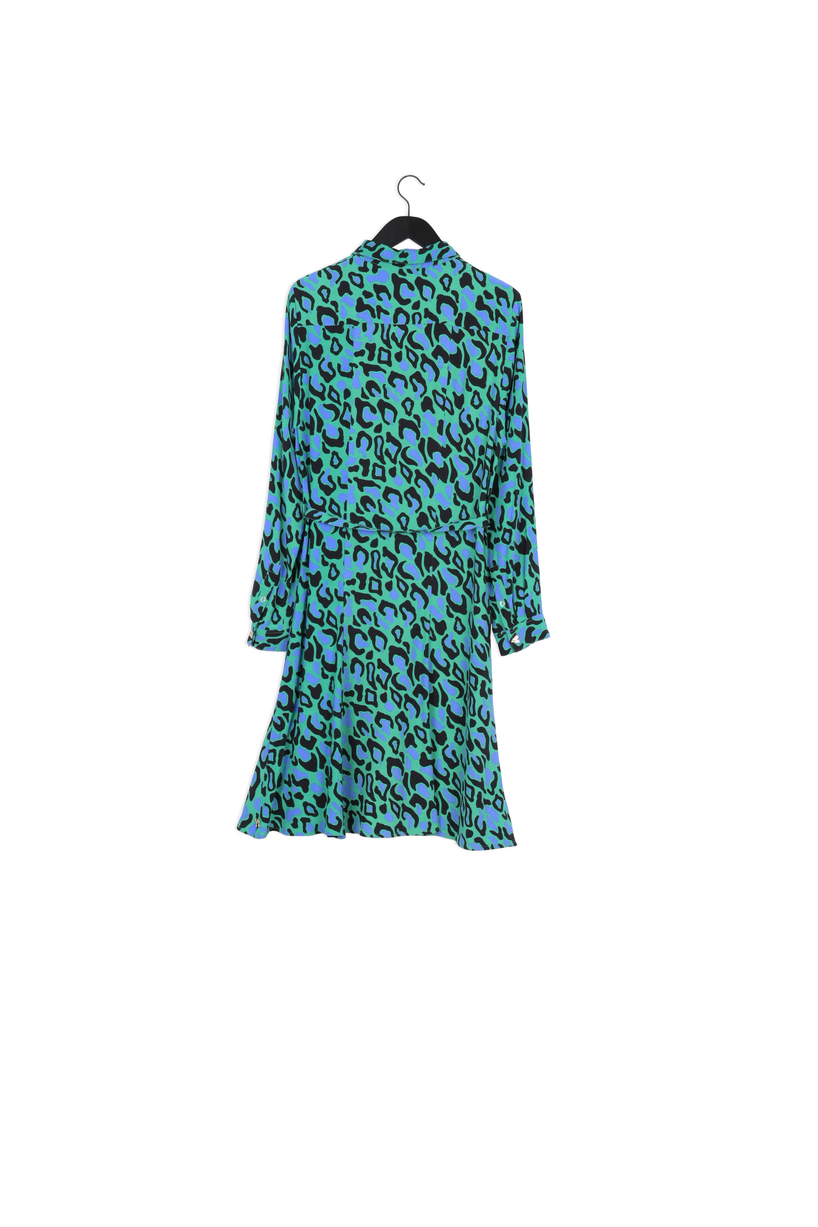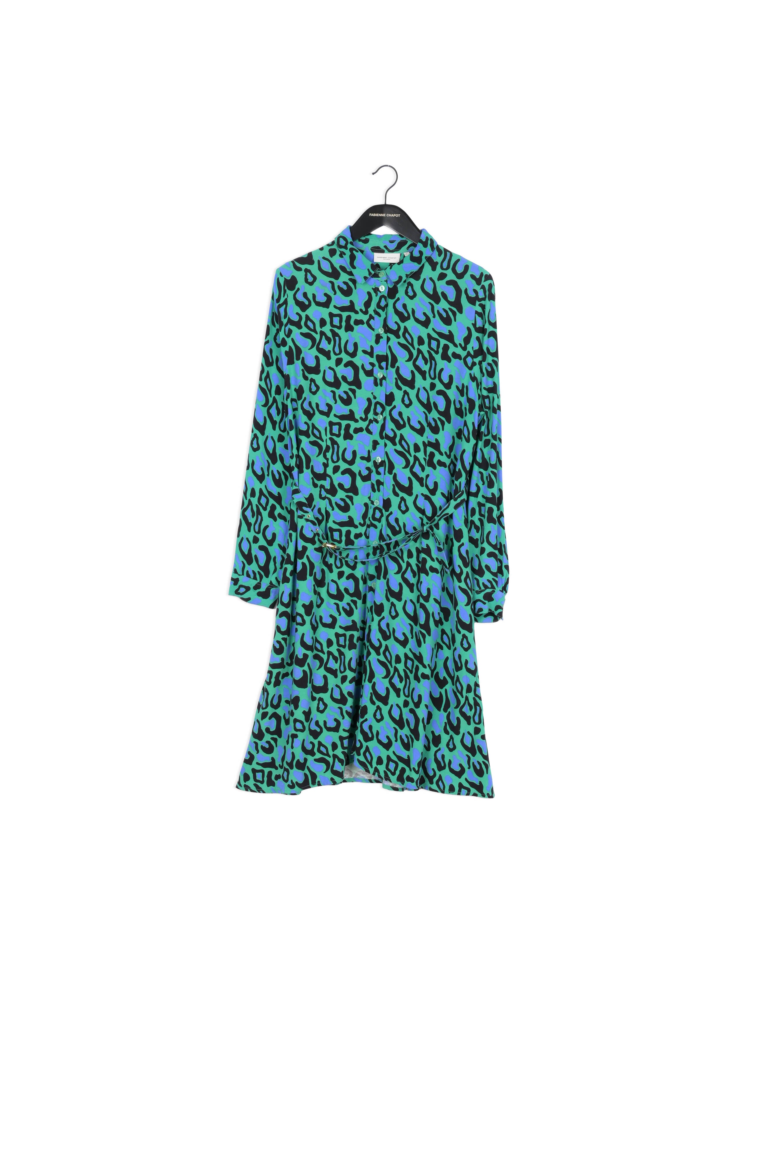 Flowing midi dress with waist belt and long sleeves. Hayley Dress has a button closure down the length of the dress and a gold-coloured button shaped like a fly on the cuffs.