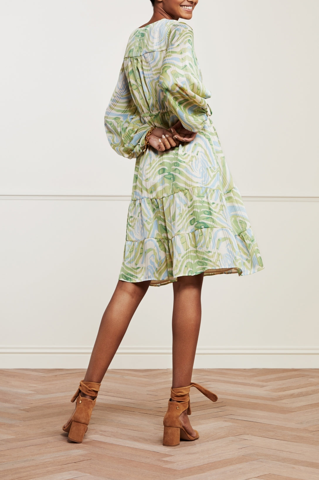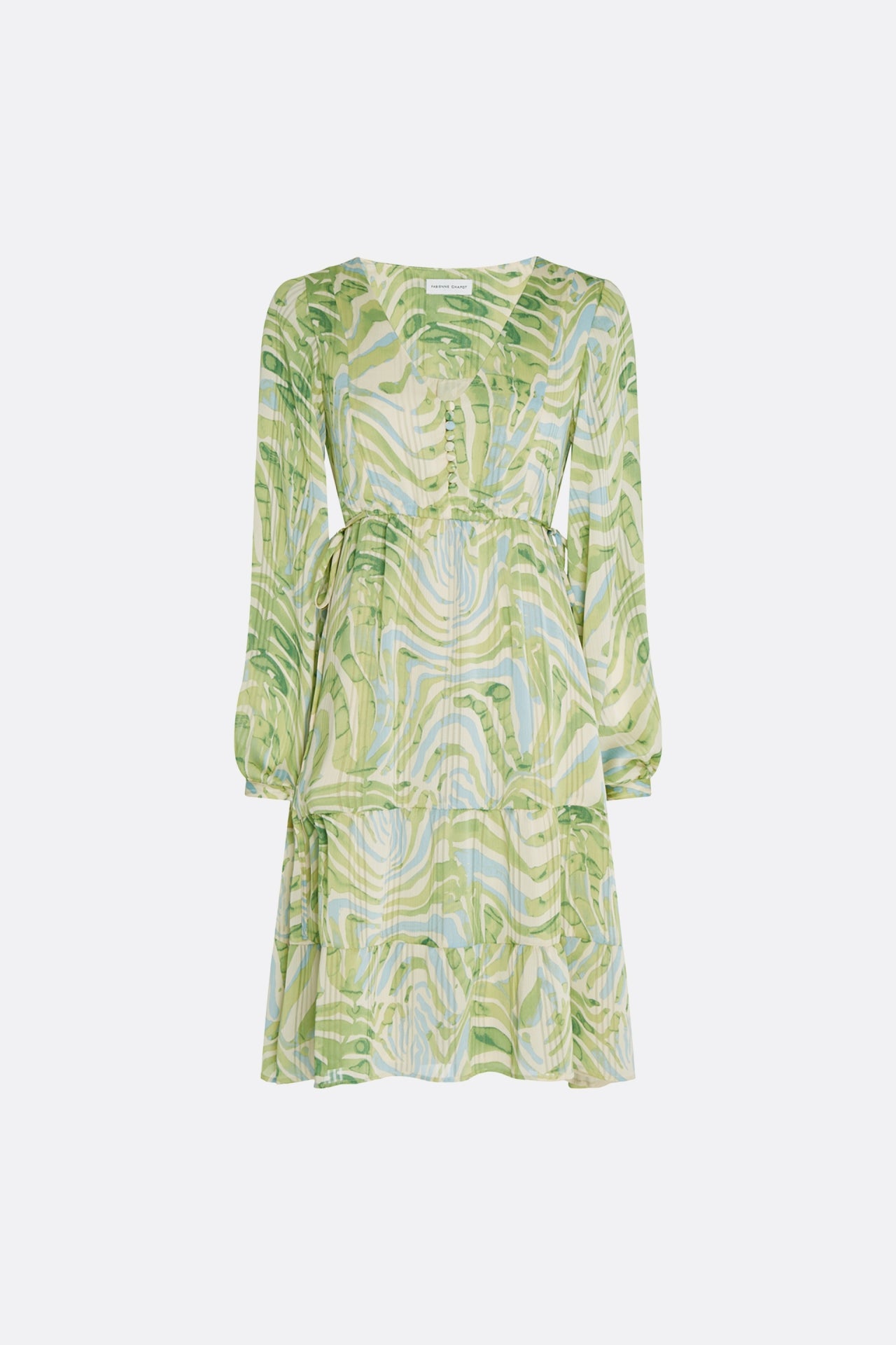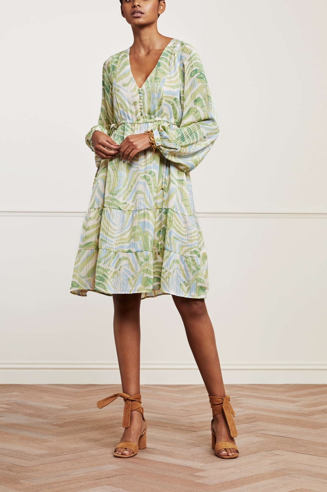 Dress with a V-neck and a button closure up to the waist. Lola Dress has puffed sleeves and a waist belt which you can tie in two different ways: at the back or at the side. This item is made from recycled plastic bottles (rPet): supple, soft and easy to care for. Discover how many bottles are recycled to make your garment inside the care label. -