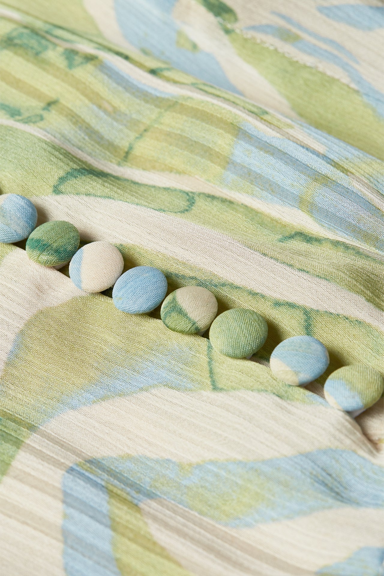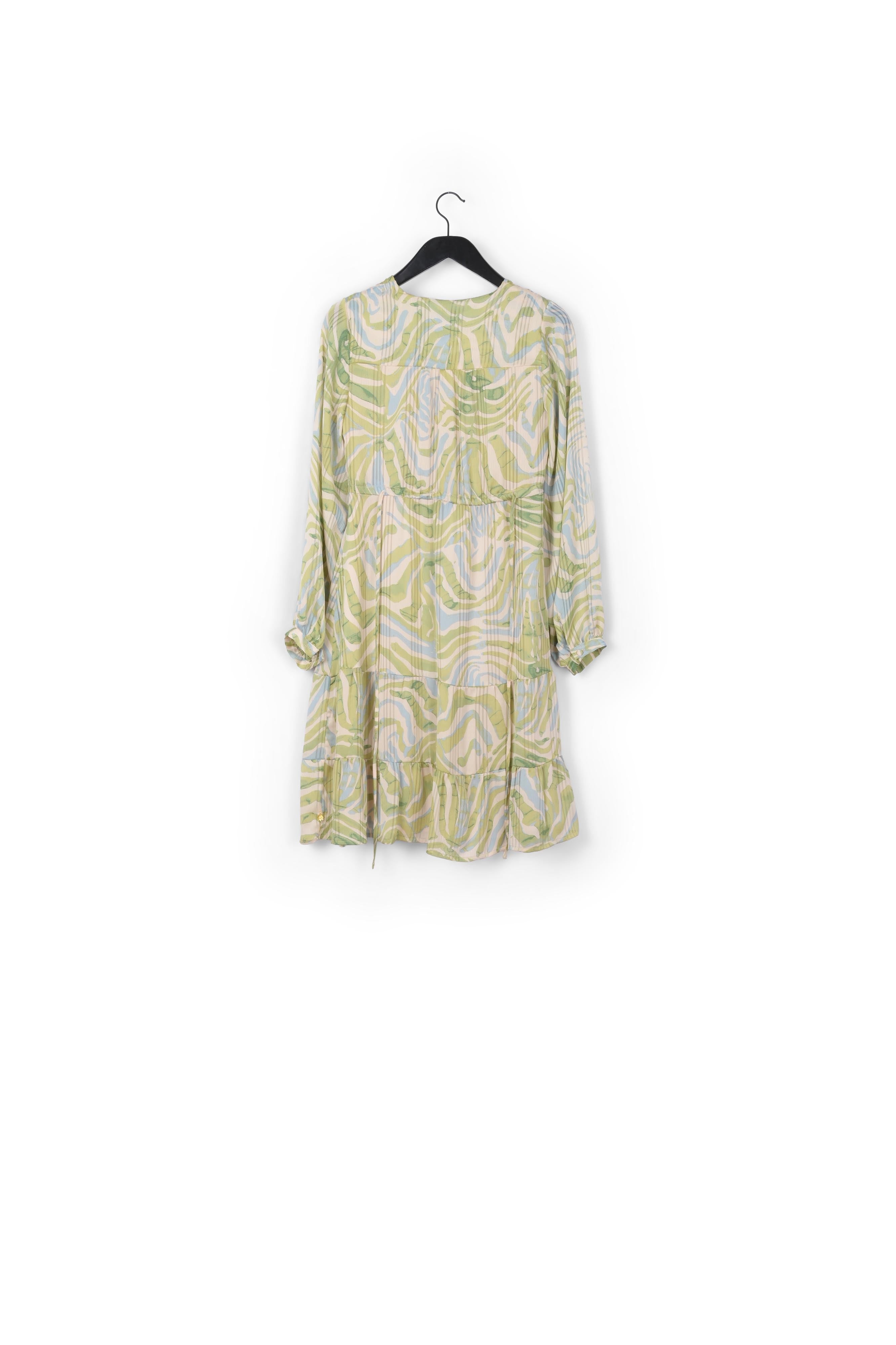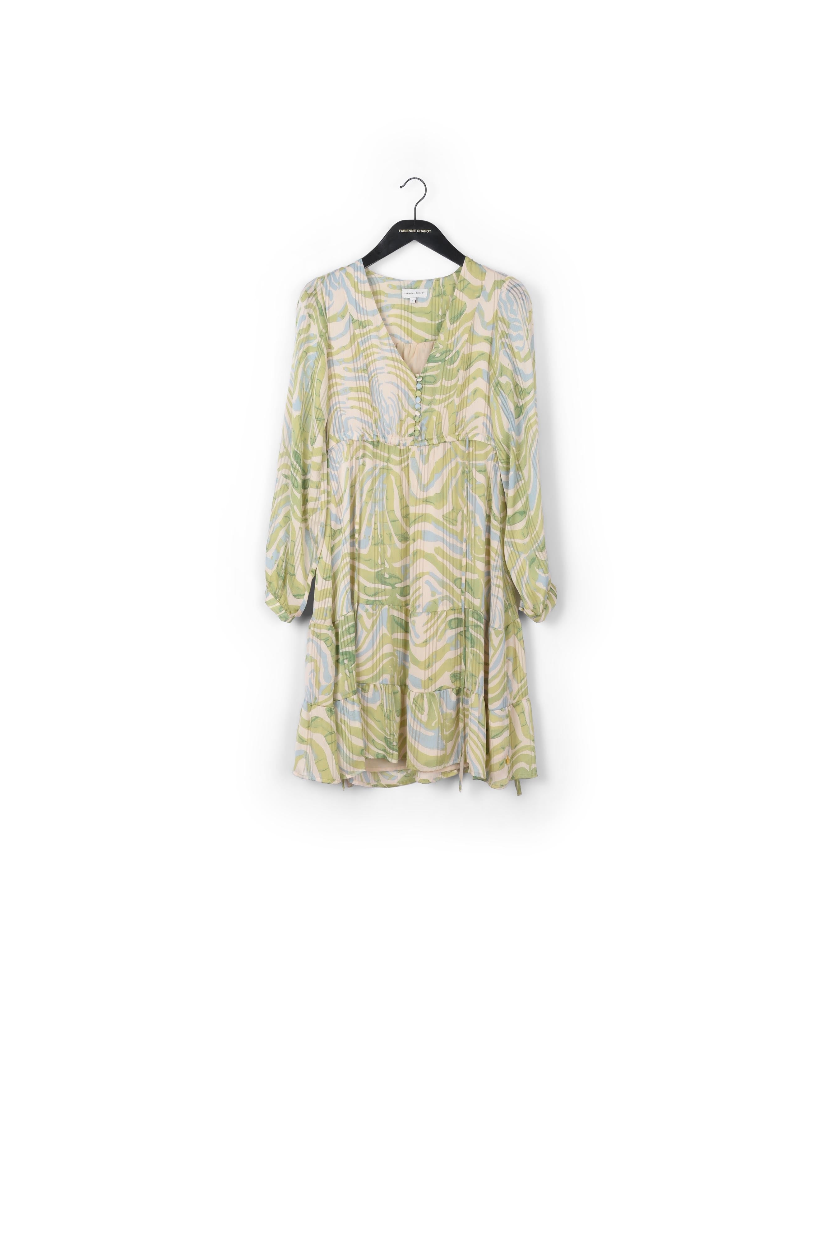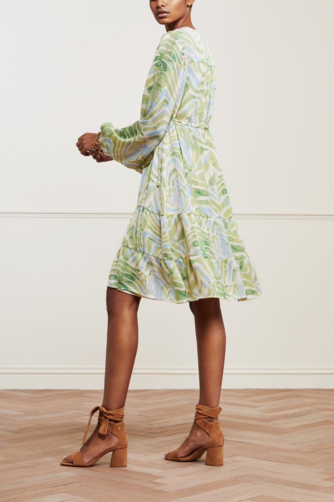 Dress with a V-neck and a button closure up to the waist. Lola Dress has puffed sleeves and a waist belt which you can tie in two different ways: at the back or at the side. This item is made from recycled plastic bottles (rPet): supple, soft and easy to care for. Discover how many bottles are recycled to make your garment inside the care label. -