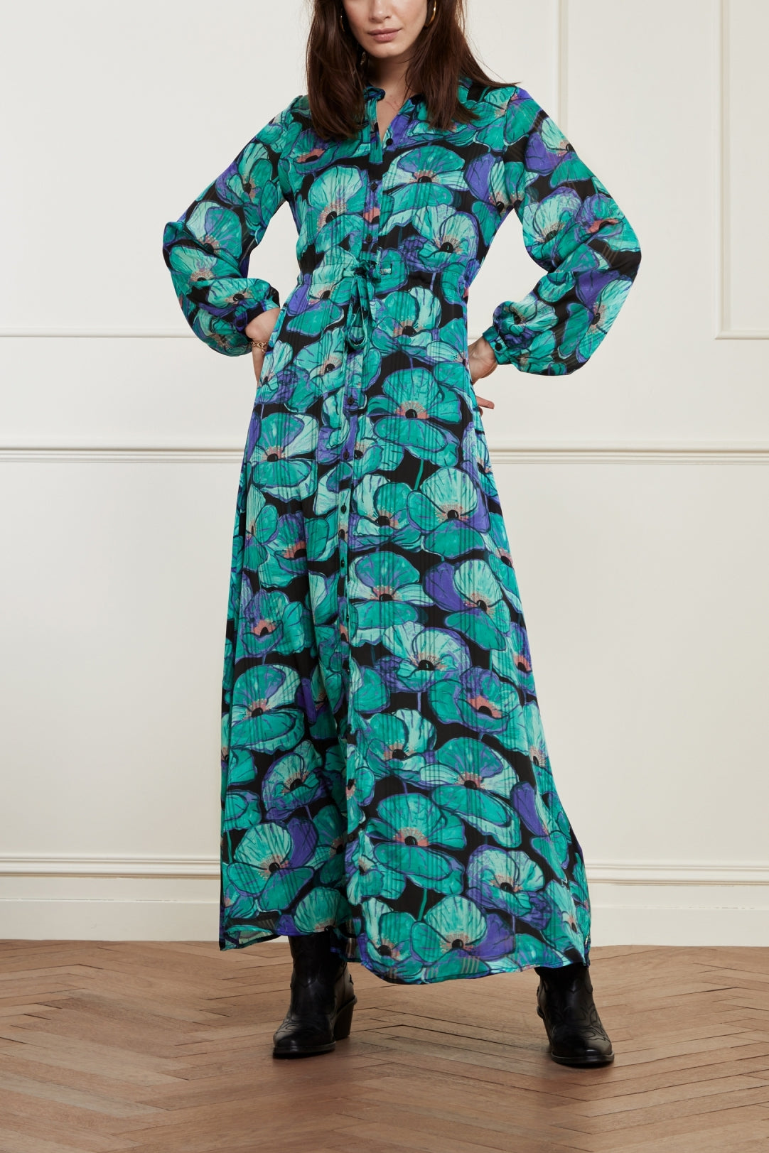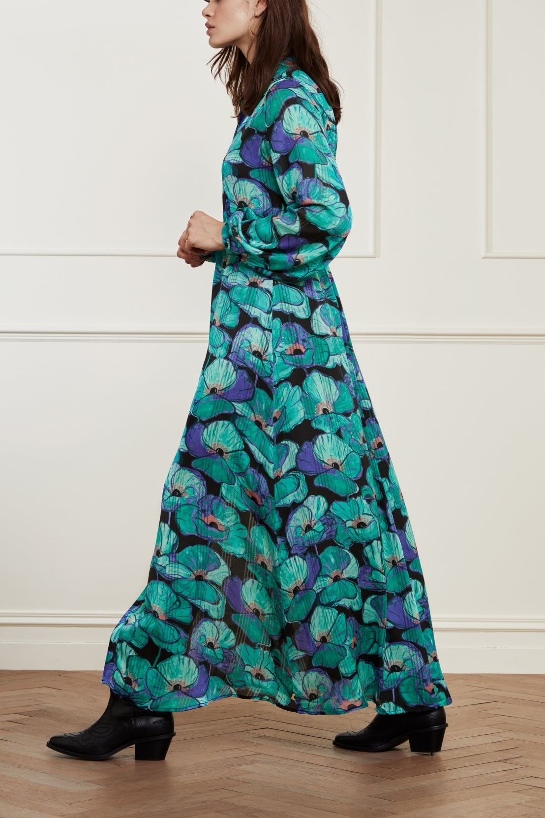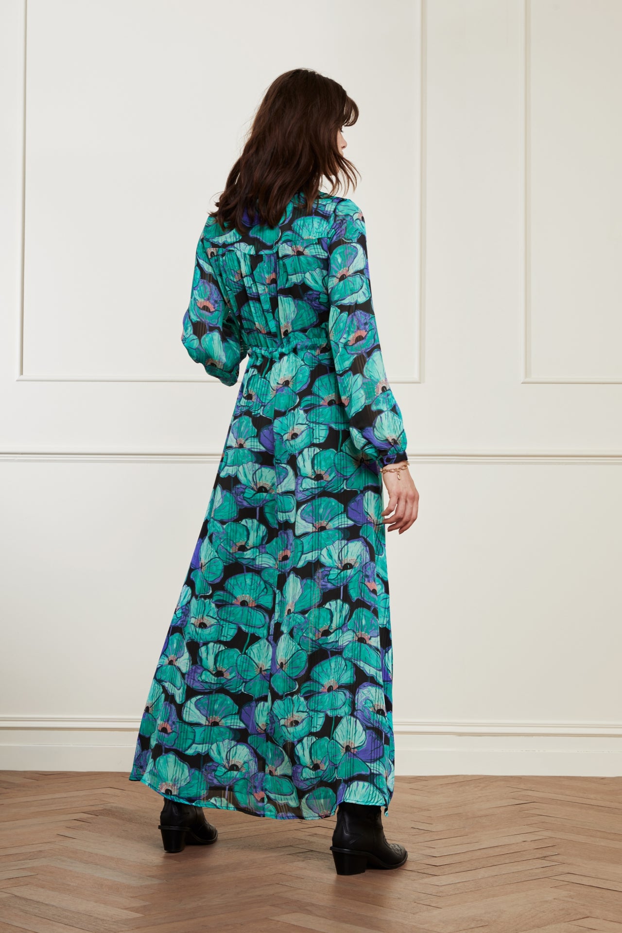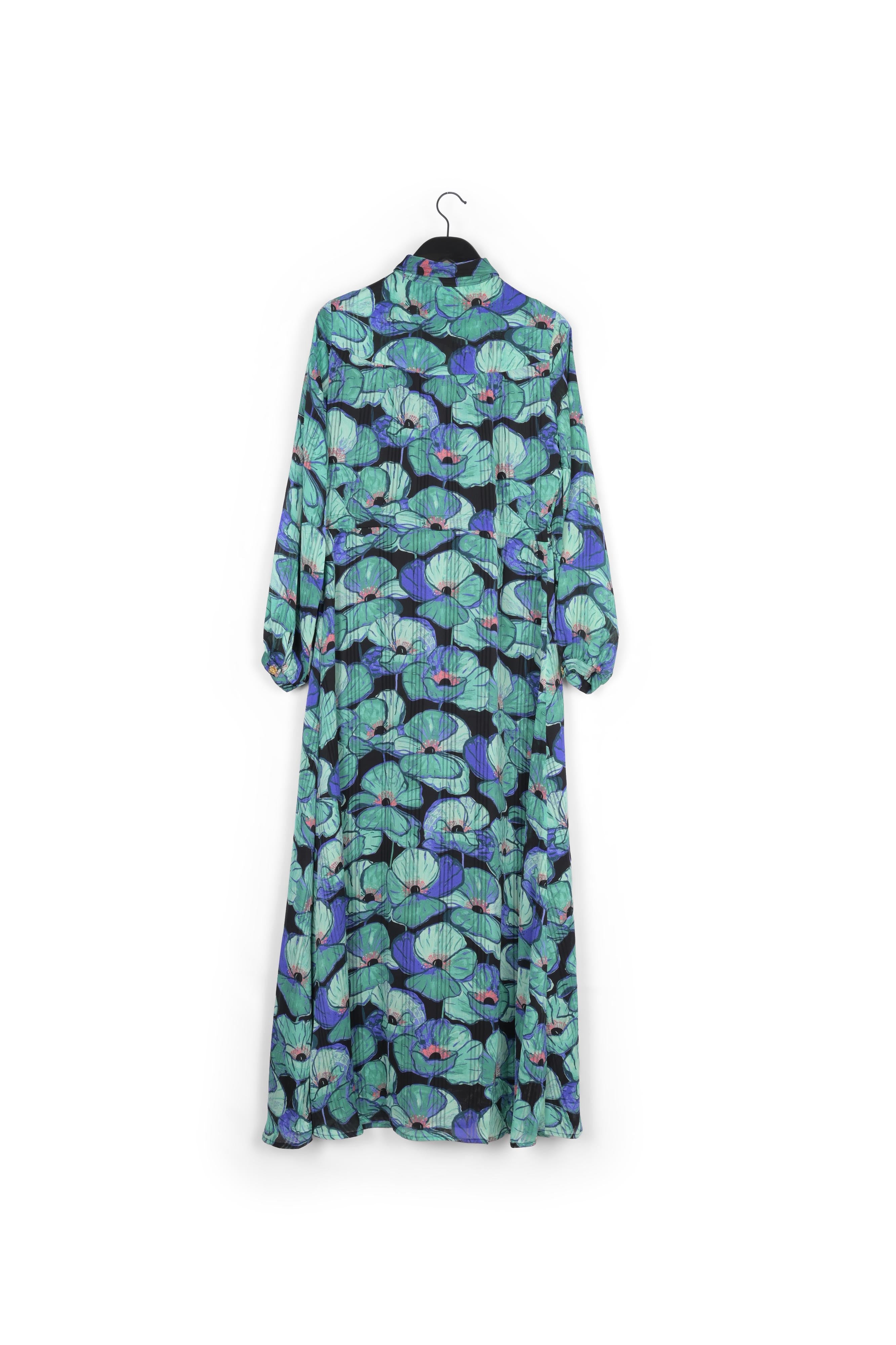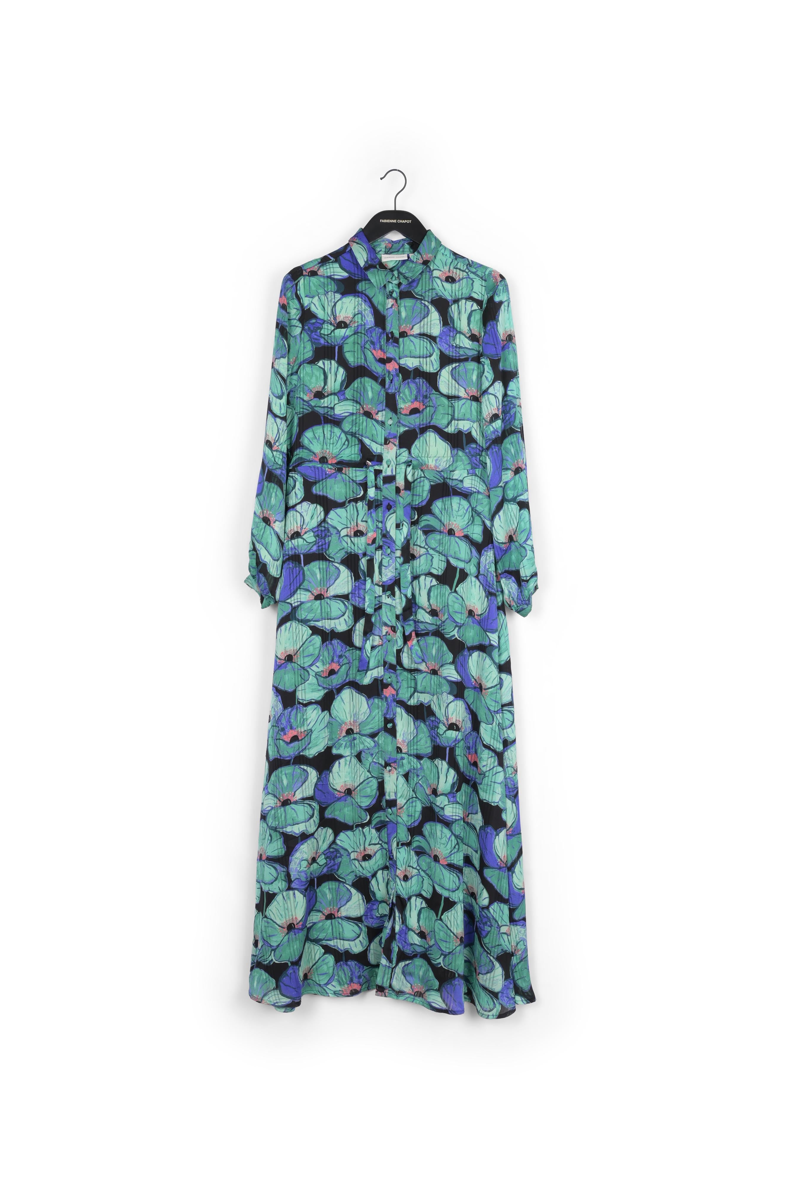 Maxi dress with classic collar, inner lining, waist belt and button closure down the length of the dress. Frida Long Dress has light see through blouson sleeves. This item is made from recycled plastic bottles (rPet): supple, soft and easy to care for. Discover how many bottles are recycled to make your garment inside the care label. -