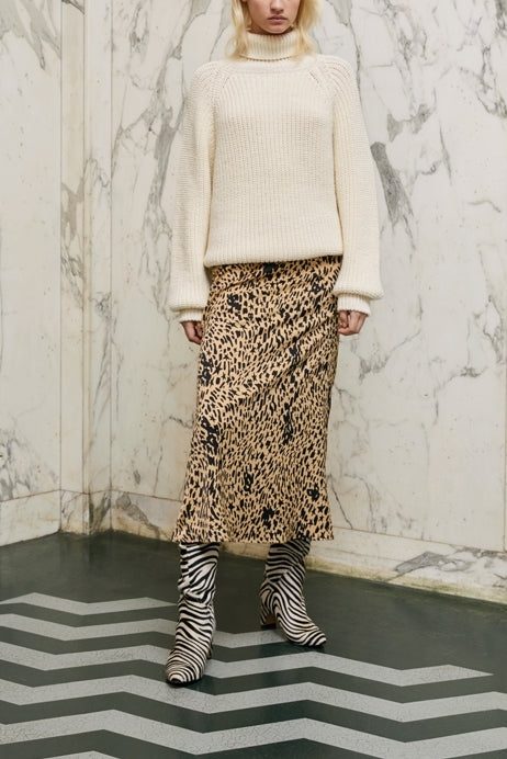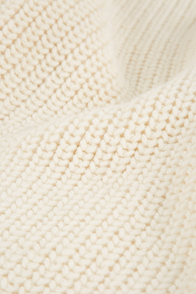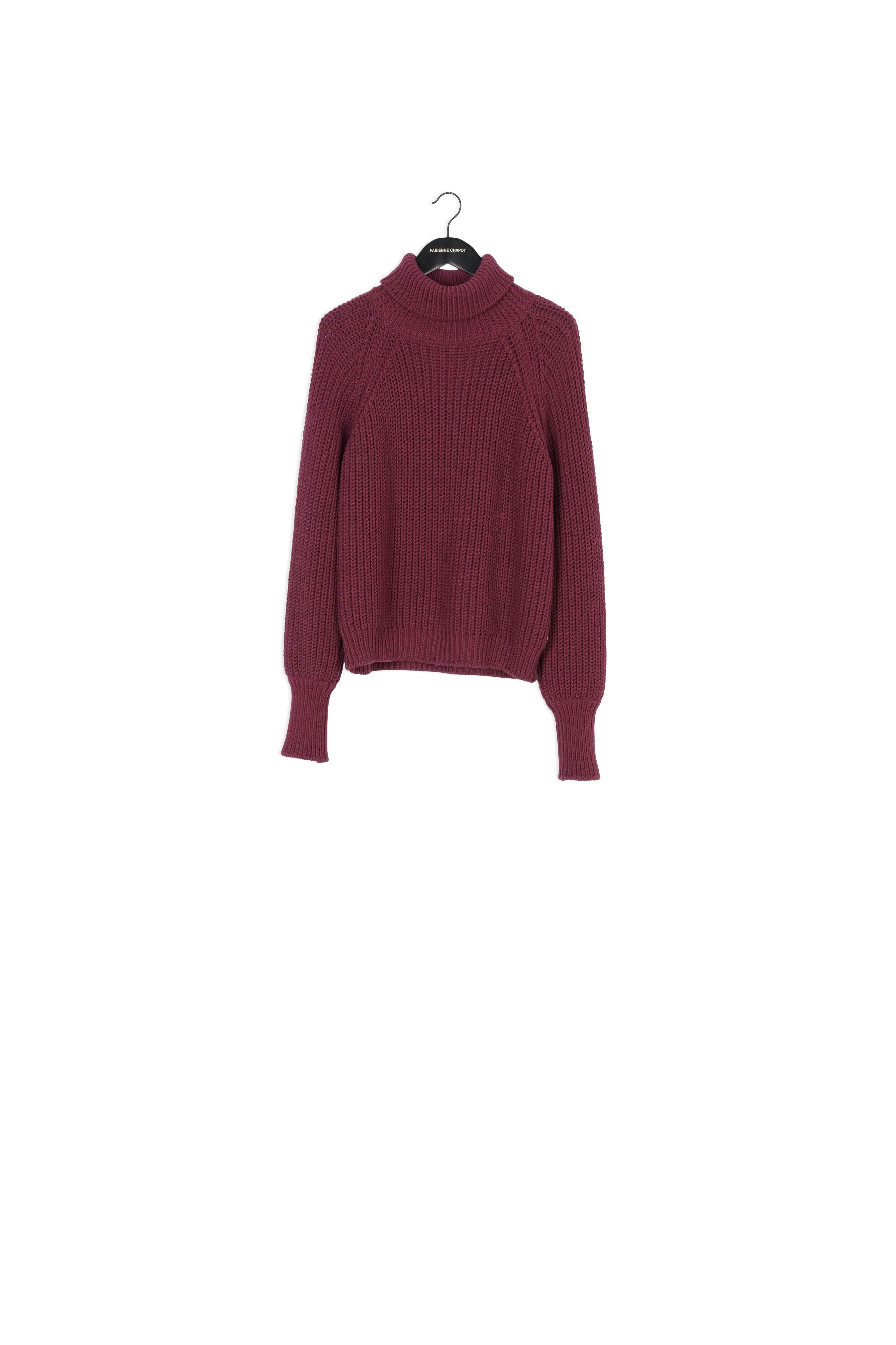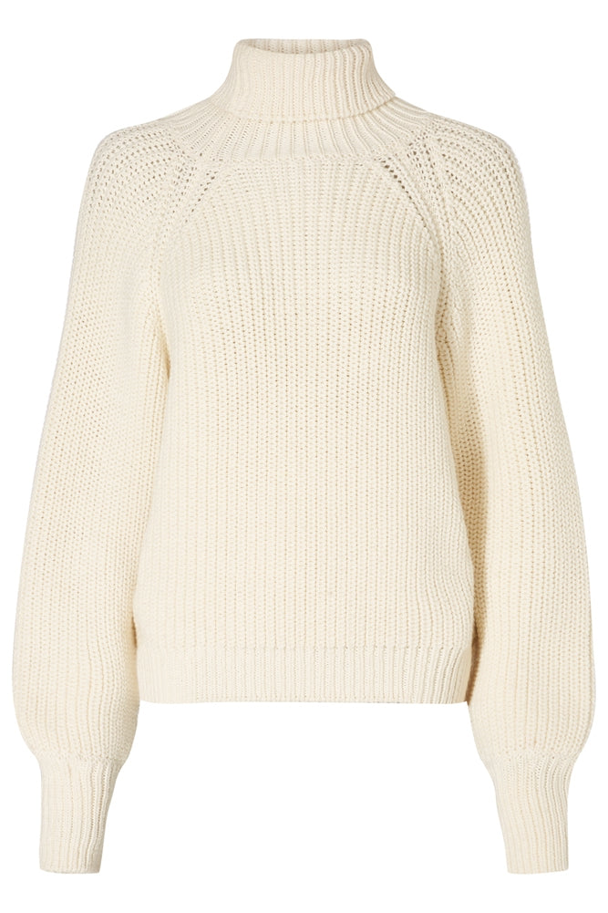 Loose-knit, loose-fitting pullover with a turtle neck and puffed sleeves. -