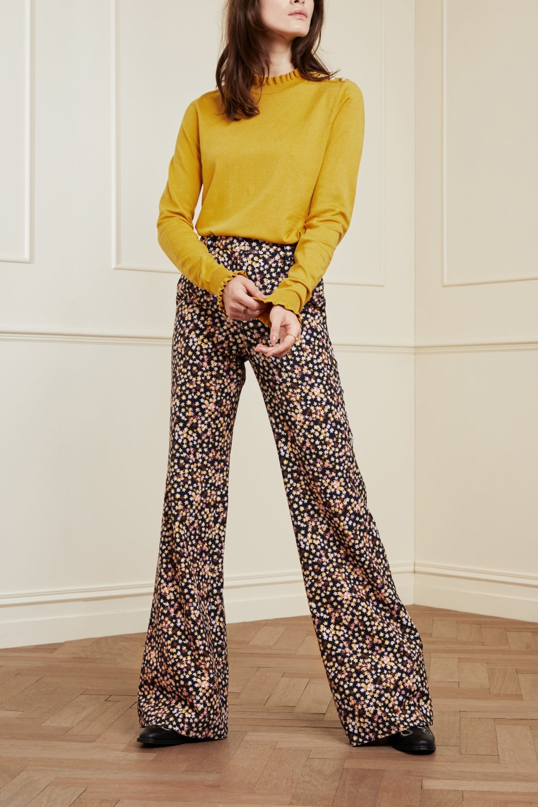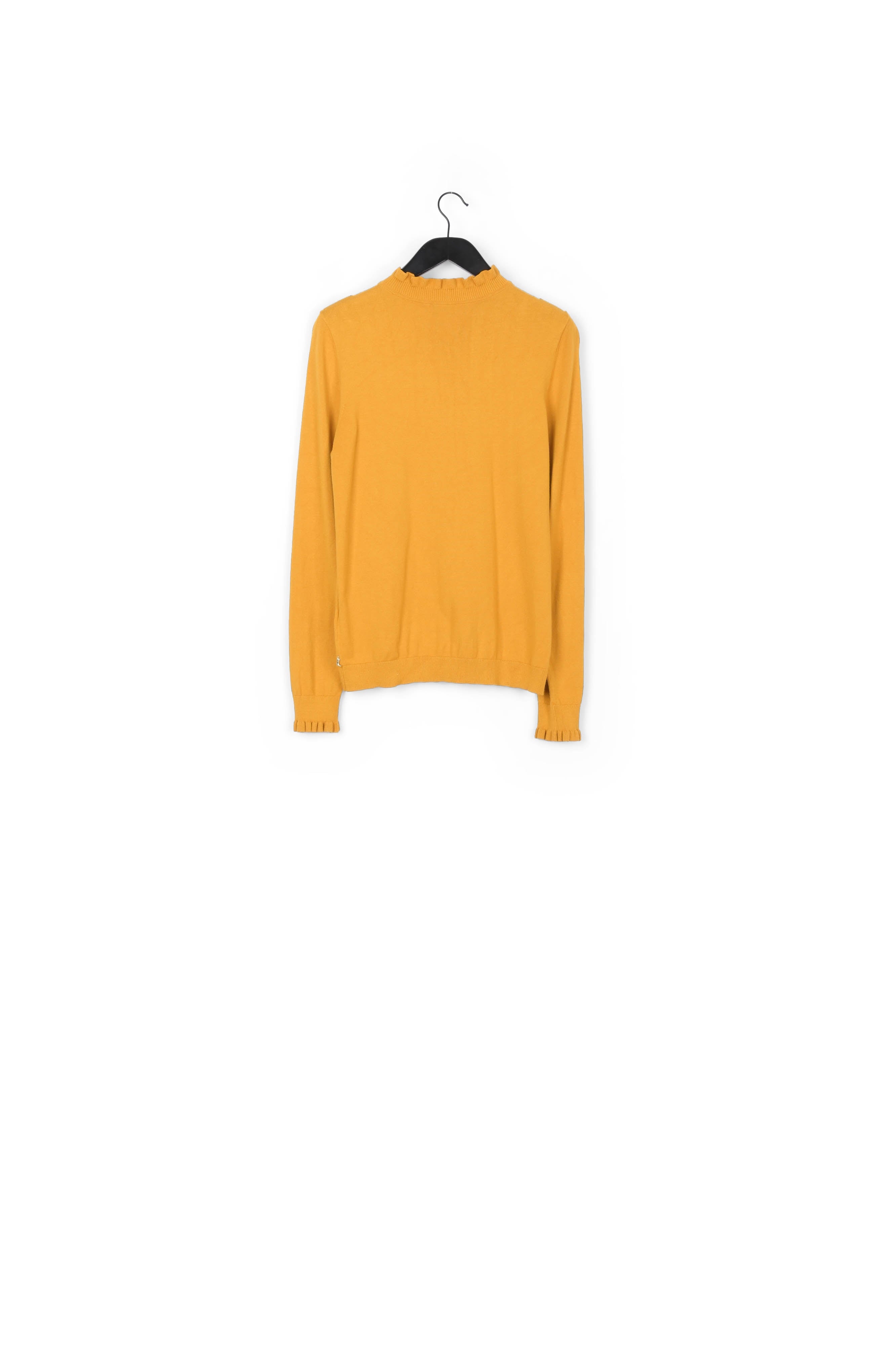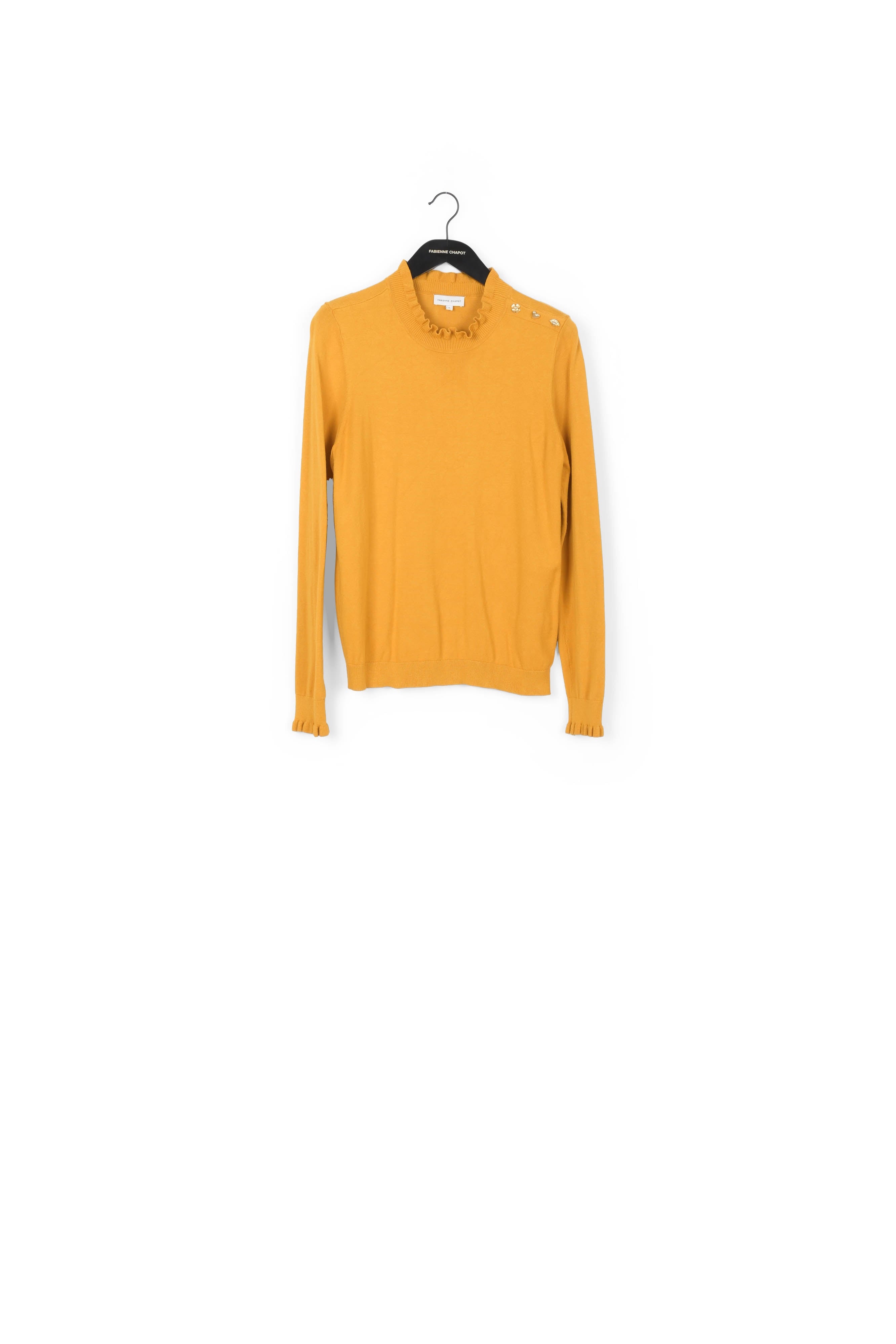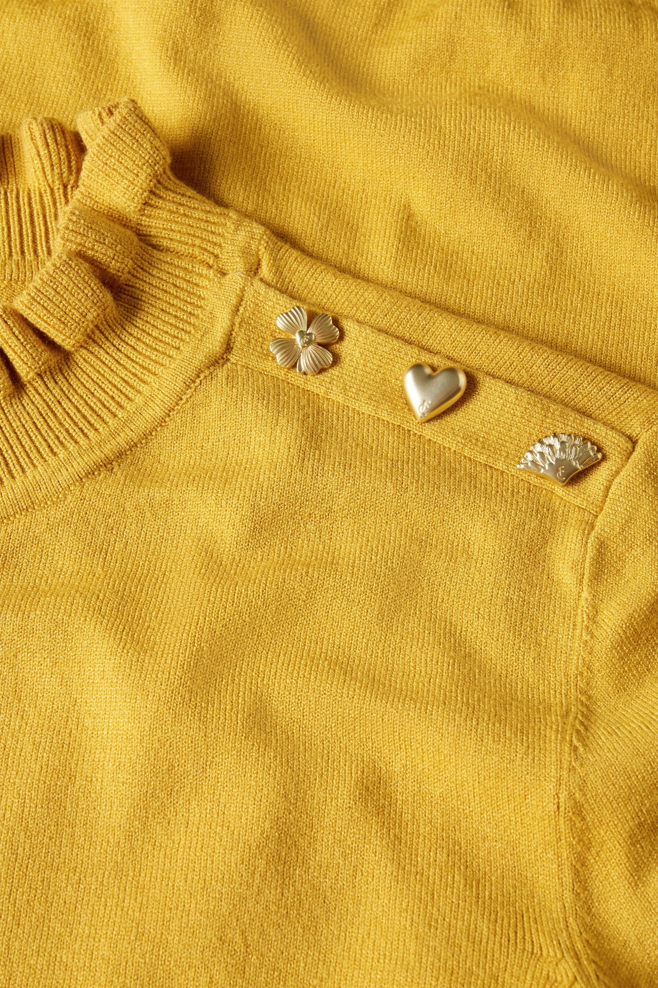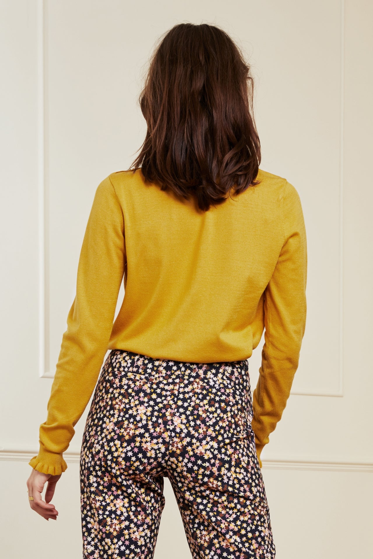 Fitted pullover with frill details on the cuffs and neck. Molly Pullover has three gold-coloured buttons on the left shoulder. -