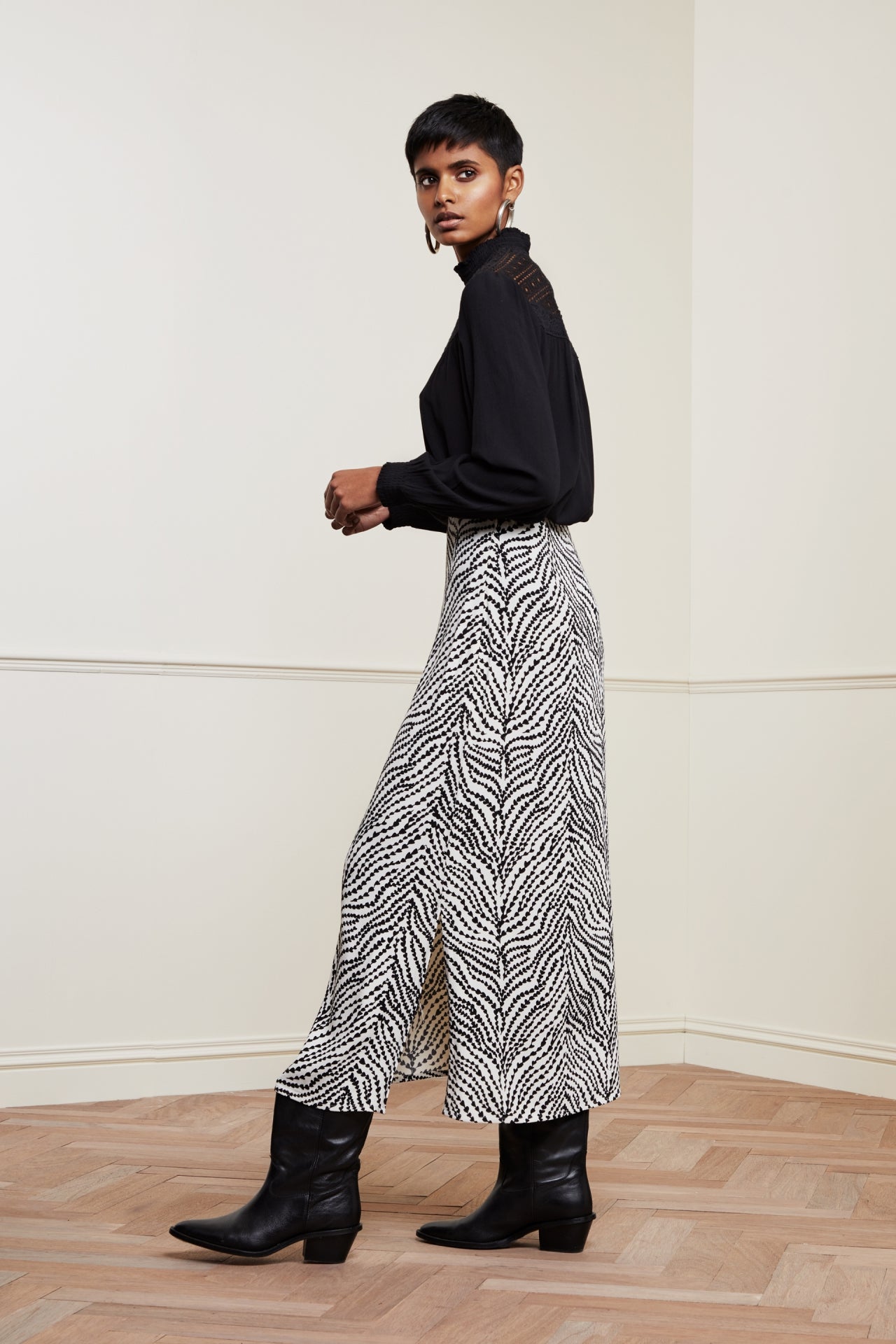 Midi-length, straight skirt with a tight fit. Laurie Skirt has a waistband and a zipper on the side.