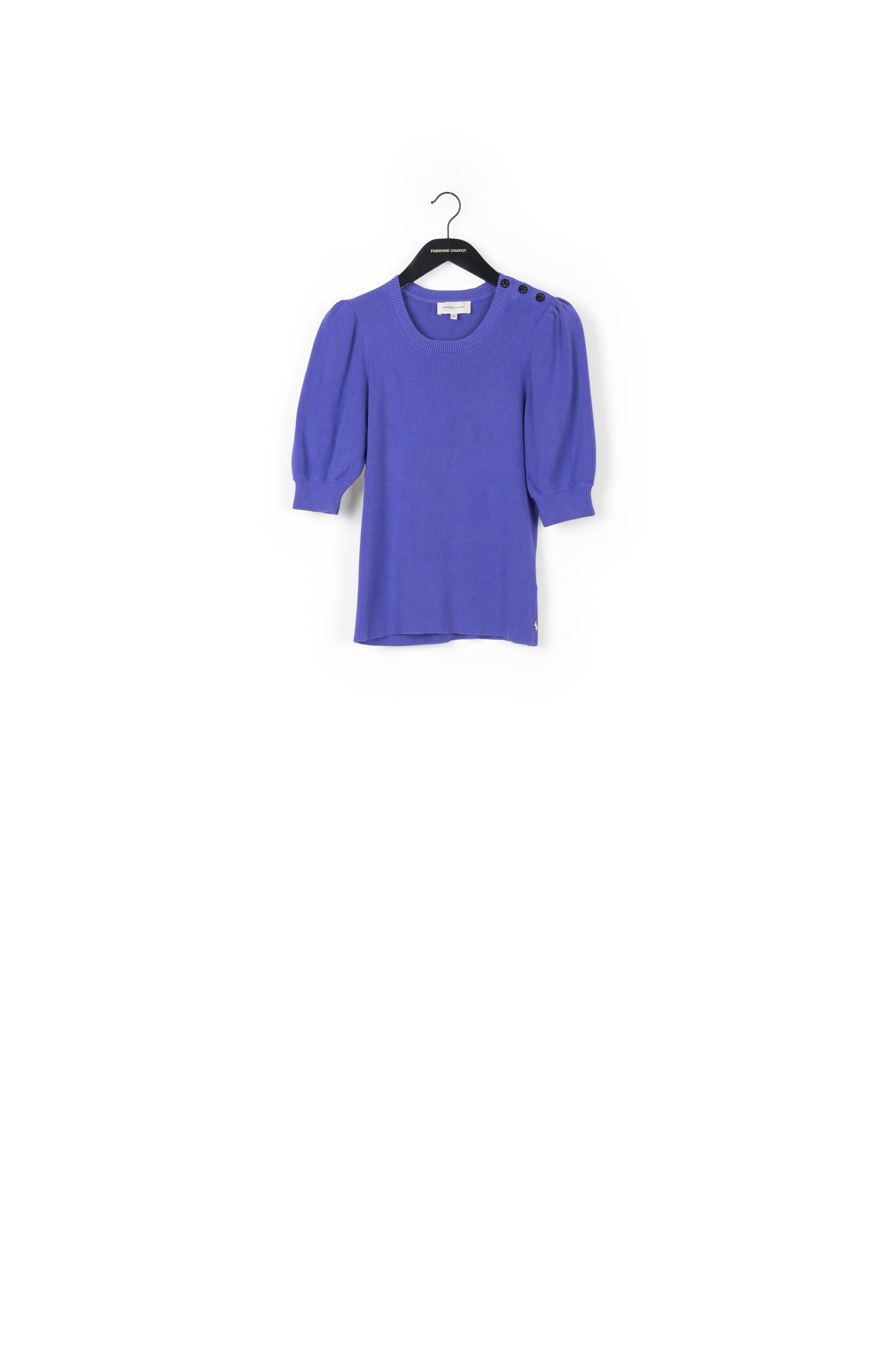 Round neck pullover with short balloon sleeves with cuffs. Lillian Short Sleeve Pullover has three specially made Fabienne Chapot buttons on the left shoulder. -