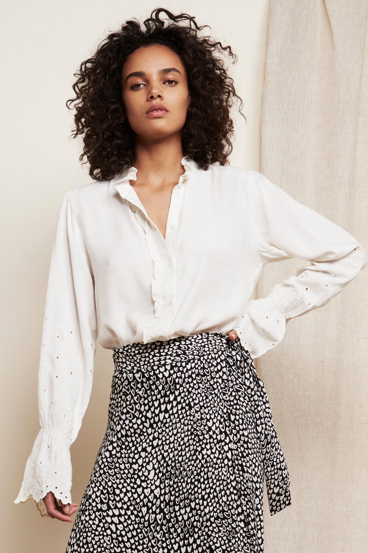 Blouse with high-closed collar, button closure and wide-flared sleeves. Clara Blouse has embroidered and ruffle details.