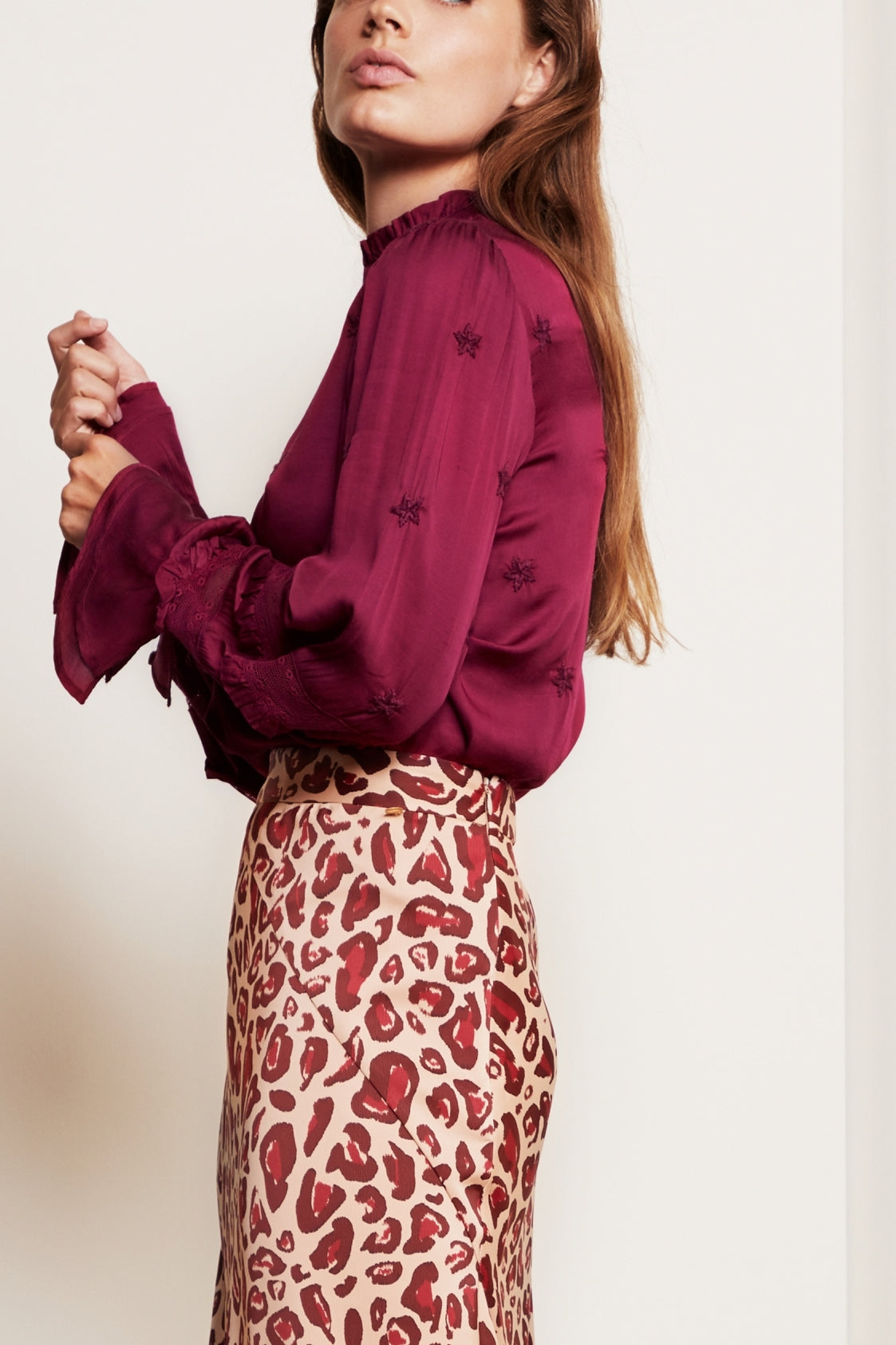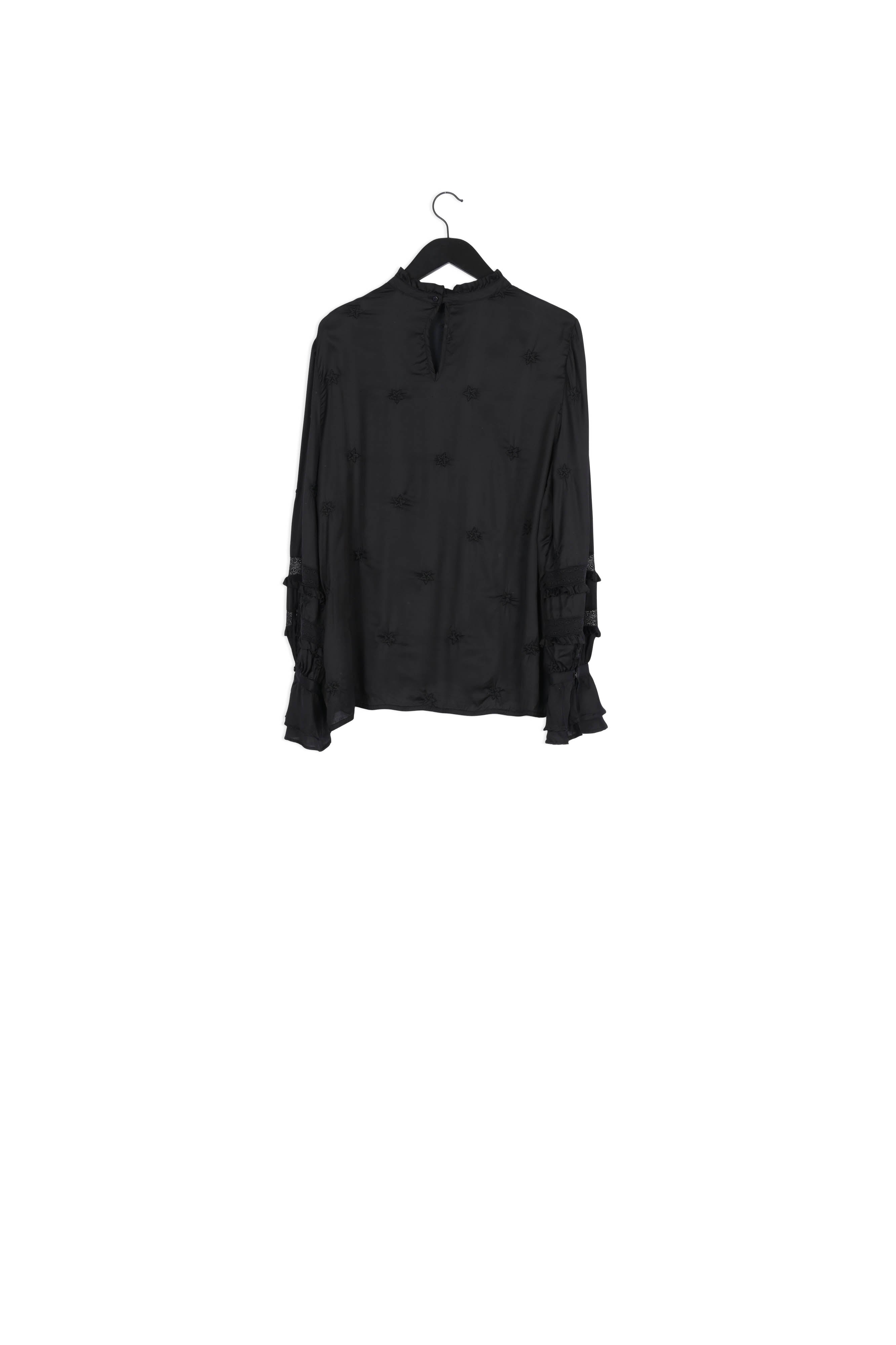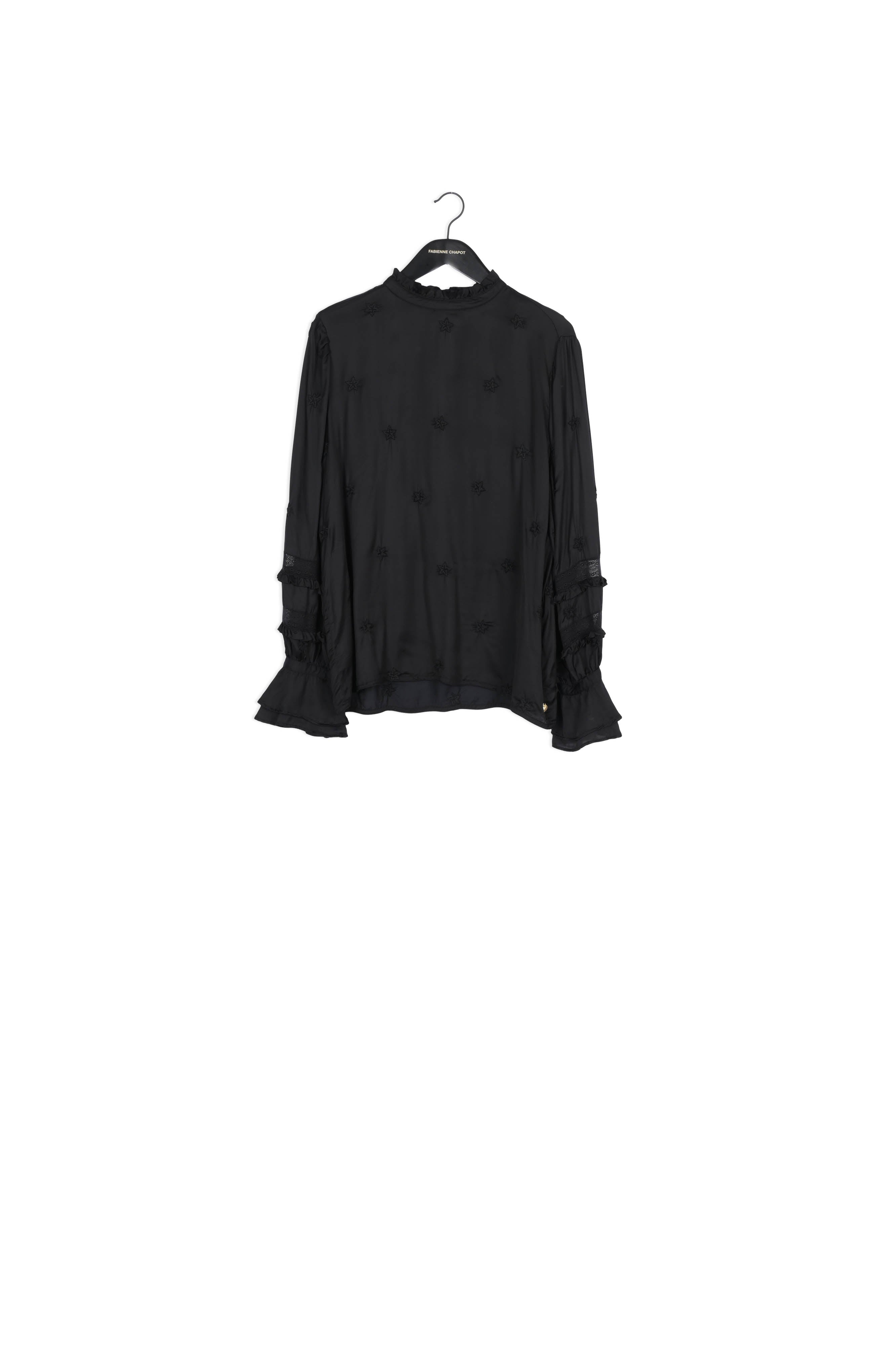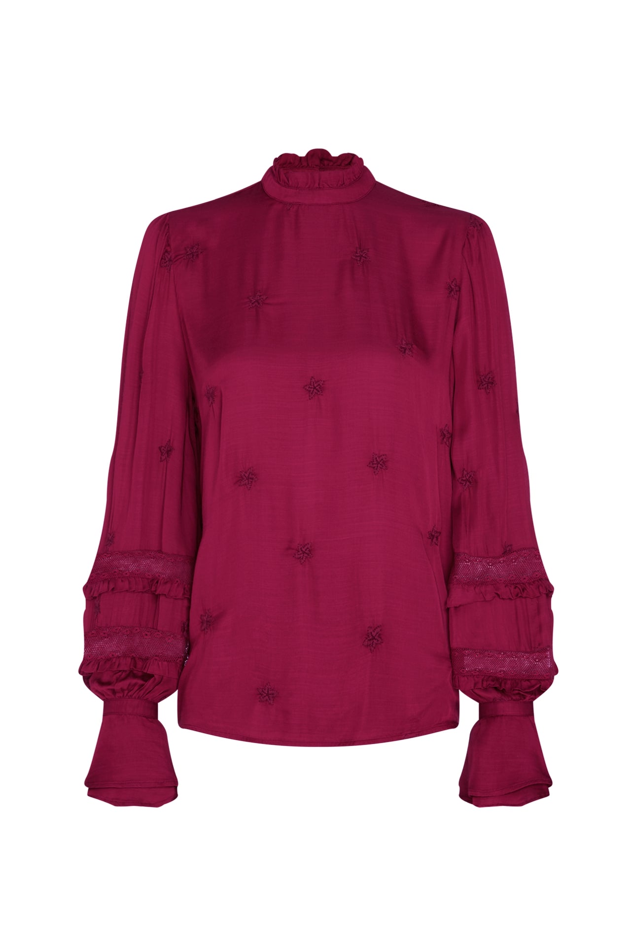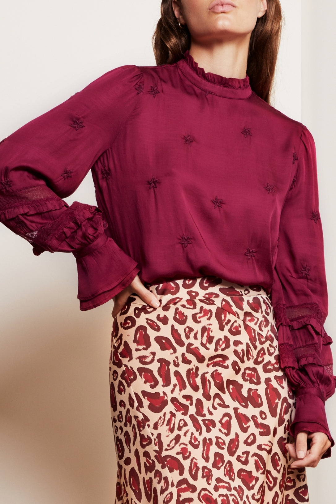 Blouse with high-closed collar, embroidered print. Leo Top has lace and ruffle details on the sleeves. -