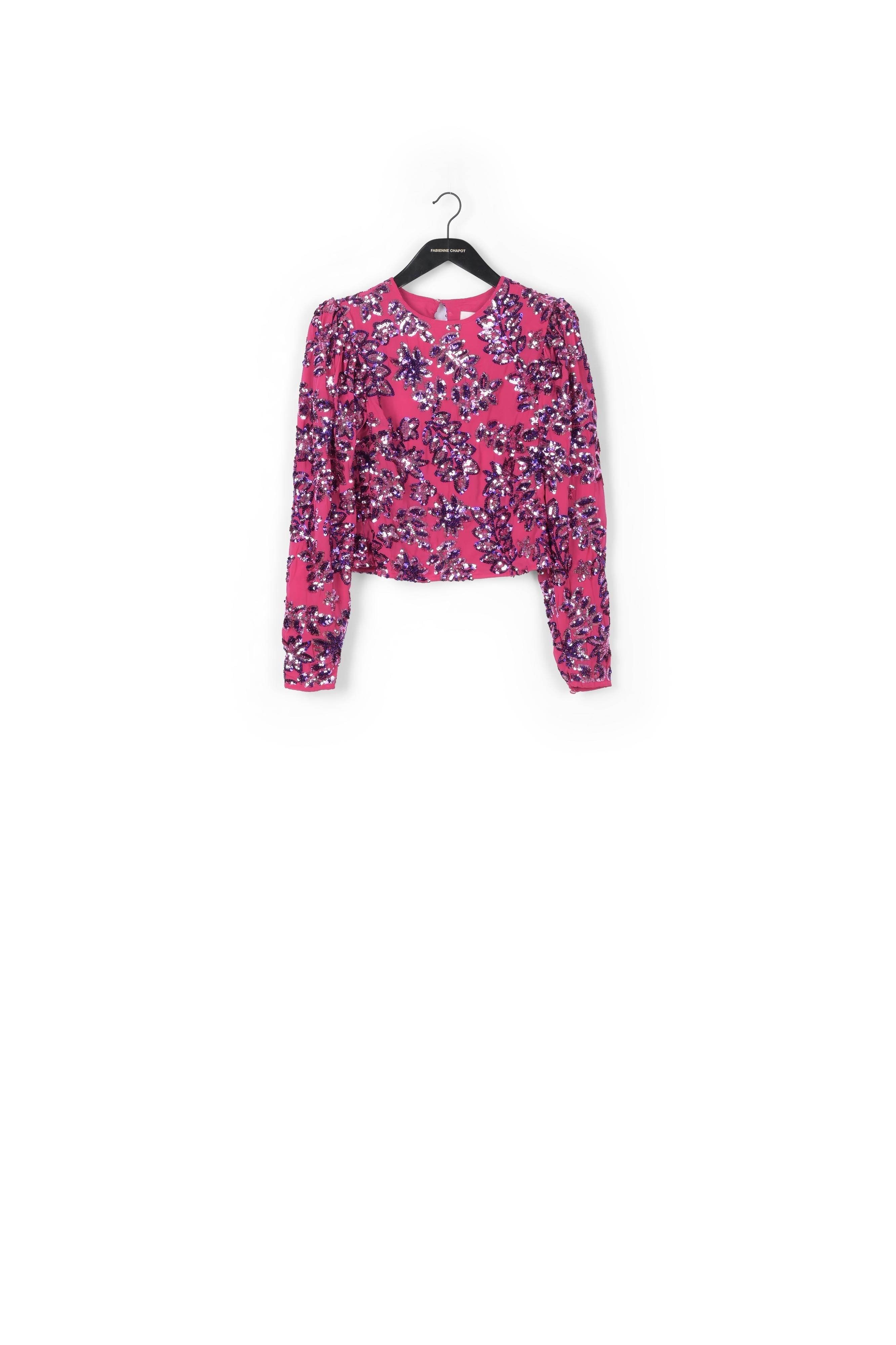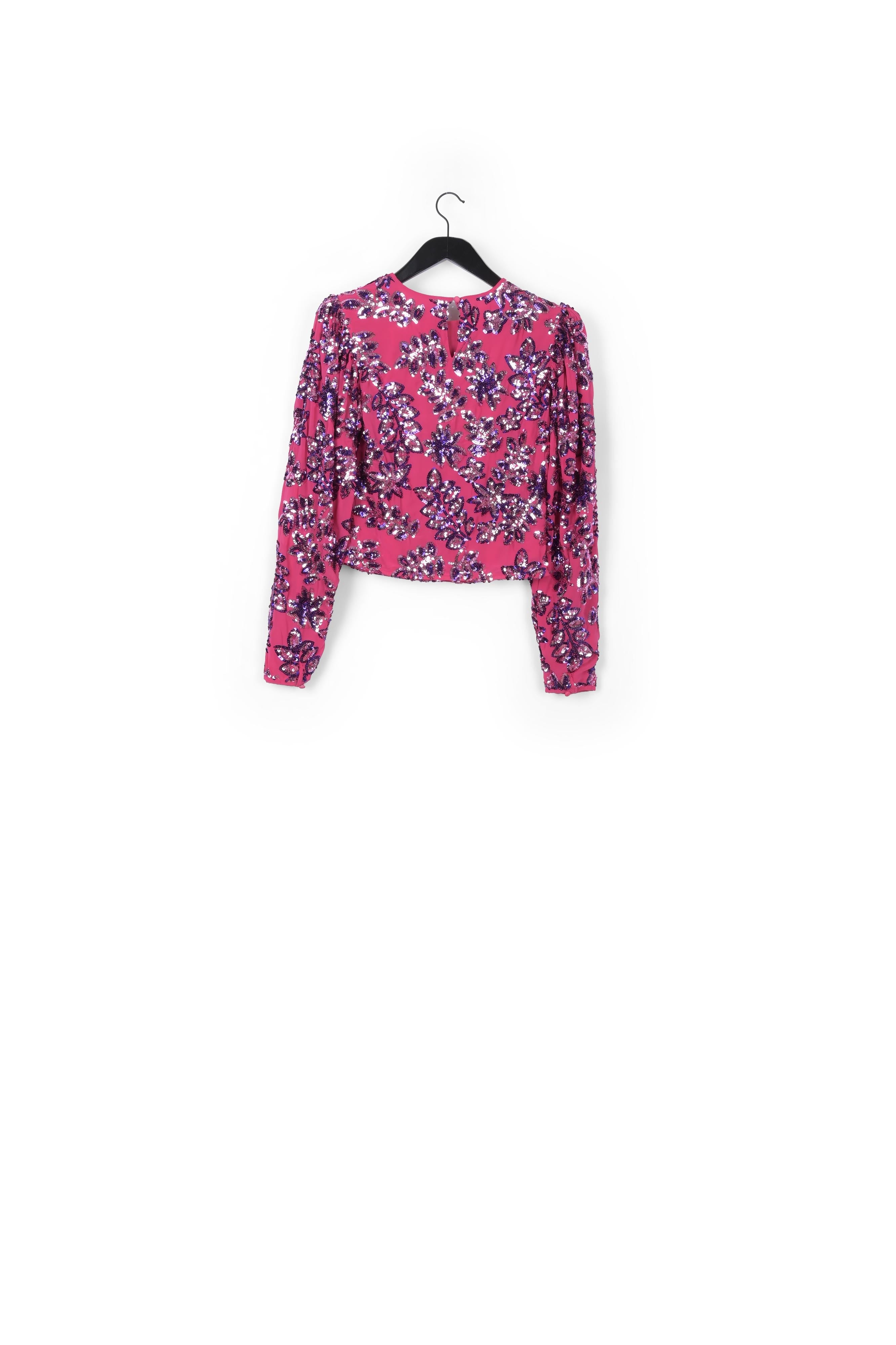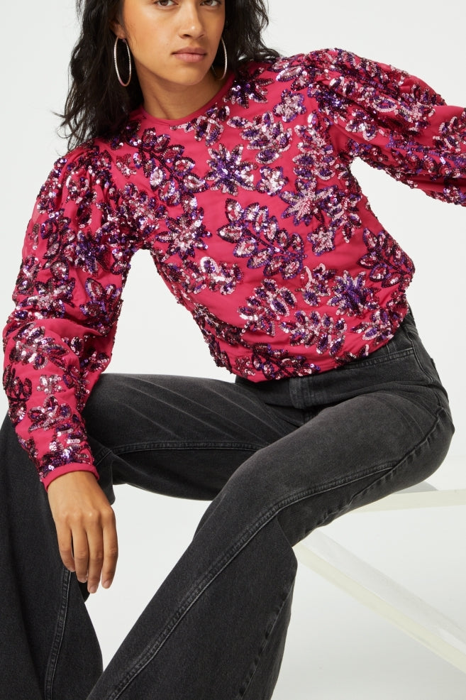 Pink top with round neck with button closure and long puff sleeves. Savanah Top has all-over leaf embellishments.