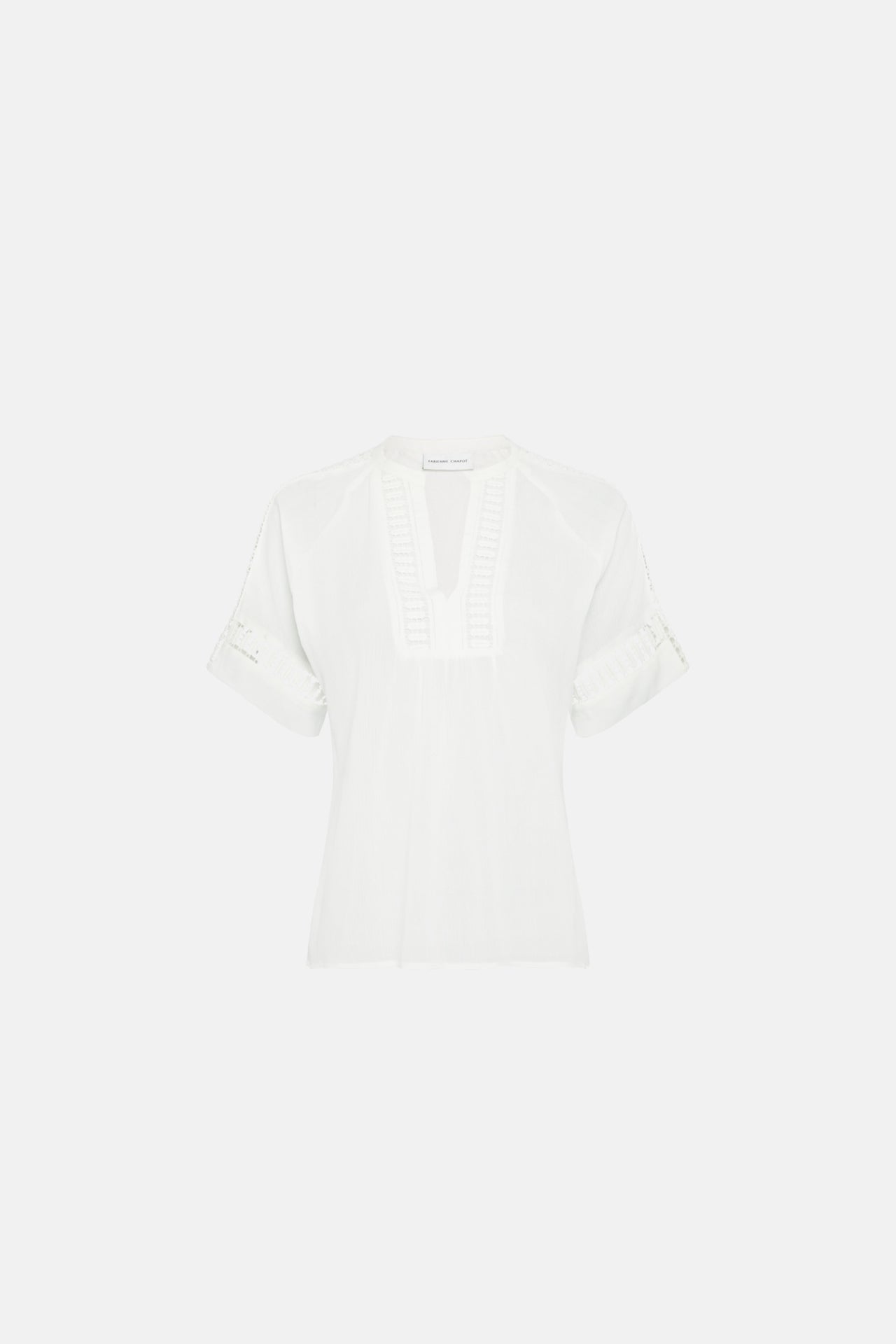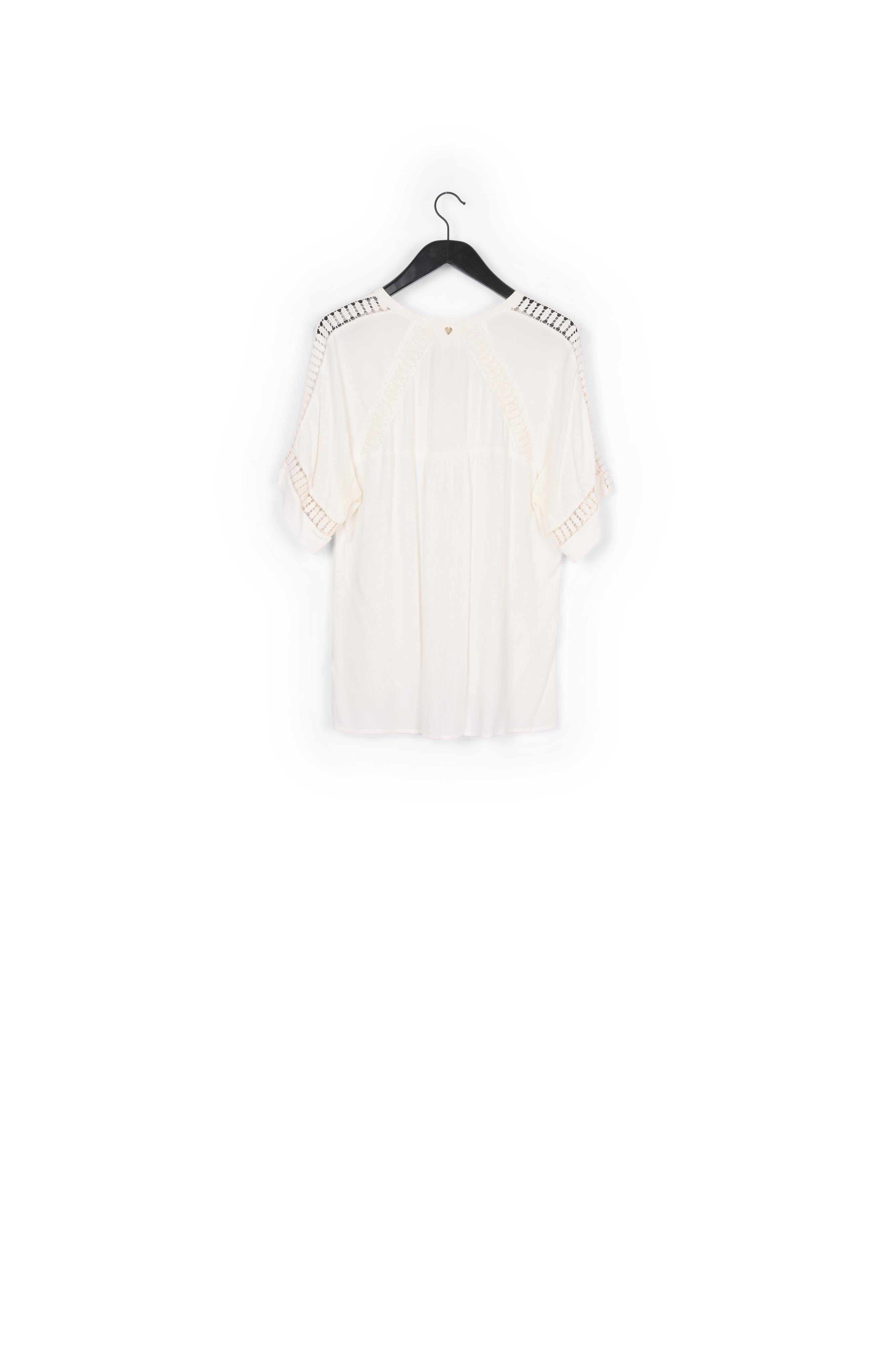 Top with a V-neckline and short sleeves. Alissa top has openwork details on the neck, sleeves and back.