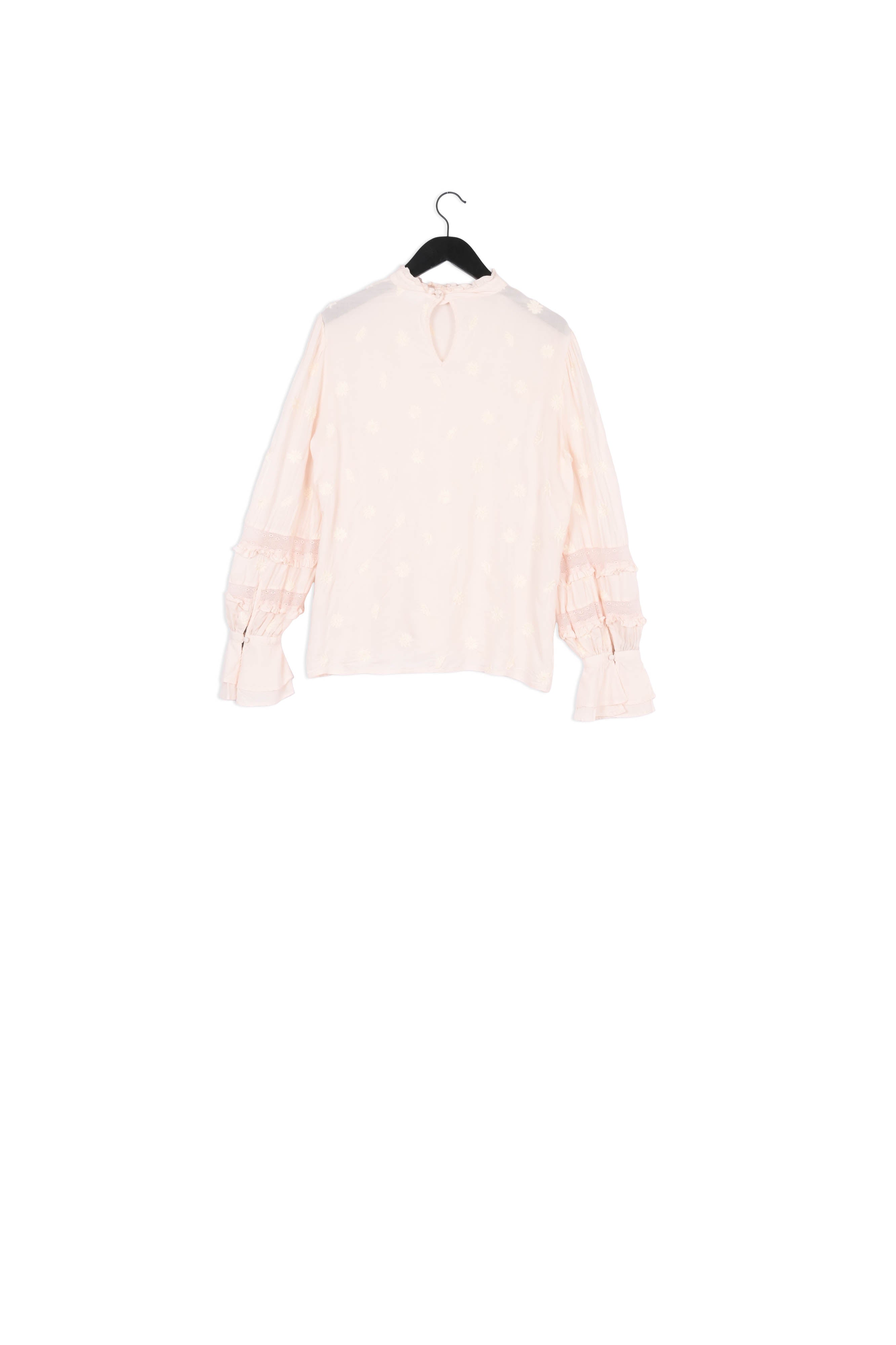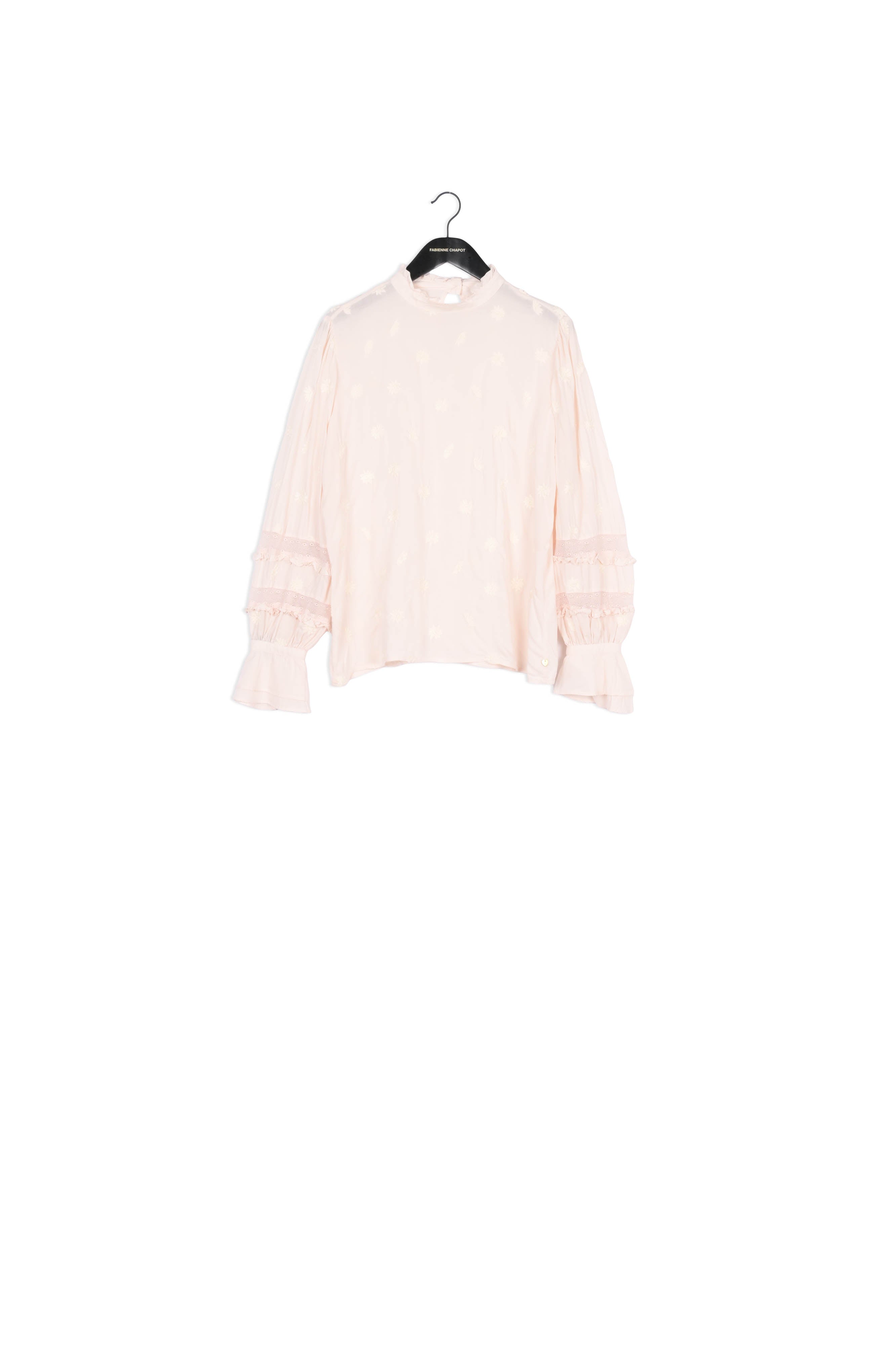 Blouse with high-closed collar, embroidered print. Leo Top has lace and ruffle details on the sleeves. -
