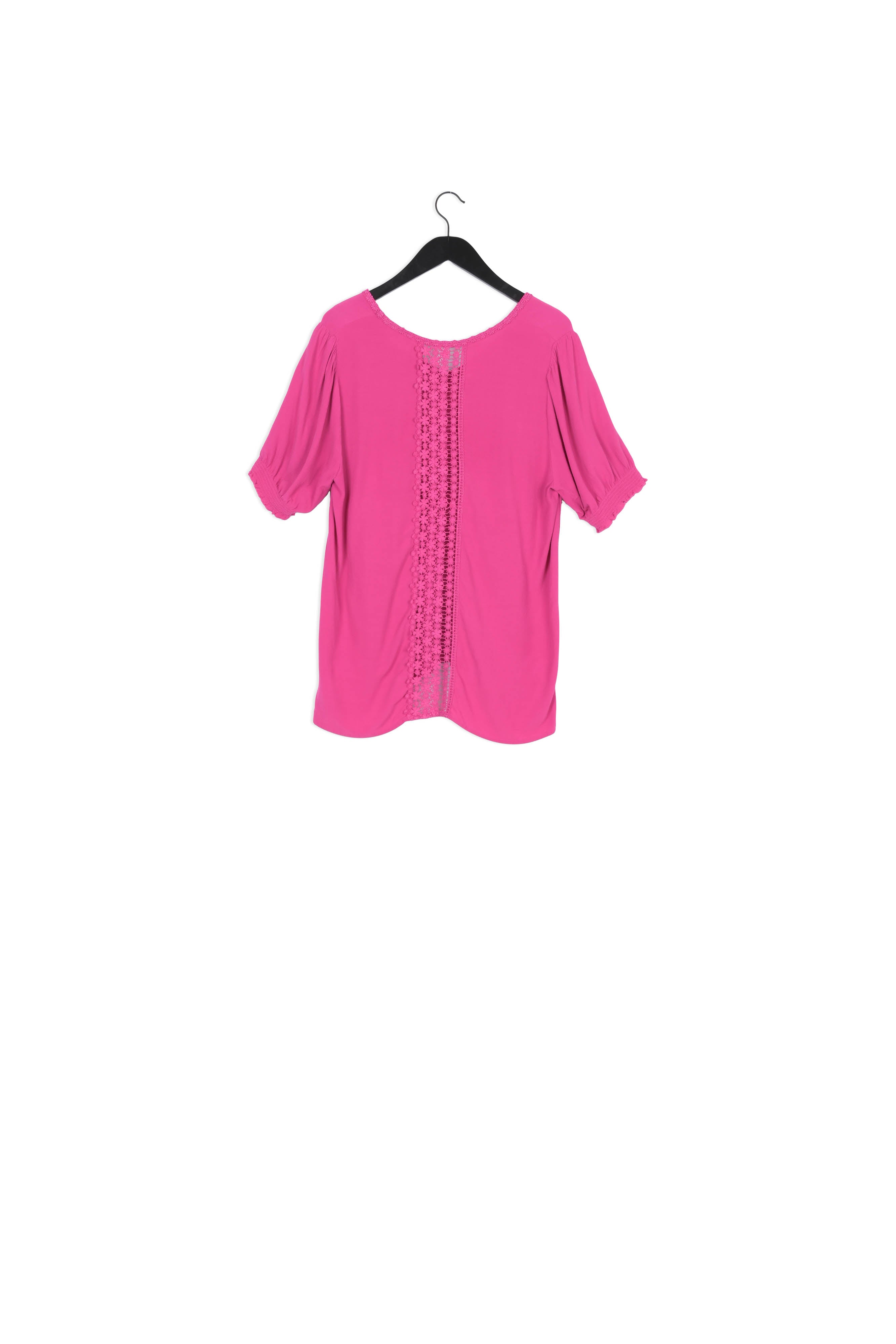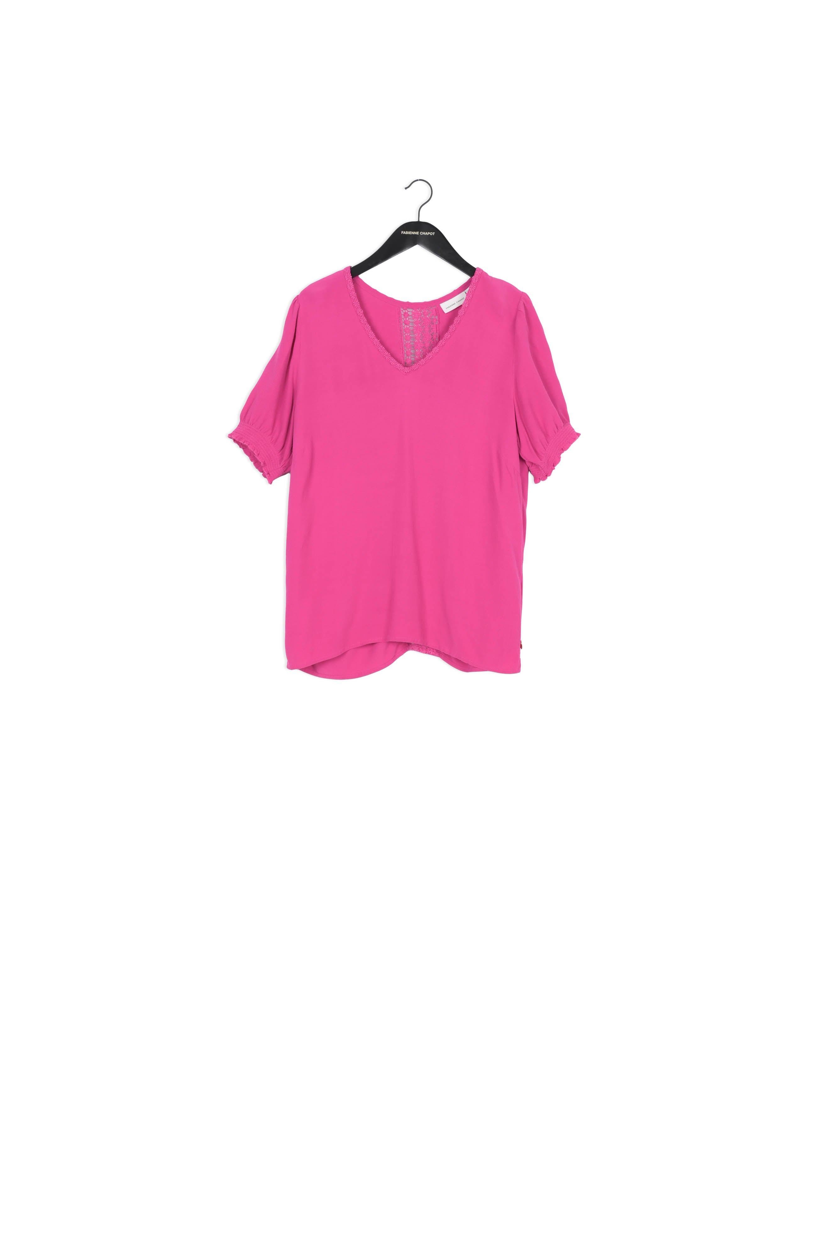 Top with V-neck, lace details along the neckline and at the back. Donna Top has a short puff sleeve with an elastic smocked trim.