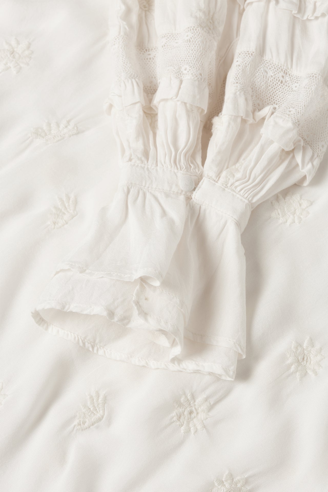 Blouse with high-closed collar, embroidered print. Leo Top has lace and ruffle details on the sleeves.
