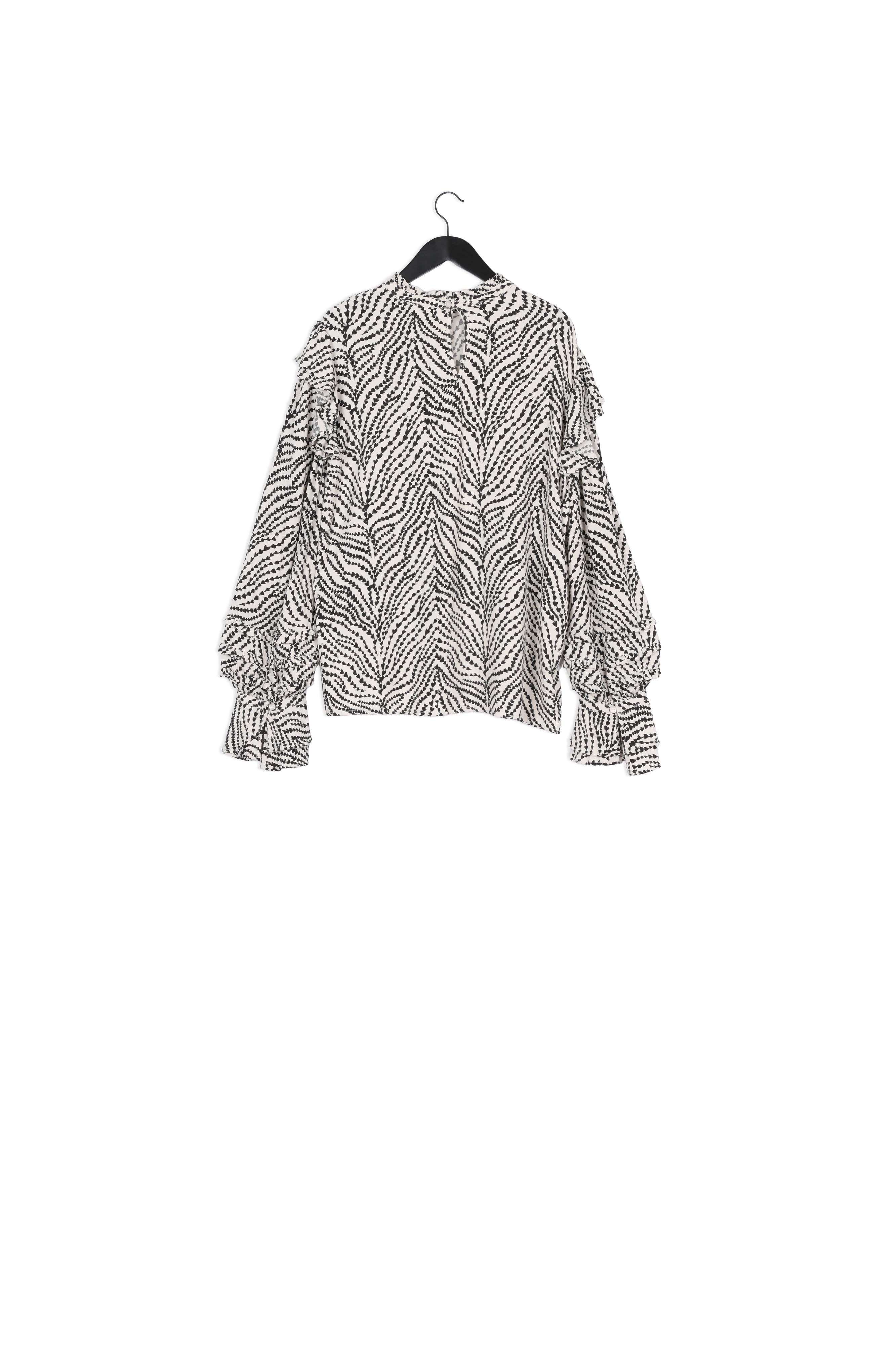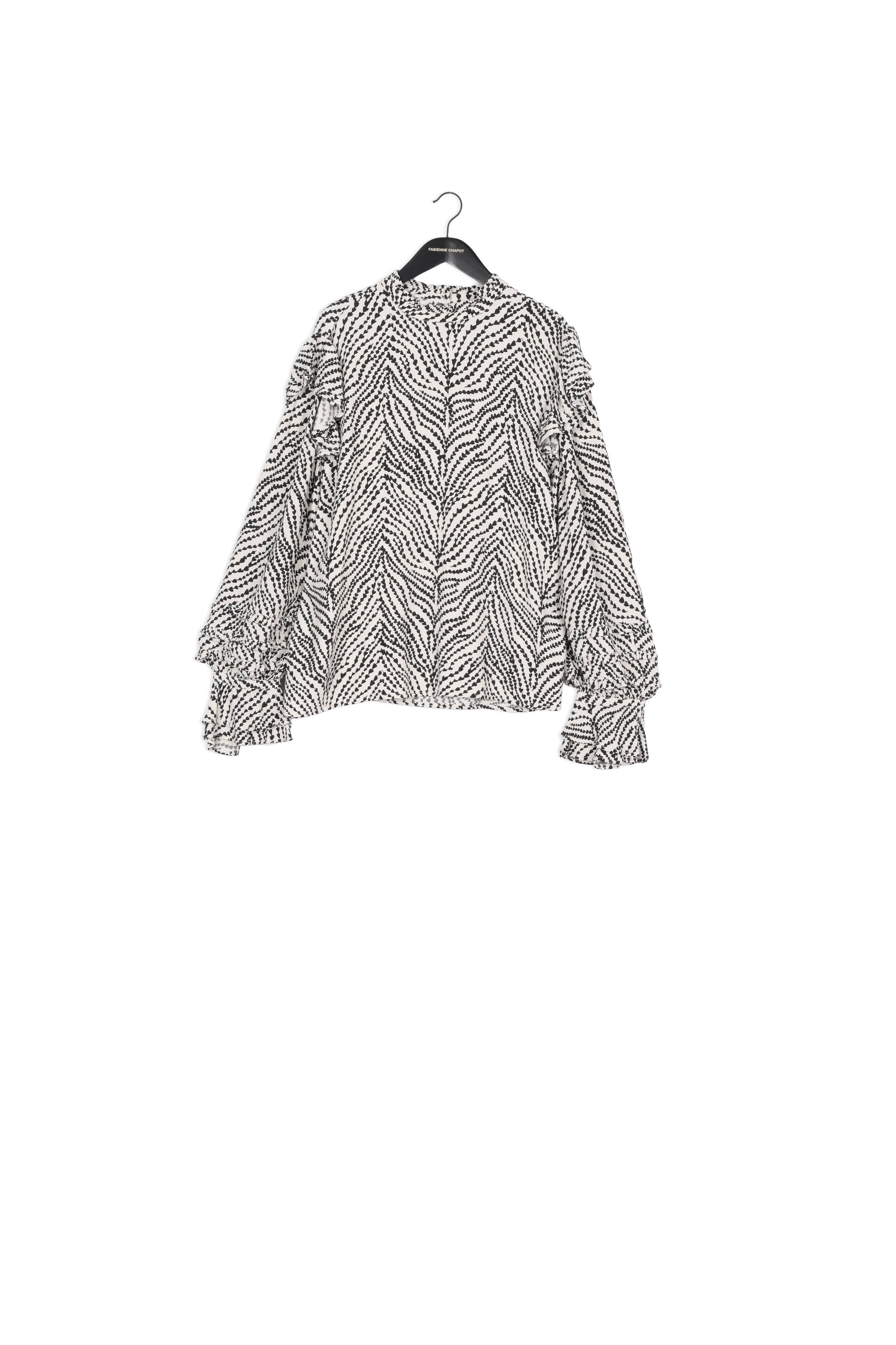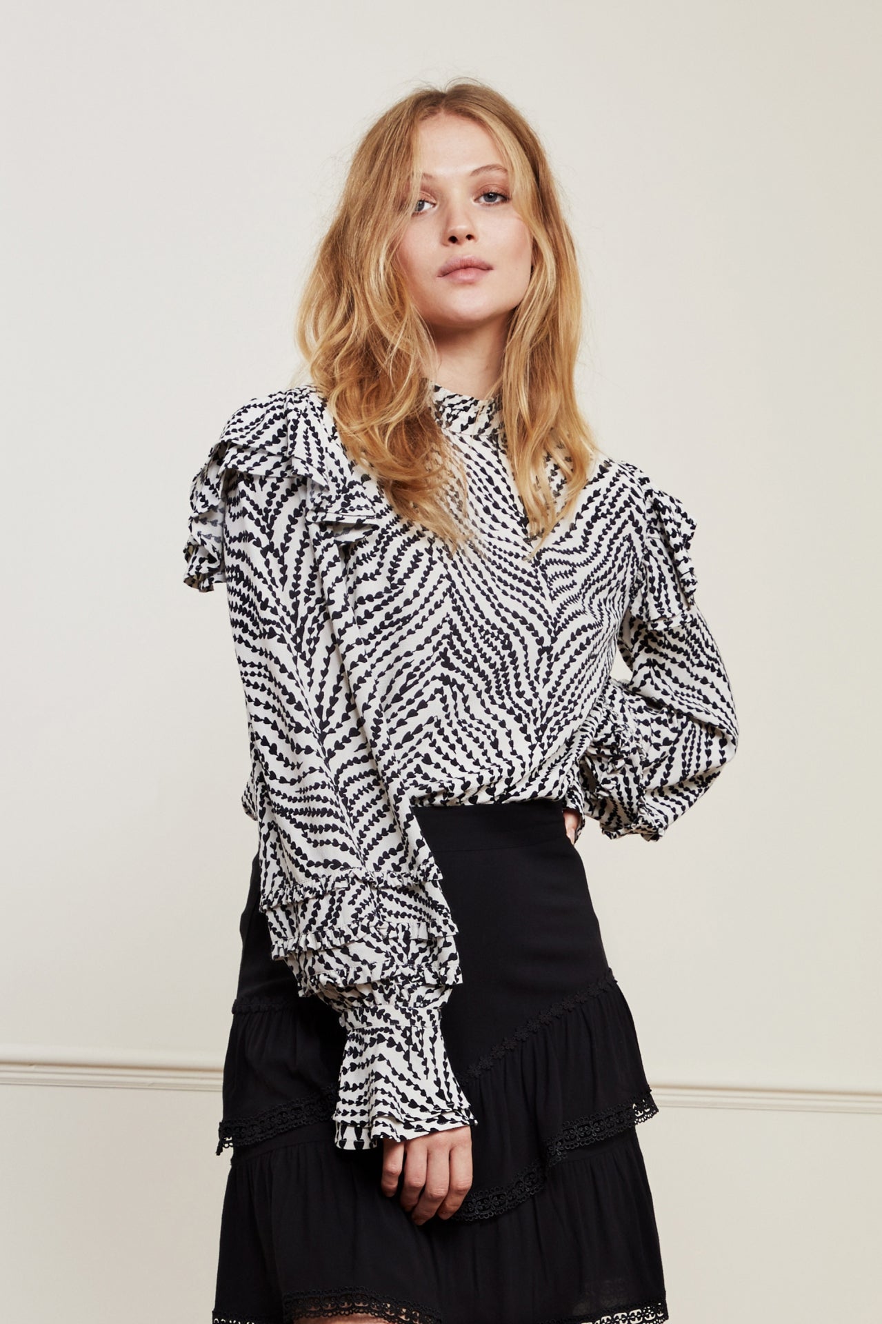 Blouse with high-closed collar and flared sleeves. Leo Frill Top has ruffle details at the collar, on the shoulders and on the sleeves. -