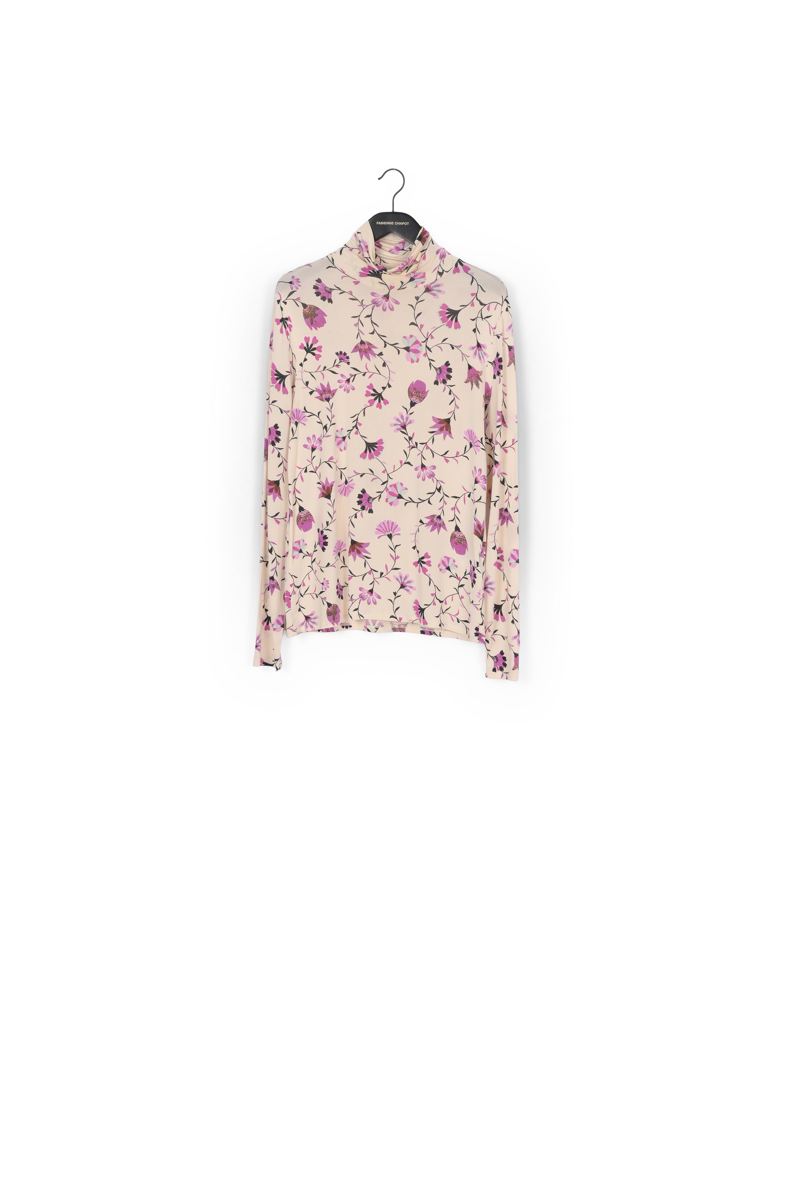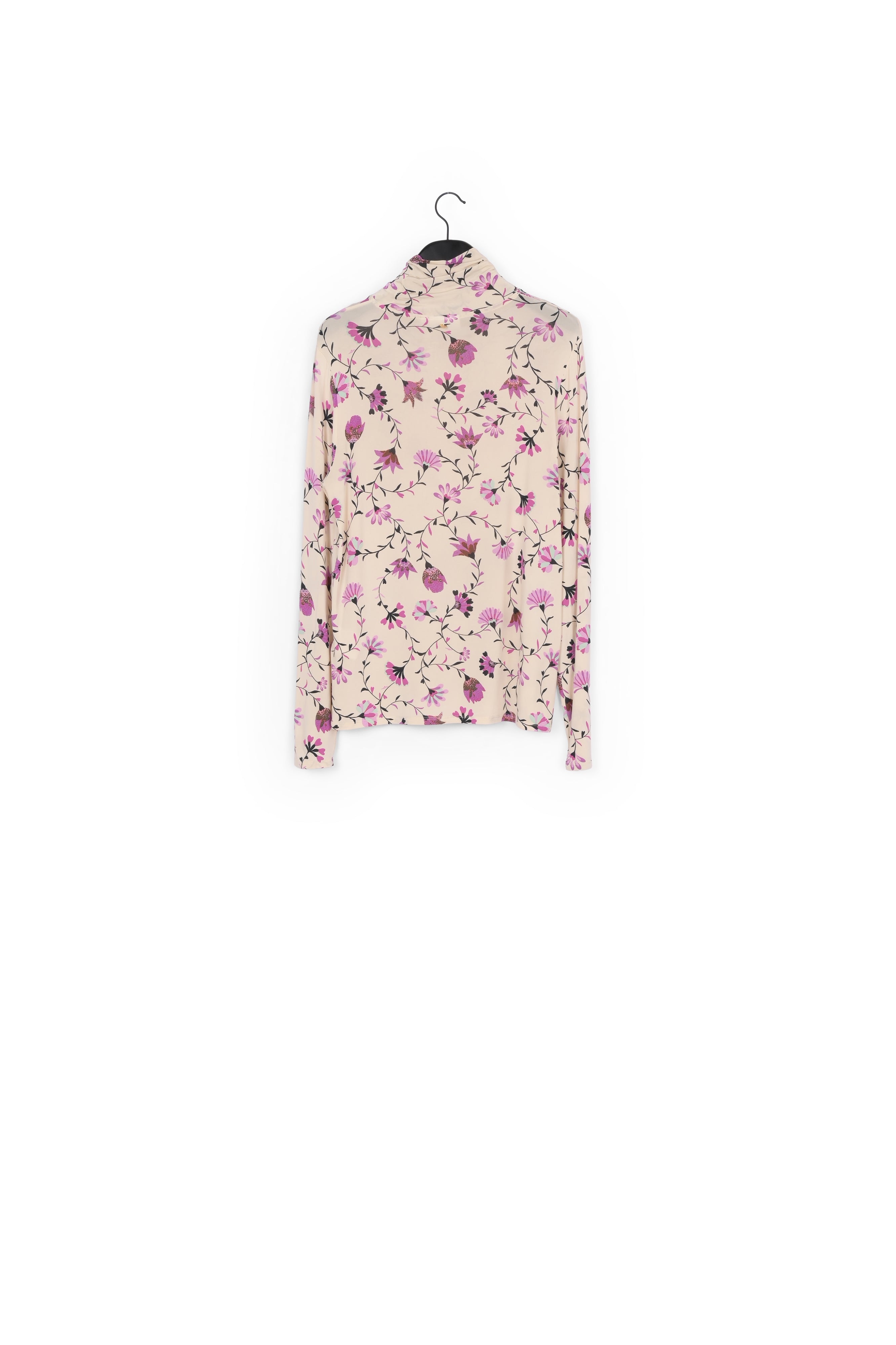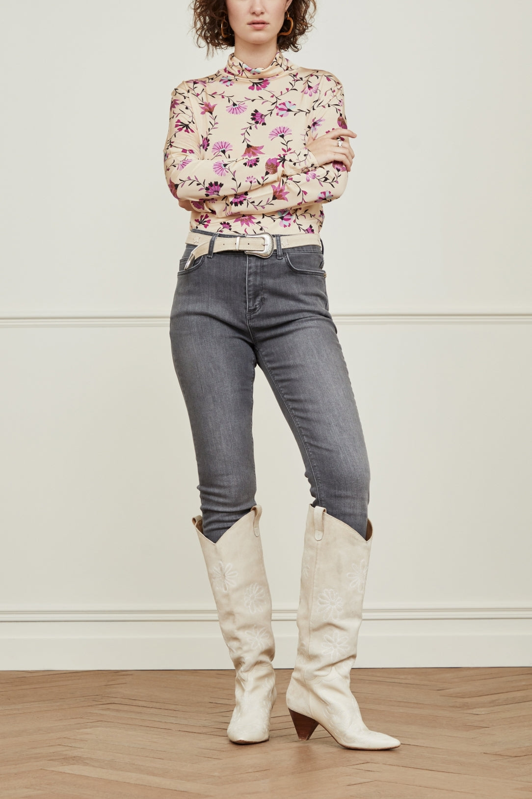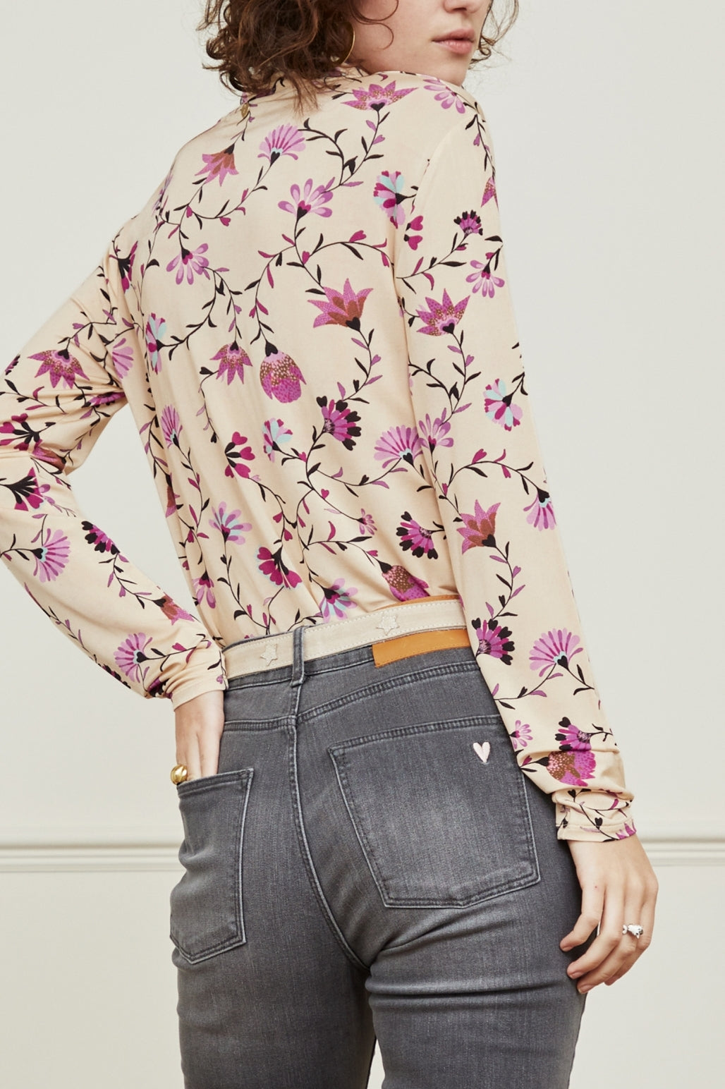 Fitted top with long sleeves and a high turtleneck. Jane Billy Top has an allover Cream Tulip print and feels soft and stretchy. -