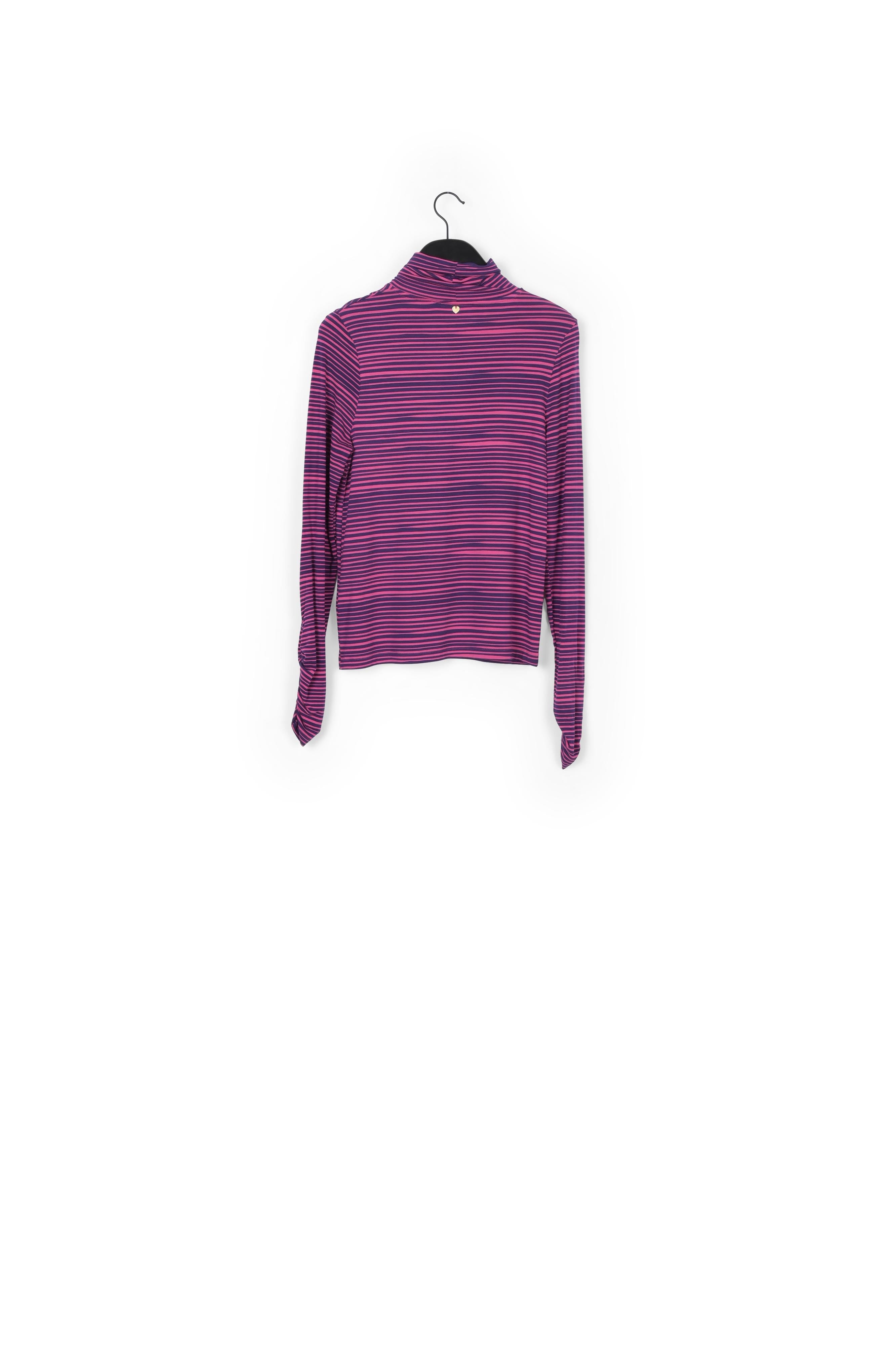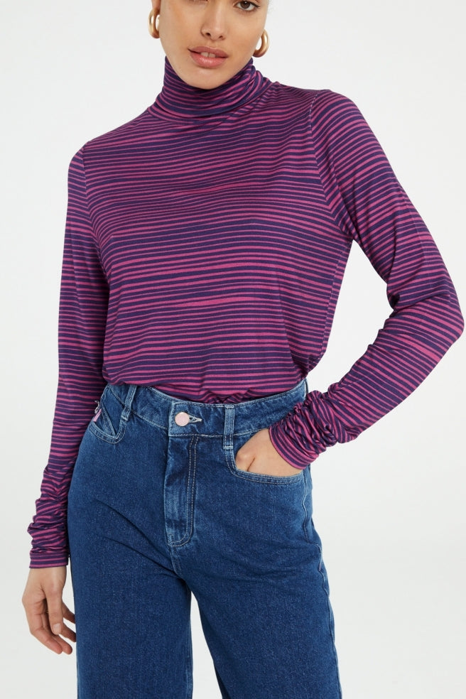 Close-fitting top with turtleneck. Jade Top has a draped detail at the end of the sleeve.