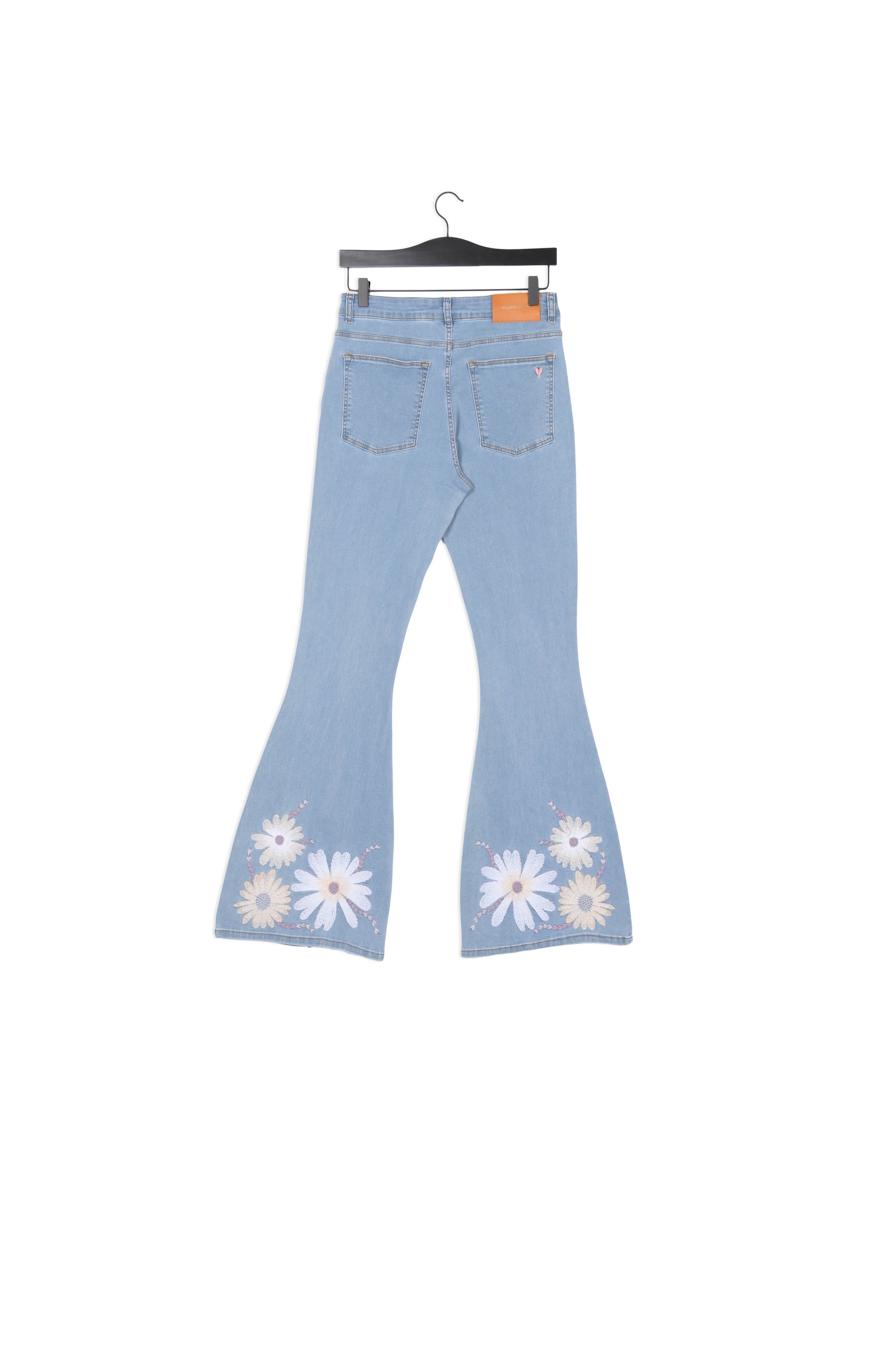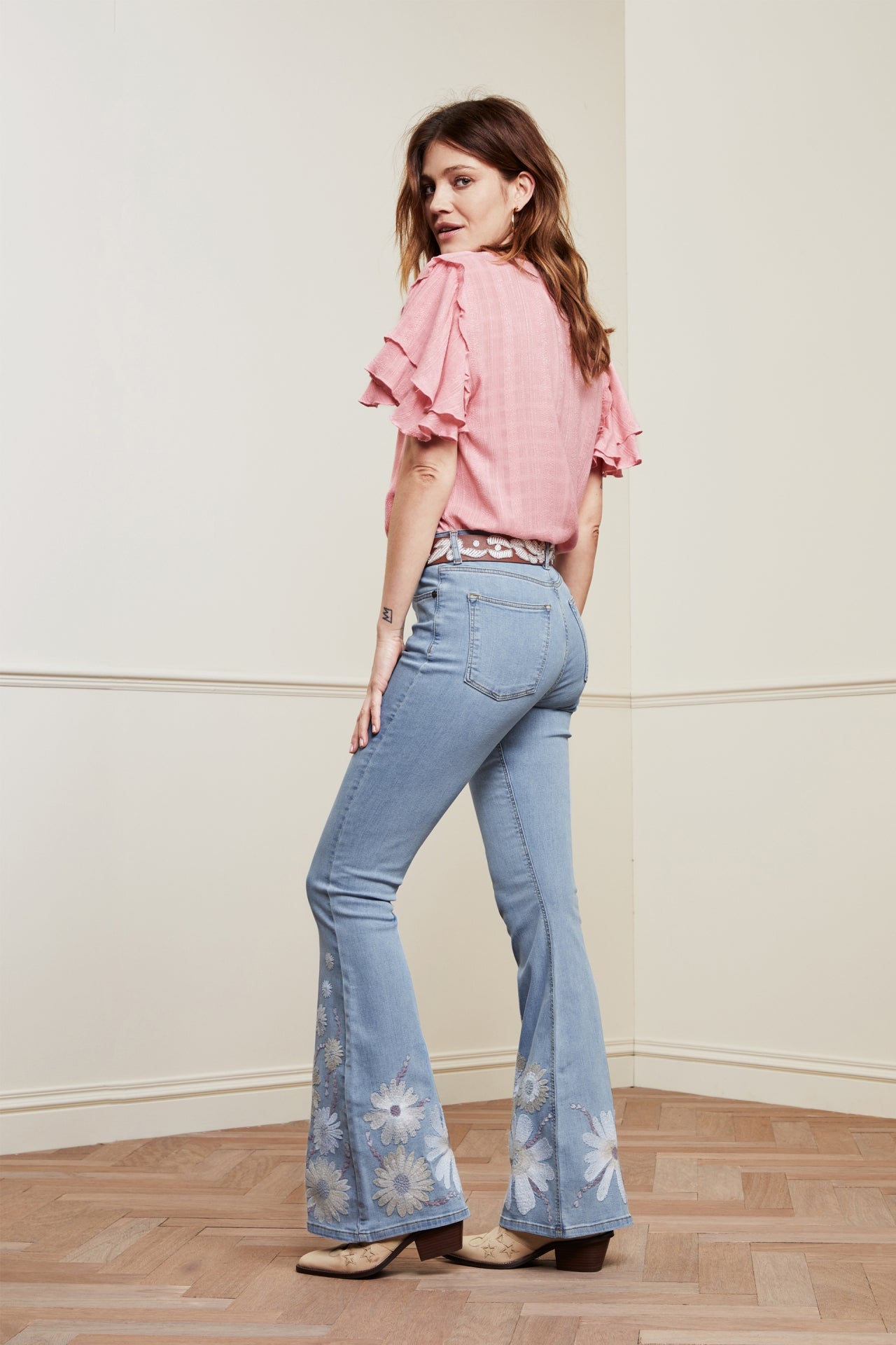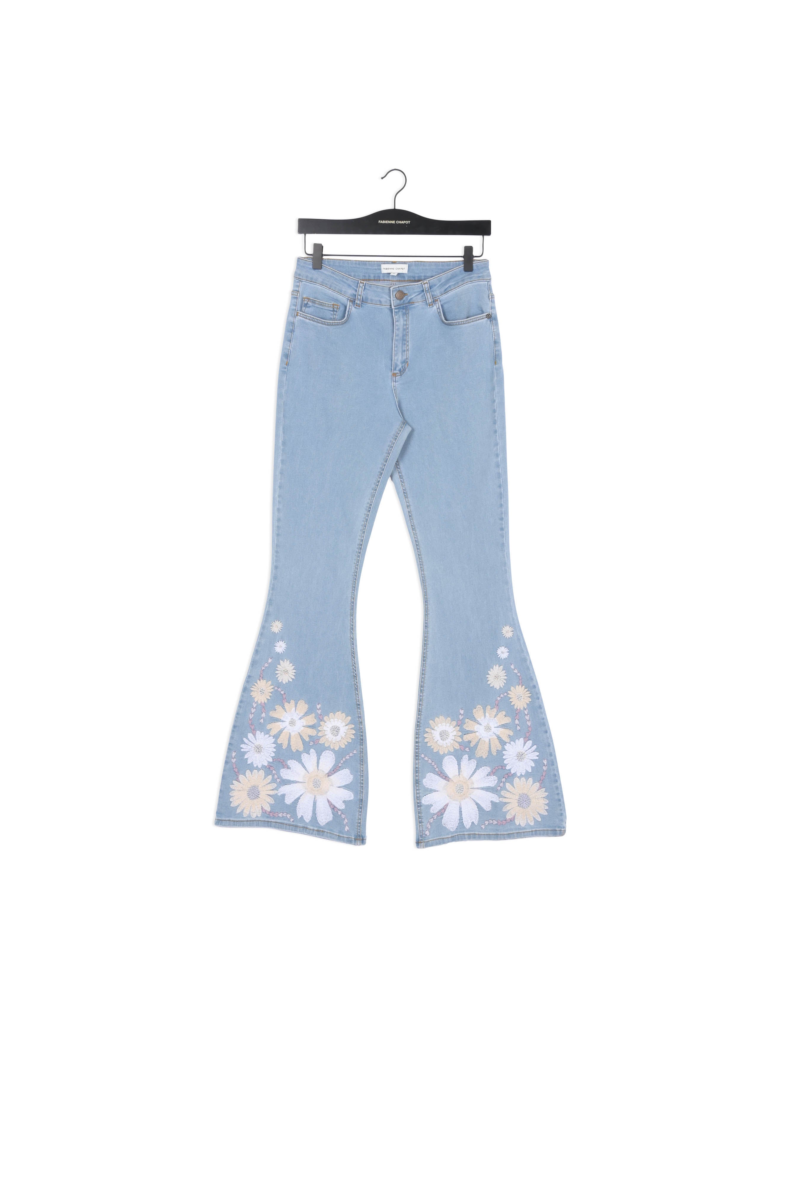Mid-rise trousers with the ultimate fit! Eva Extra Flare Trousers has a average waist height, extra wide legs from the knee and a button and zipper closure. These trousers are made of stretch denim and has beautiful embroidered hearts at bottom of the legs. The length of the trousers is 34 with an inseam of 86 cm. Note: The colours of the items in the video may vary slightly. -