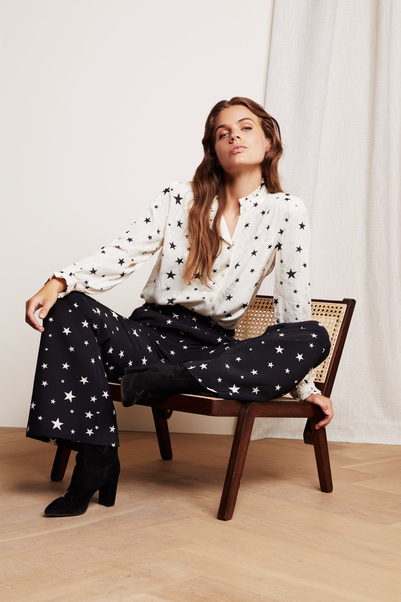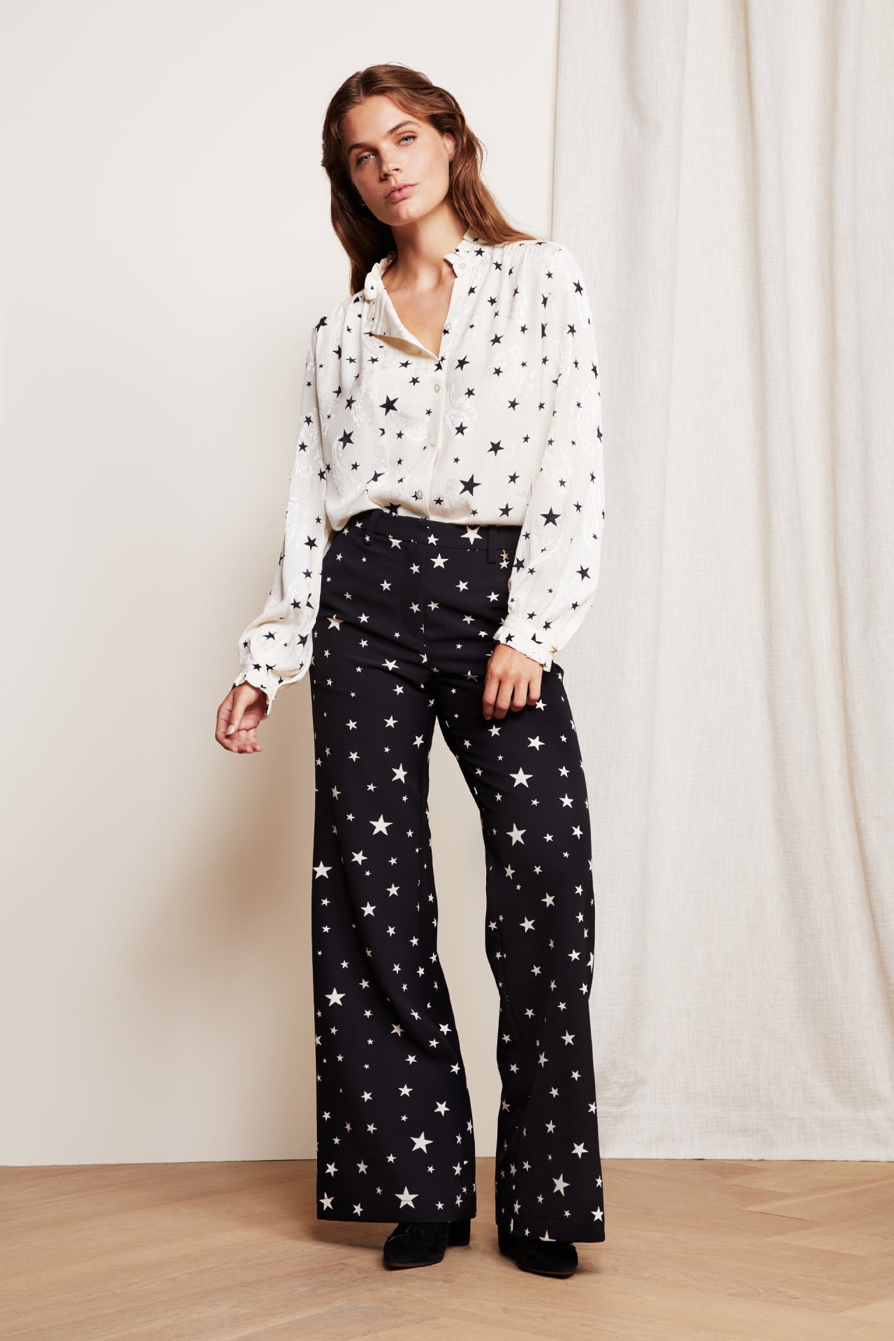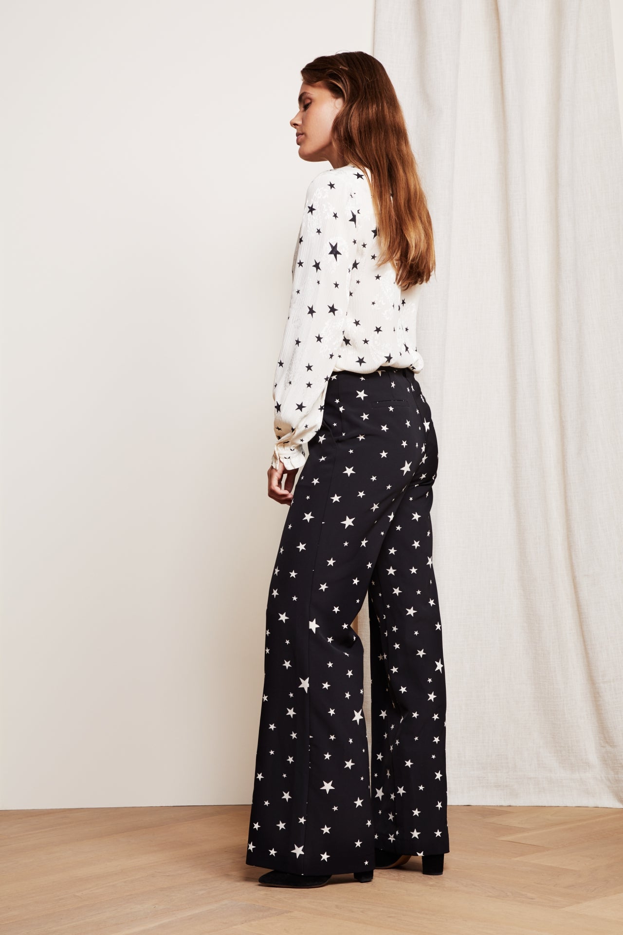 High-waisted trousers with a concealed button and zip fastening. Puck Trousers has extra long, wide legs.