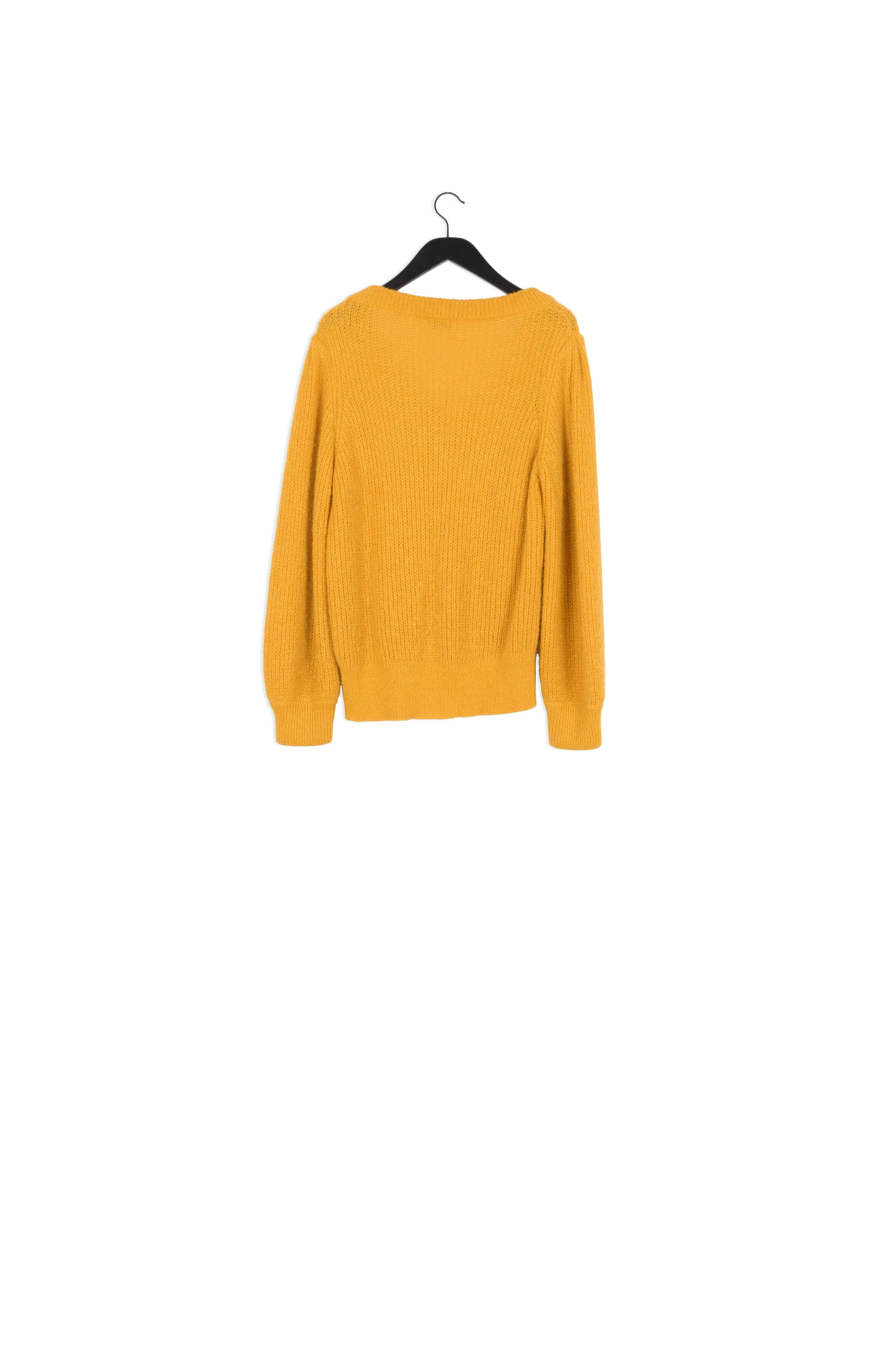 Knitted pullover with V-neck. Starry V-Neck Pullover has slightly puffed sleeves and a gold-coloured brooch on the chest. This pullover is made from a blend of, among other materials, alpaca wool.