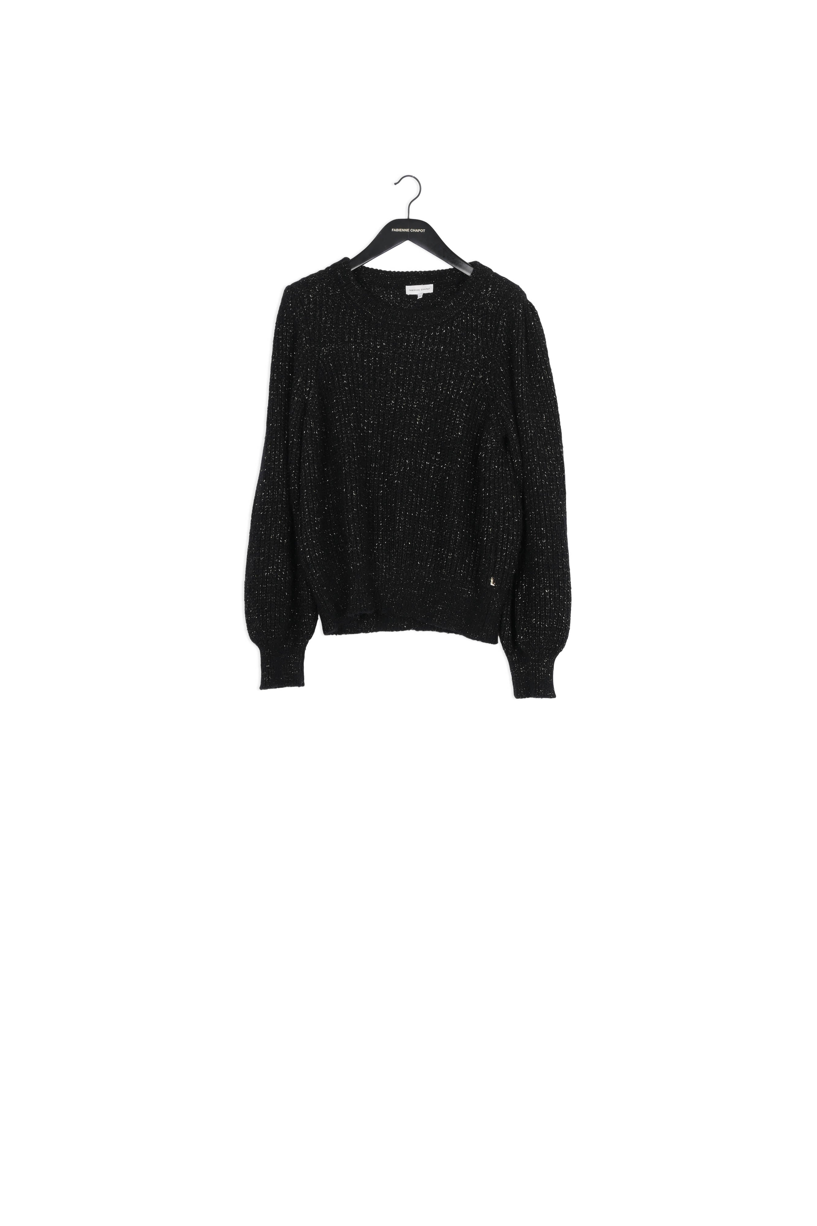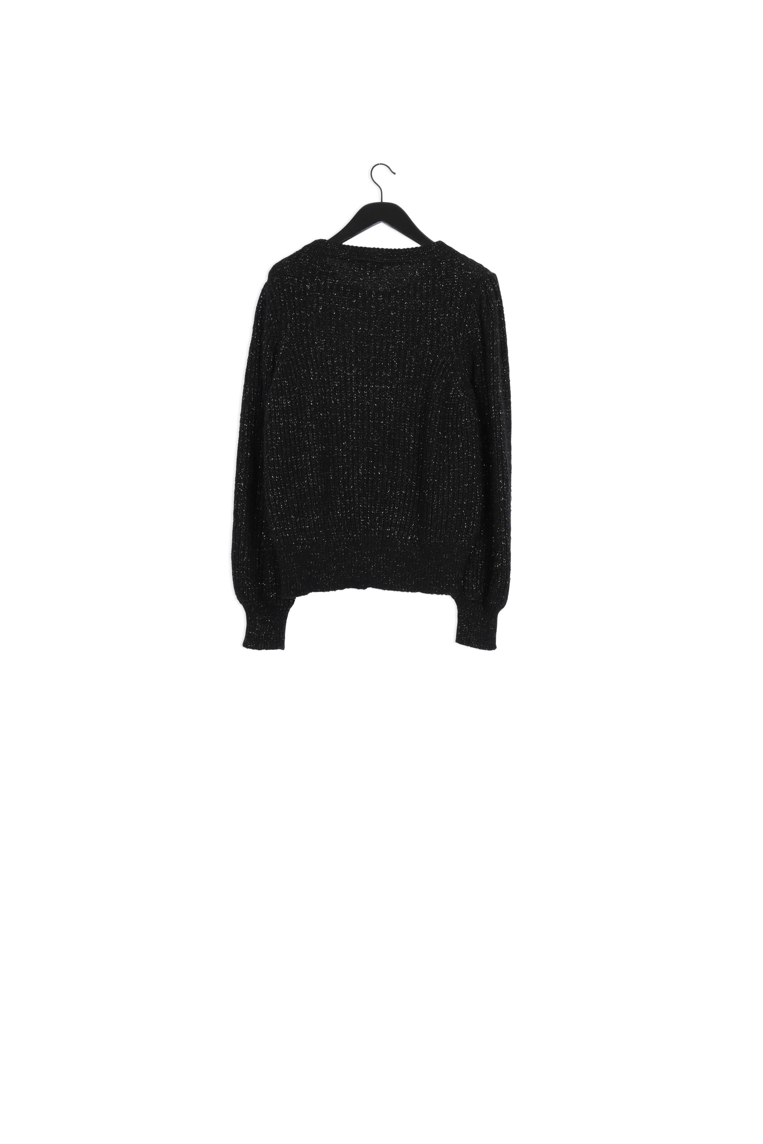 Knitted pullover with round neck. Starry Lurex pullover has puffed sleeves, a gold-coloured brooch on the chest and gold-tone lurex thread knitted along through the fabric. This pullover is made from a blend of, among other materials, alpaca wool. -
