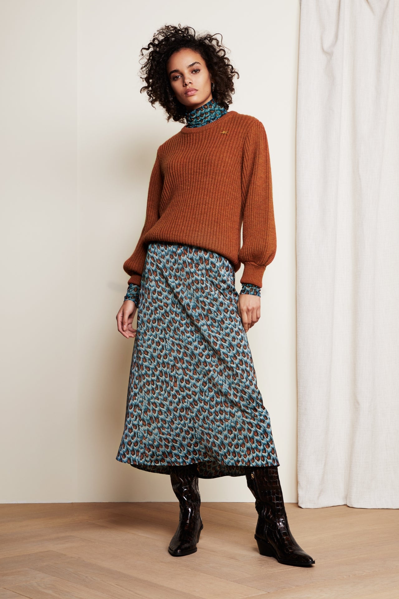 Knitted sweater with puffed sleeves and long cuffs. Marianne Pullover has a gold-coloured brooch on the left side chest. -
