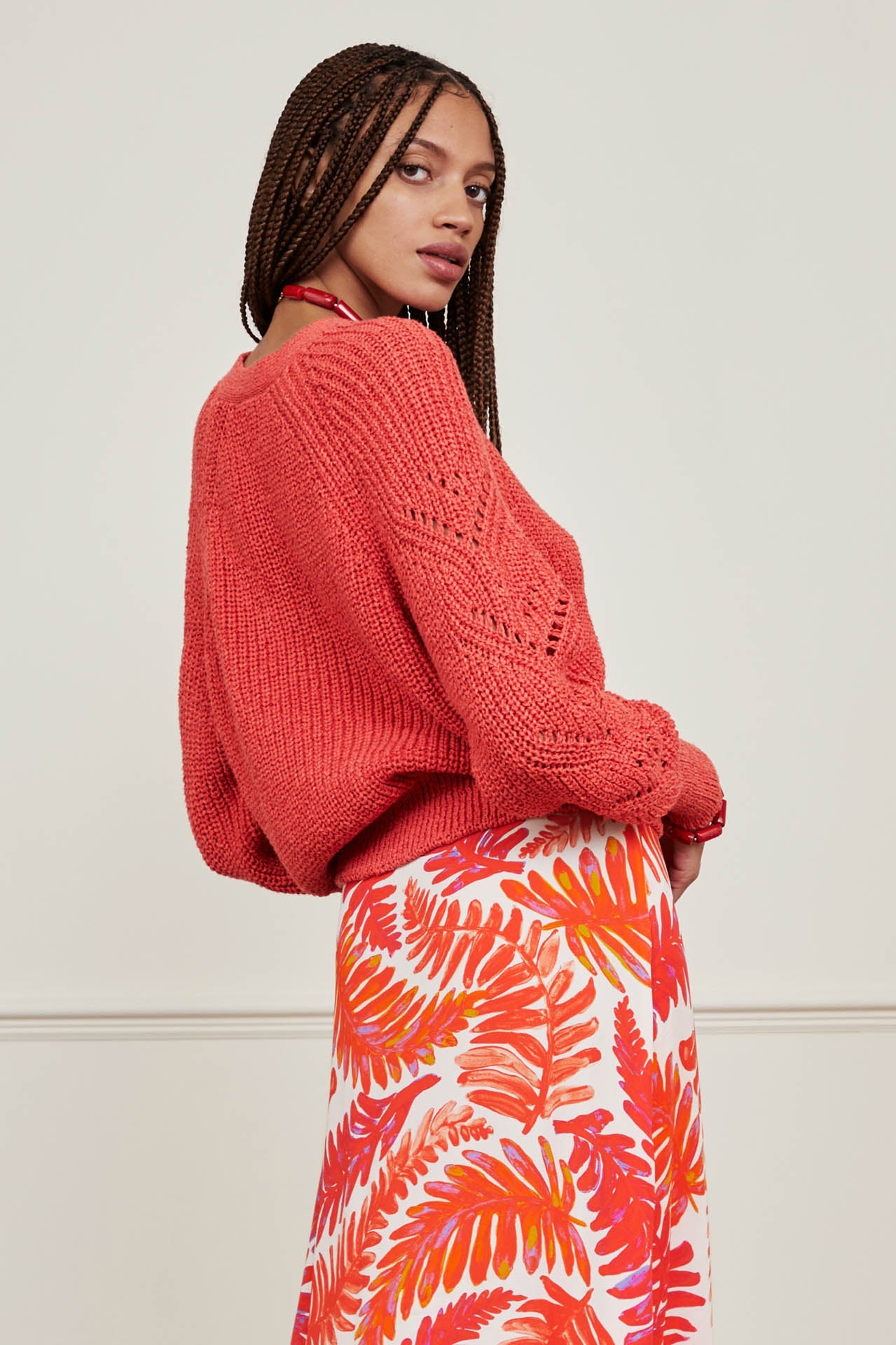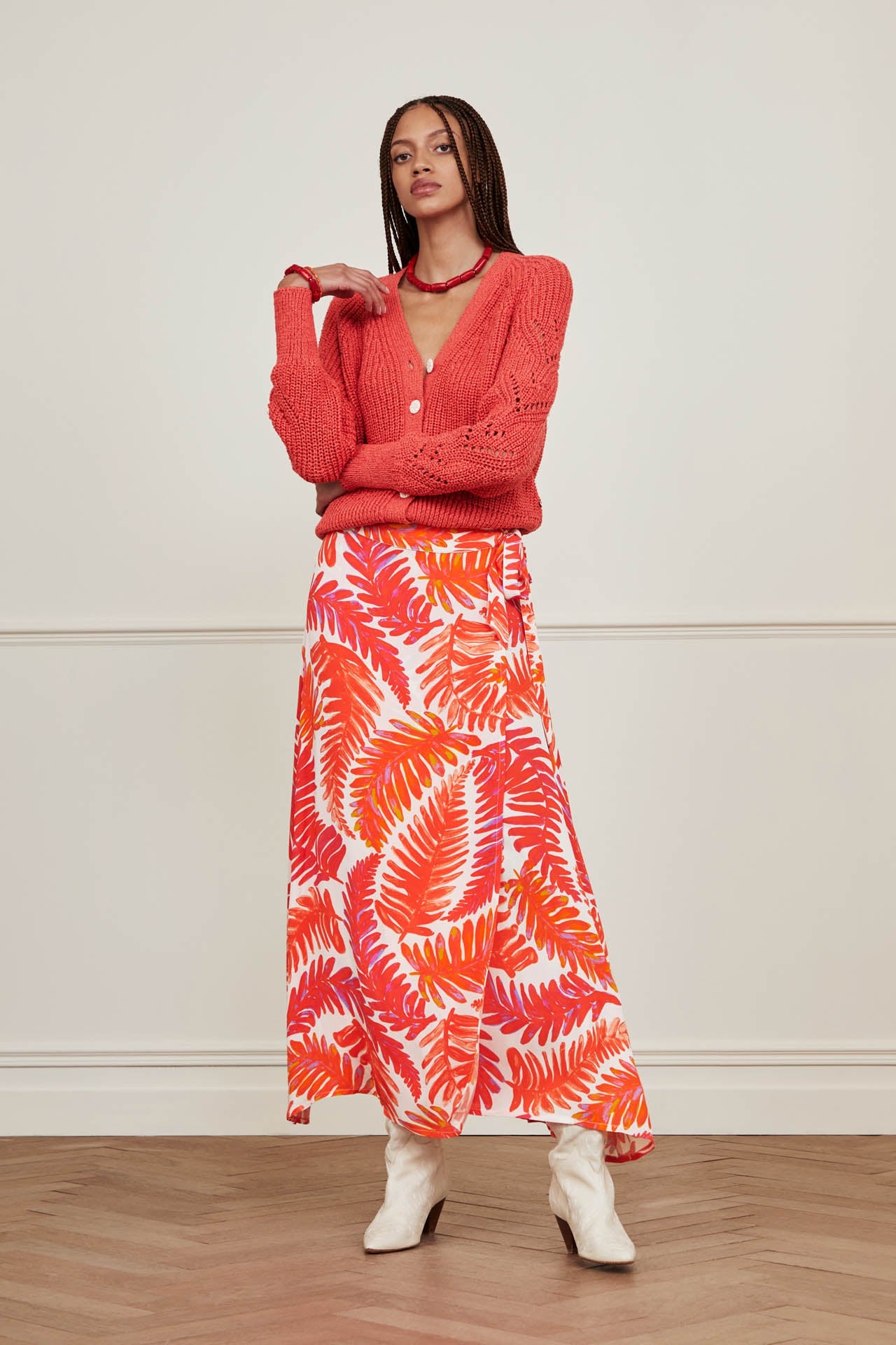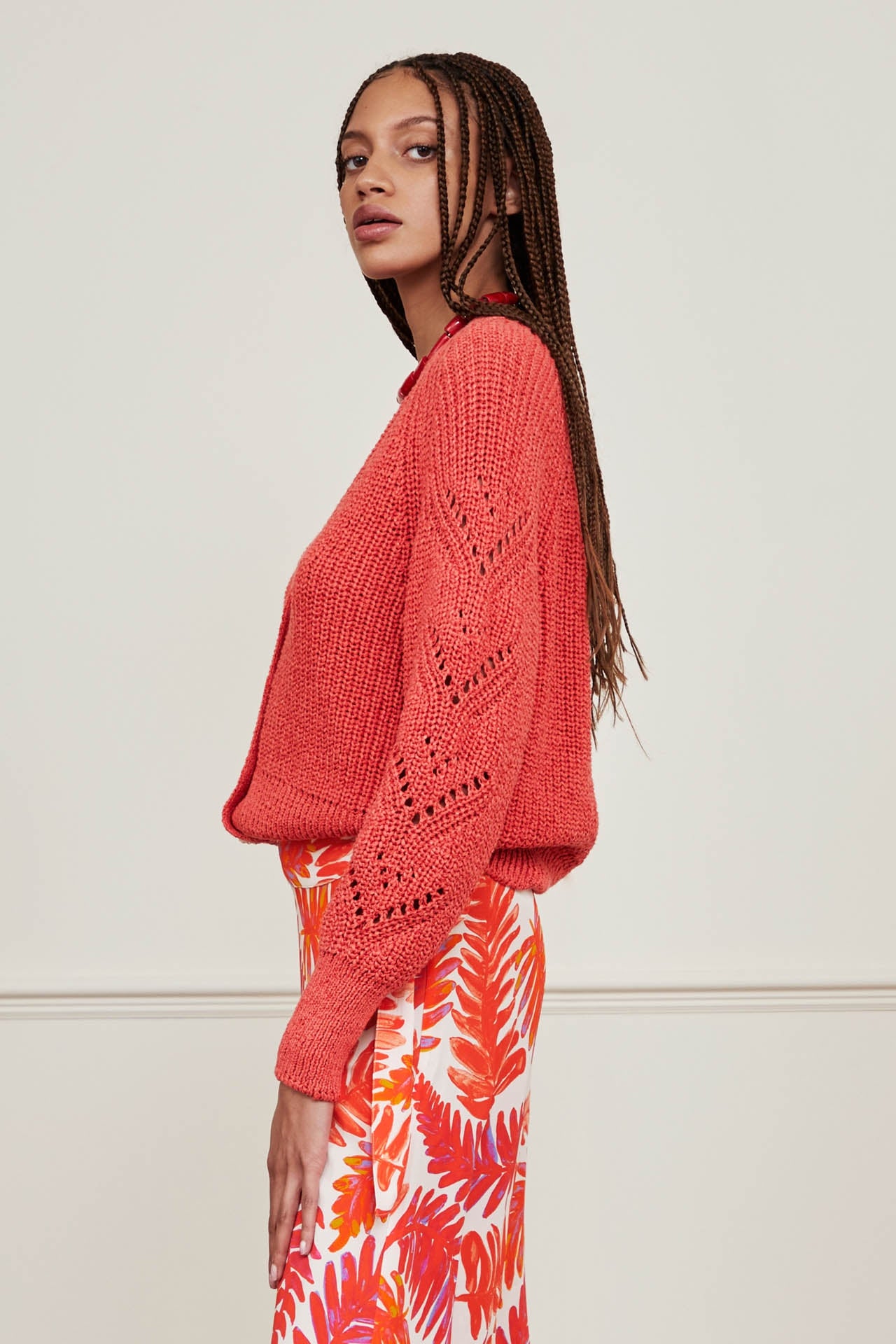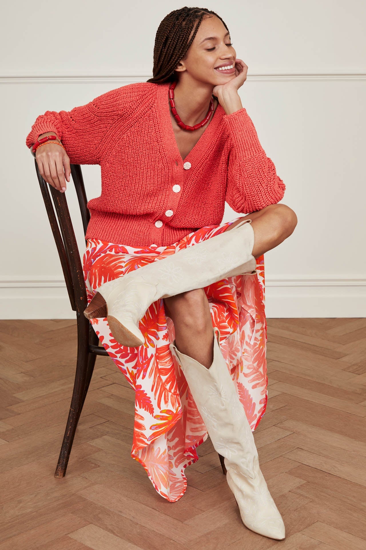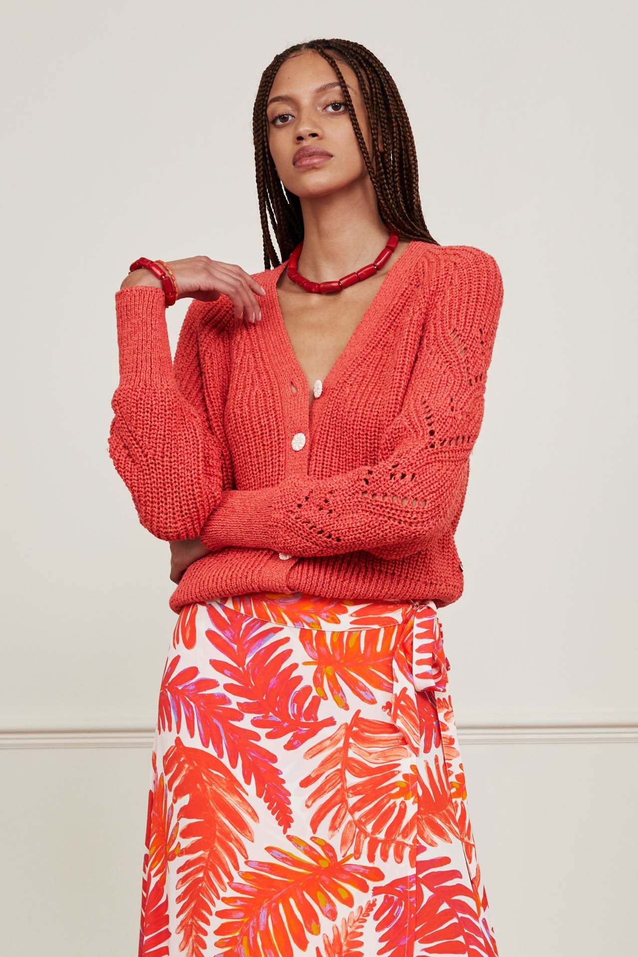 Knitted cardigan with a V-neck. Confetti Cardigan has a button closure with fancy white buttons.